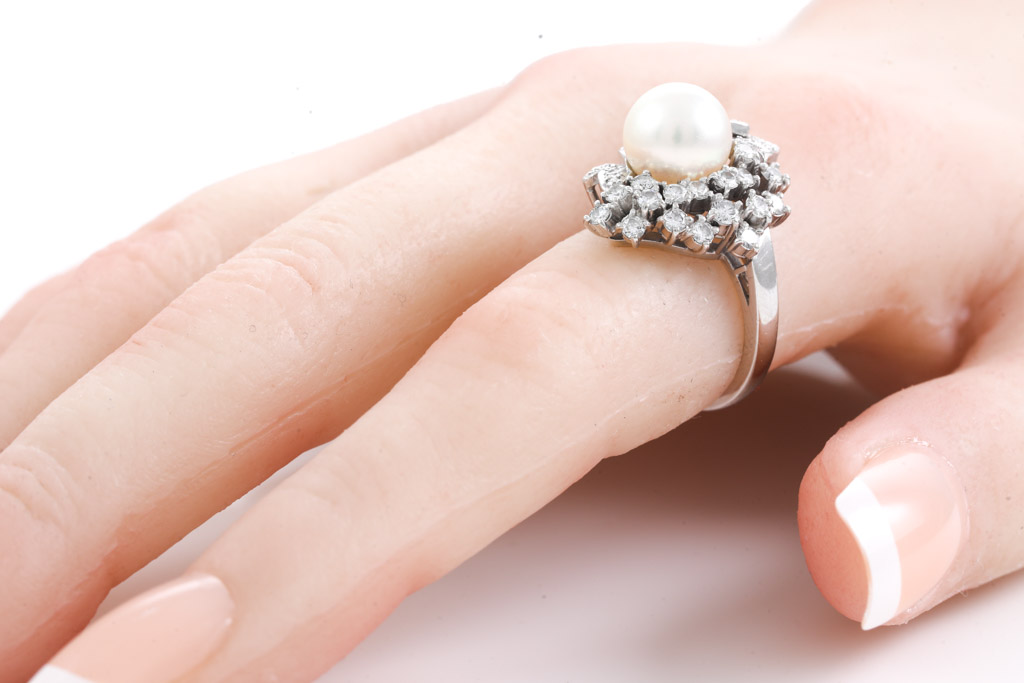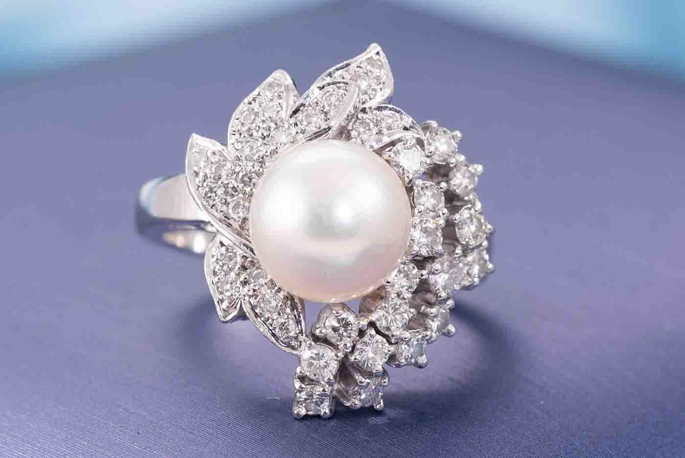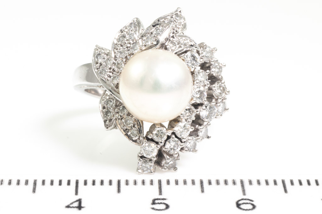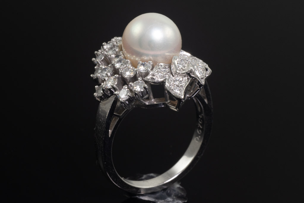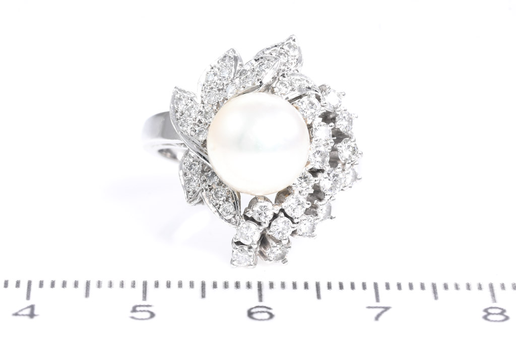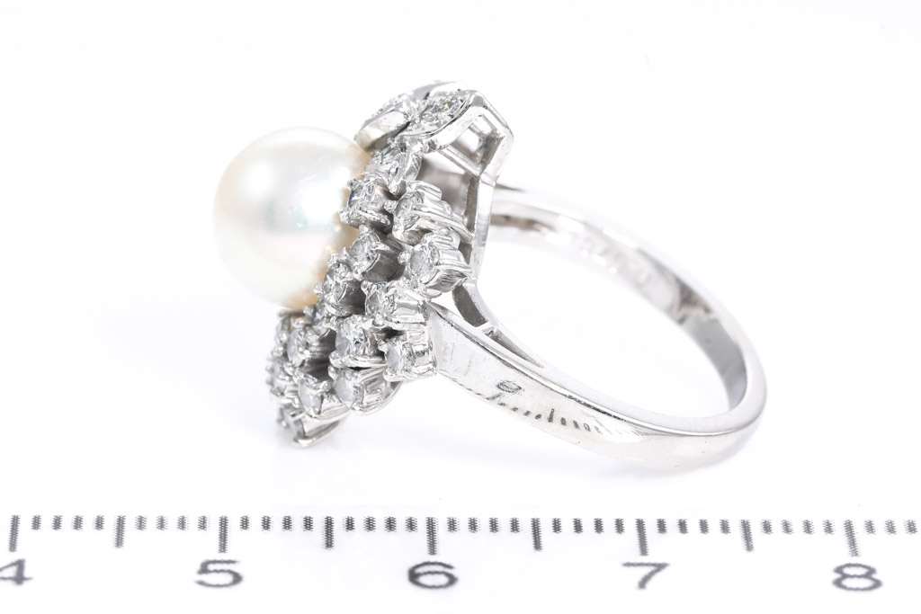 Pearl and Diamond ring with 9.0mm South Sea Pearl of 9mm and round Diamonds totalling 0.67cts (Estimated grading: H SI). Ring size L. Platinum. Weight: 10.1g.