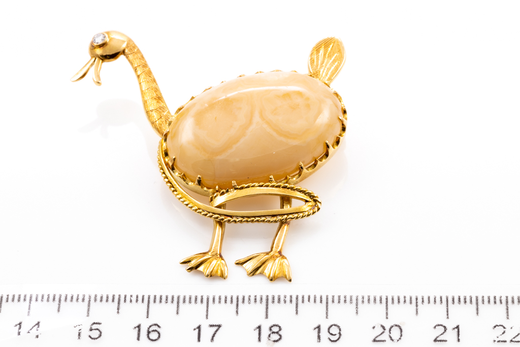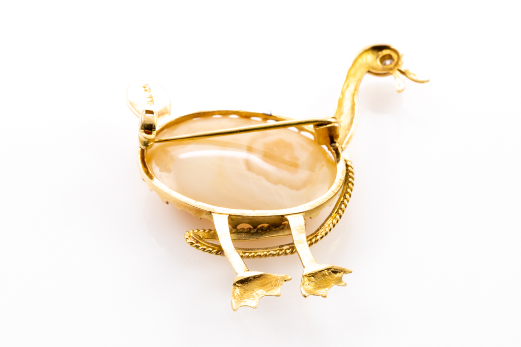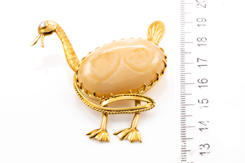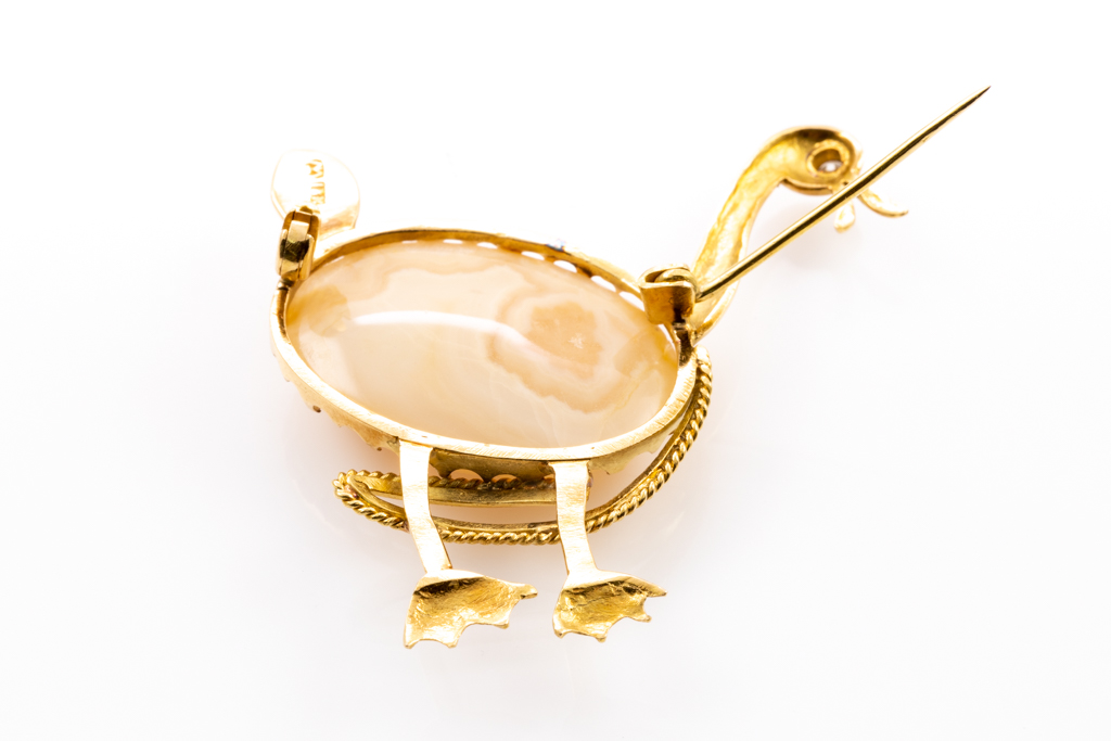 Duck design brooch with oval cabochon cut Agate (size 3.20cm x 2.20cm x 0.85cm) and round cut Diamond Of approximately 0.05ct. 18ct yellow gold. Weight: 18.7g. (Pre-owned)