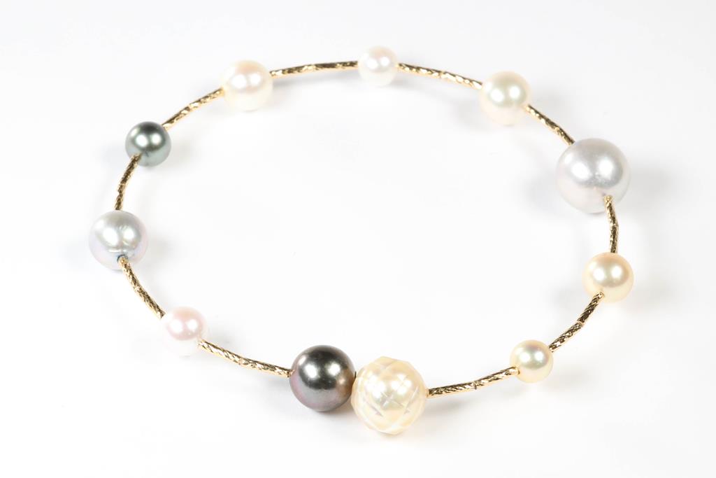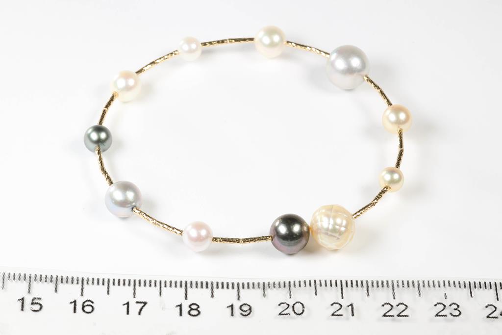 Pearl bangle with Akoya Pearls of 9.5mm-5.0mm and South Sea Pearl of 10.mm-9.0mm. Includes one faceted pearl. 18ct yellow gold. Circumference: 16.5cm. Weight: 6.5g. (Pre-owned)
