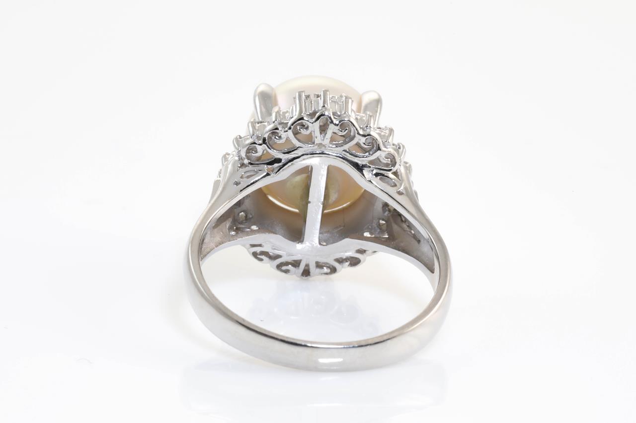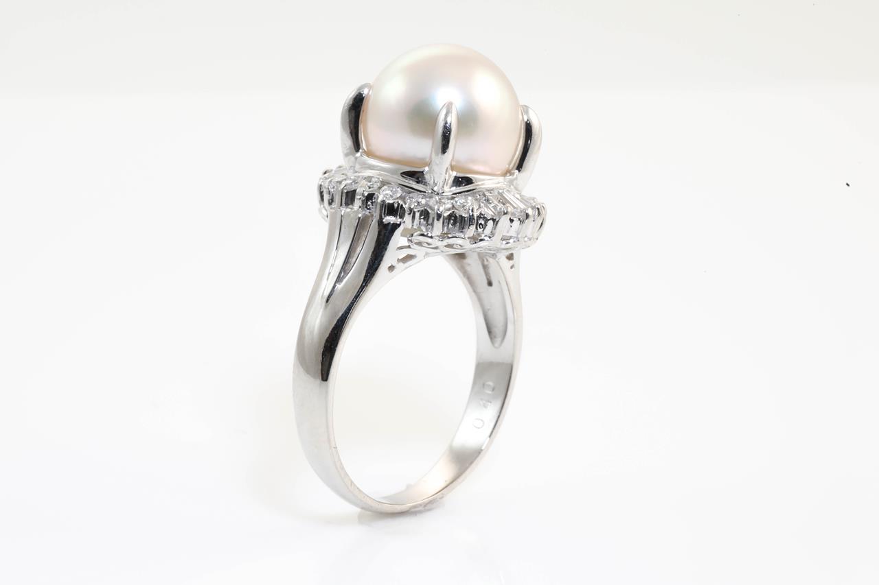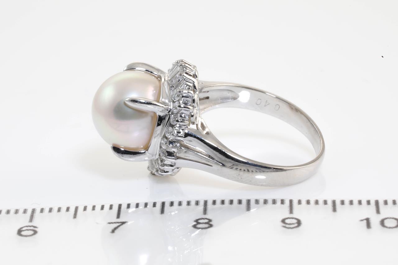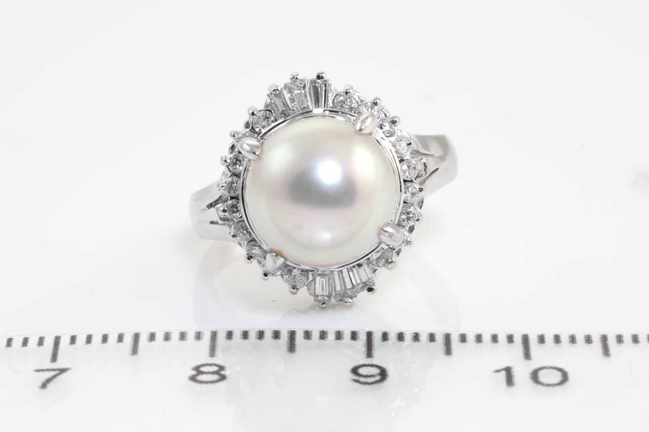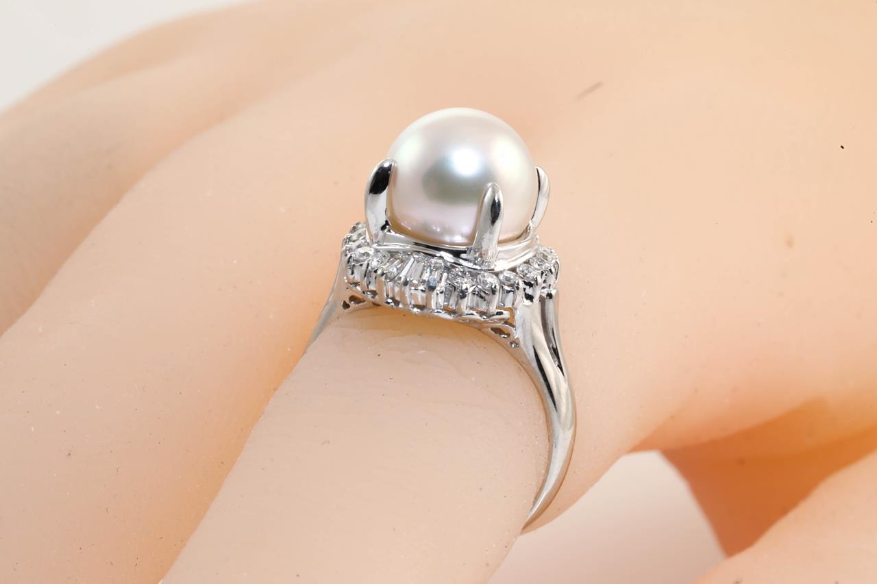Pearl and Diamond ring with and Akoya Pearl of 10.0mm and Diamonds totalling 0.40cts (Estimated grading: G VS). Platinum. Ring size J. Weight: 7.9g (Pre-owned)