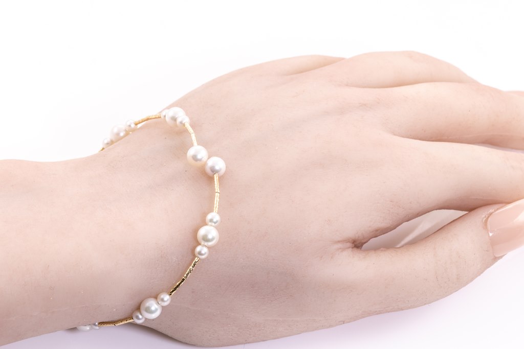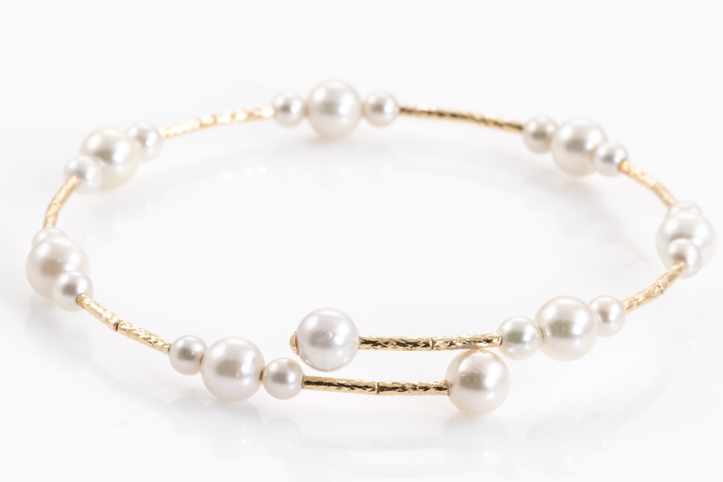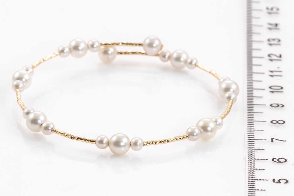 Akoya Pearl Bangle with 23 Akoya Pearls of 3.5-5.5mm. 18ct yellow gold. Length: 19cm. Weight: 3.5g. (Pre-owned)