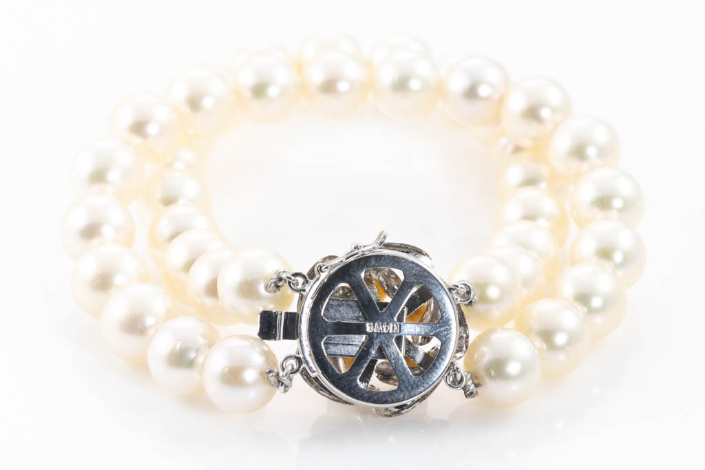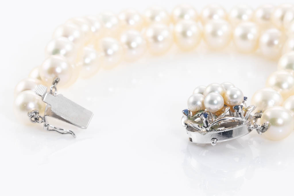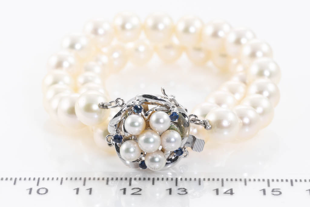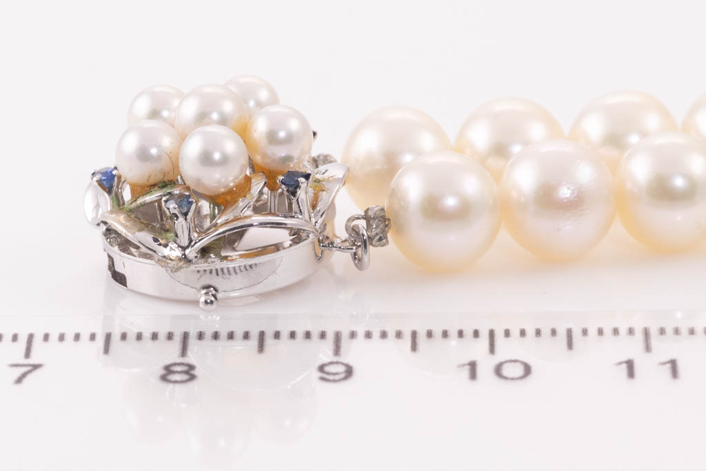 Pearl bracelet with Akoya Pearls of 4.6mm - 8.2mm and round Blue Sapphires totalling approximately 0.20cts and seed pearls ? TBA set on 14ct white gold clasp. Length: 17cm. Weight: 33.0g. (Pre-owned)