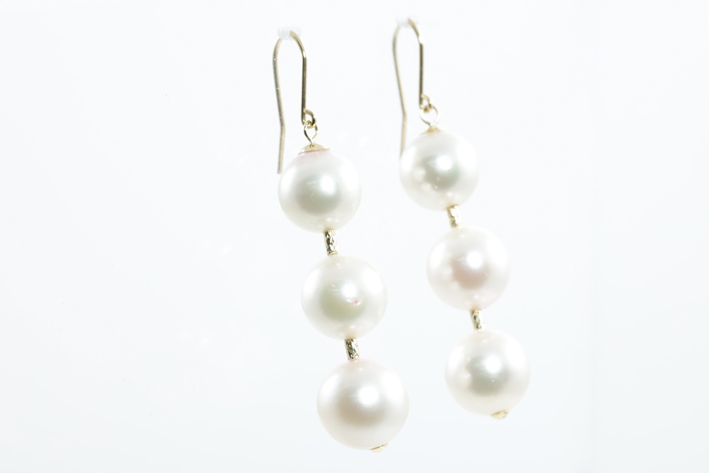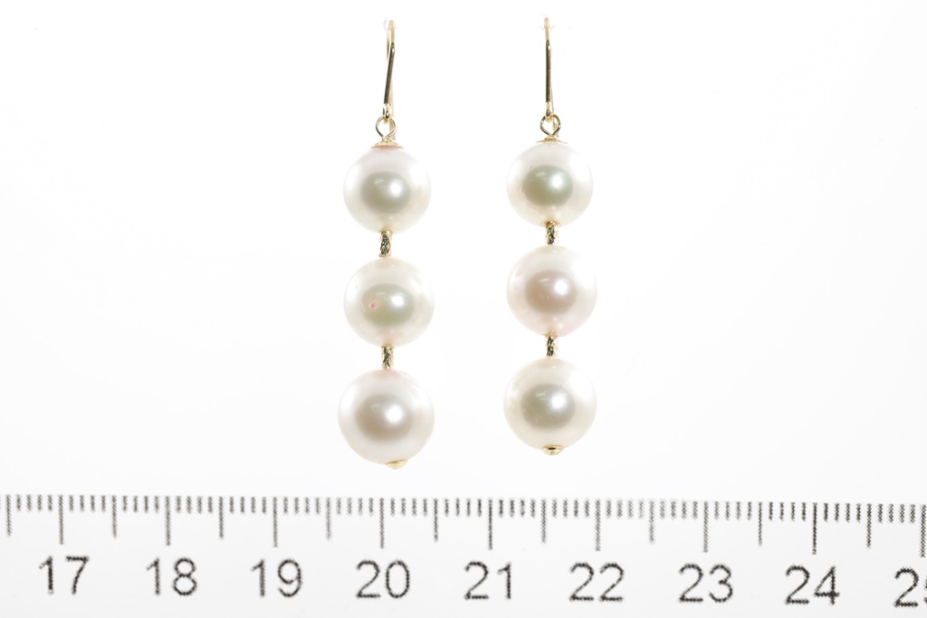 Pearl shepherd hook, drop earrings with Akoya Pearls of 9.0mm-7.5mm. 18ct yellow gold. Weight: 5.2g. (Pre-owned)