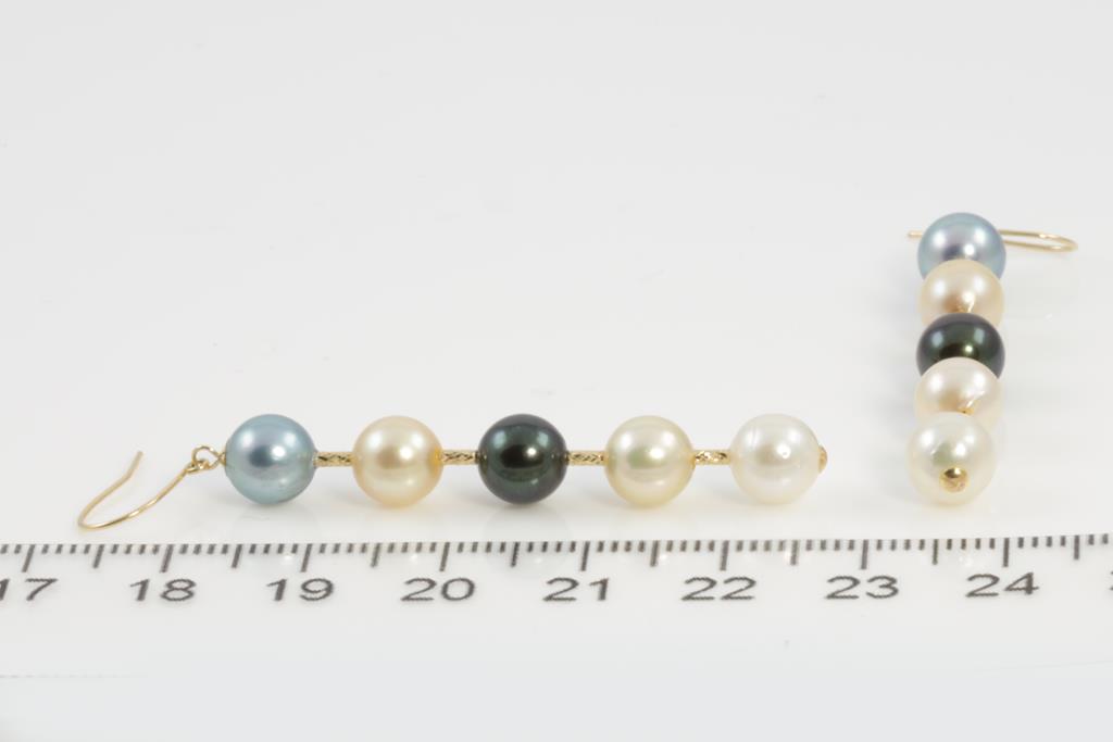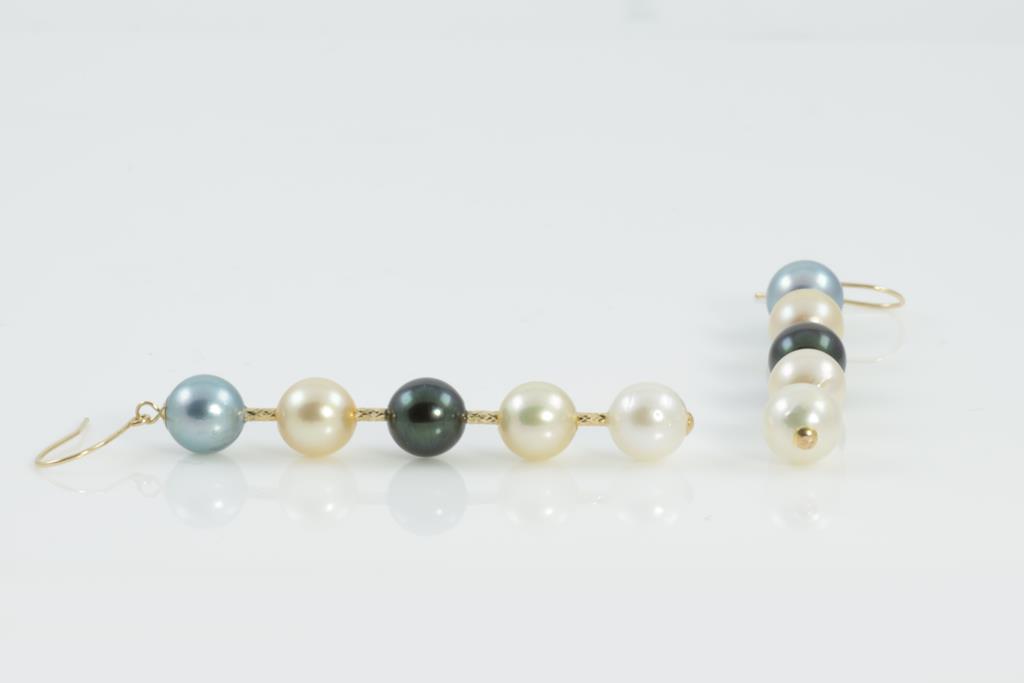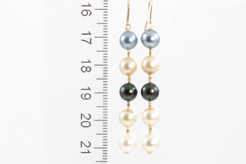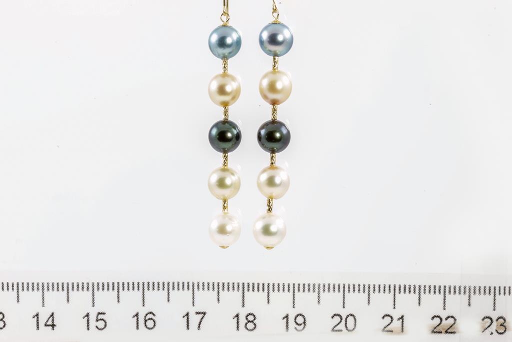 Pearl drop shepherds hook earrings with mixed colour Akoya Pearls of 6.5mm - 7mm. 18ct yellow gold. Weight: 4.5g (As New)