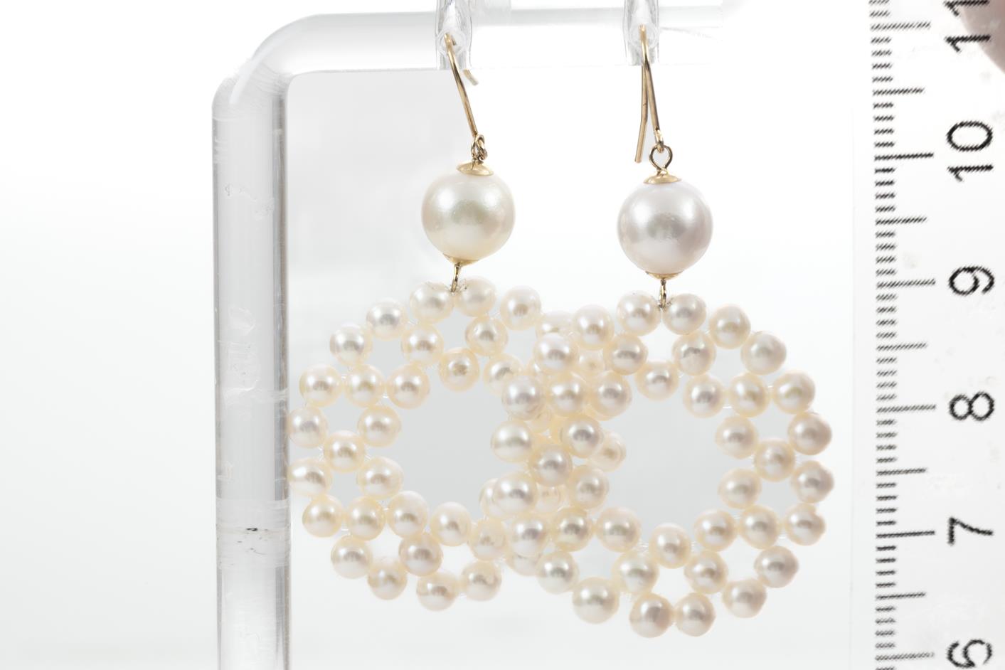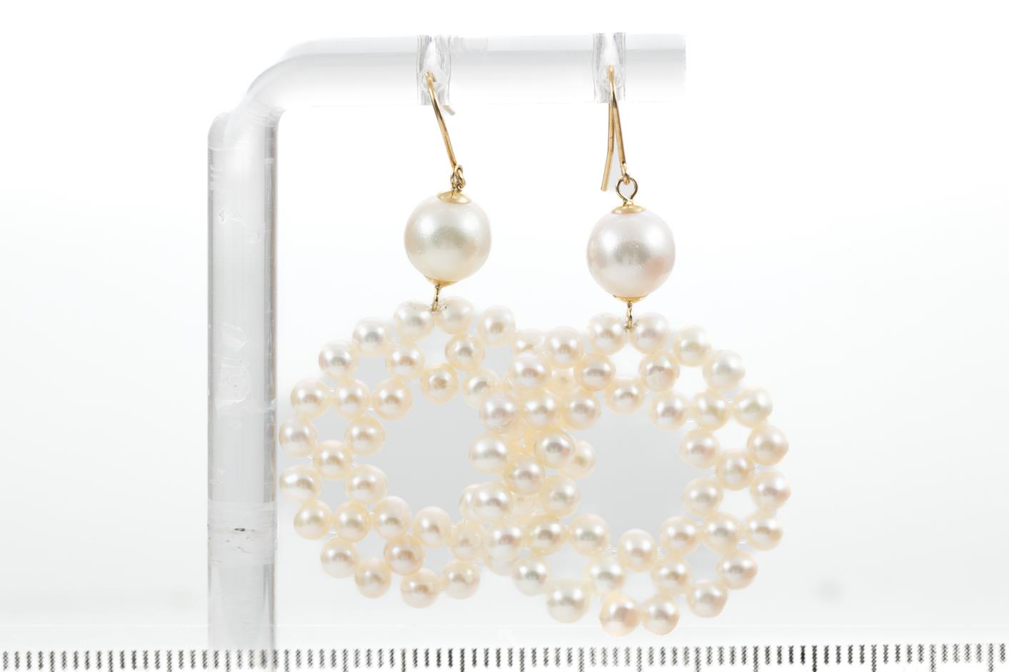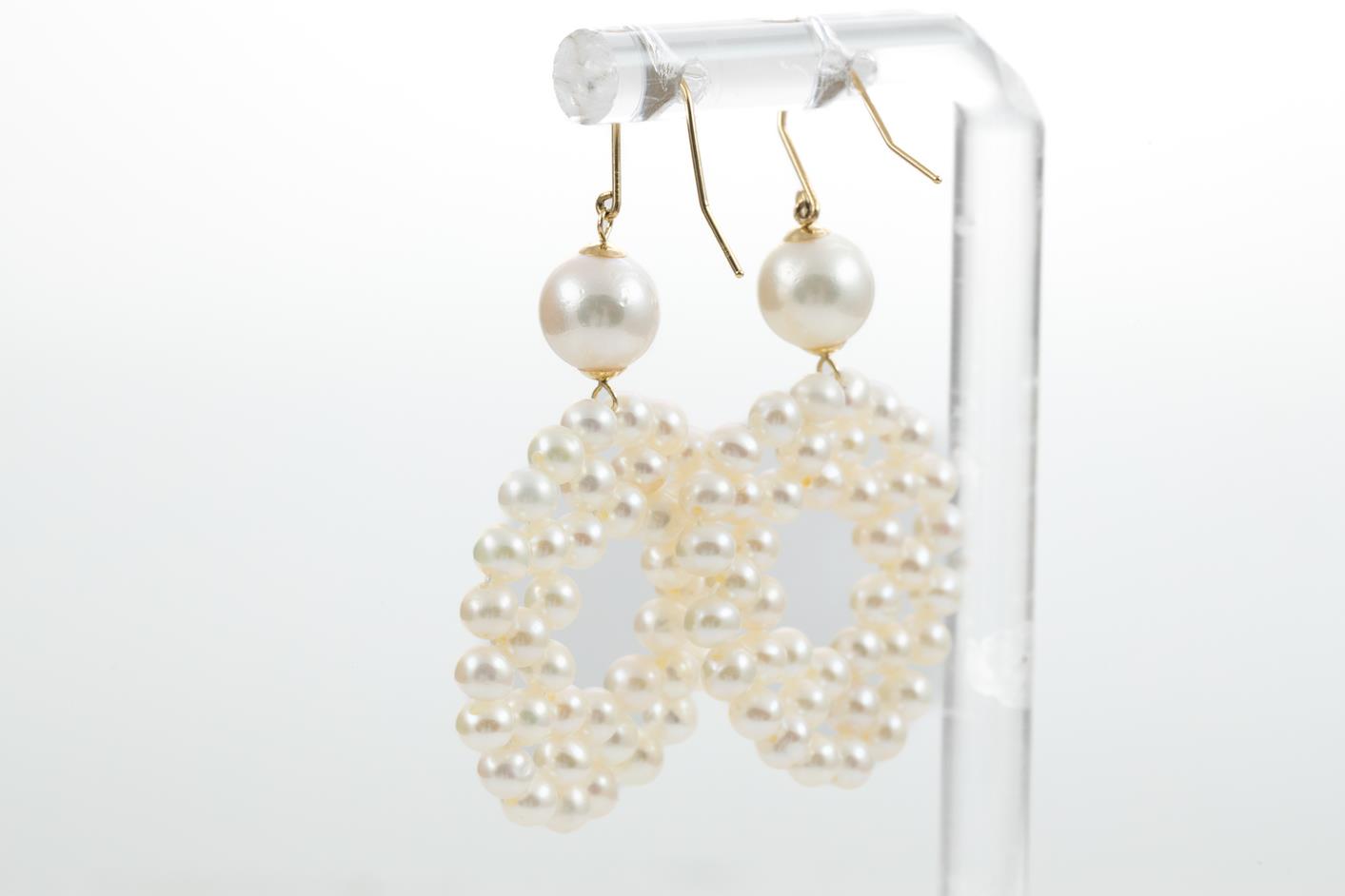 Akoya Pearl drop earrings with round Akoya Pearl of 7.5mm and Akoya seed pearls of 3.5mm. 18ct yellow gold. Weight: 6.6g. (Pre-owned)