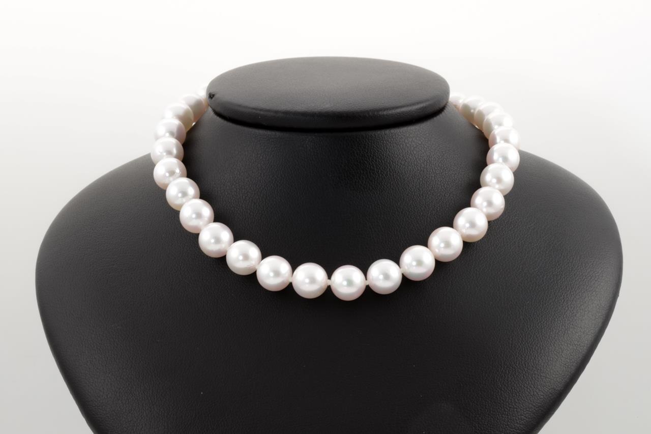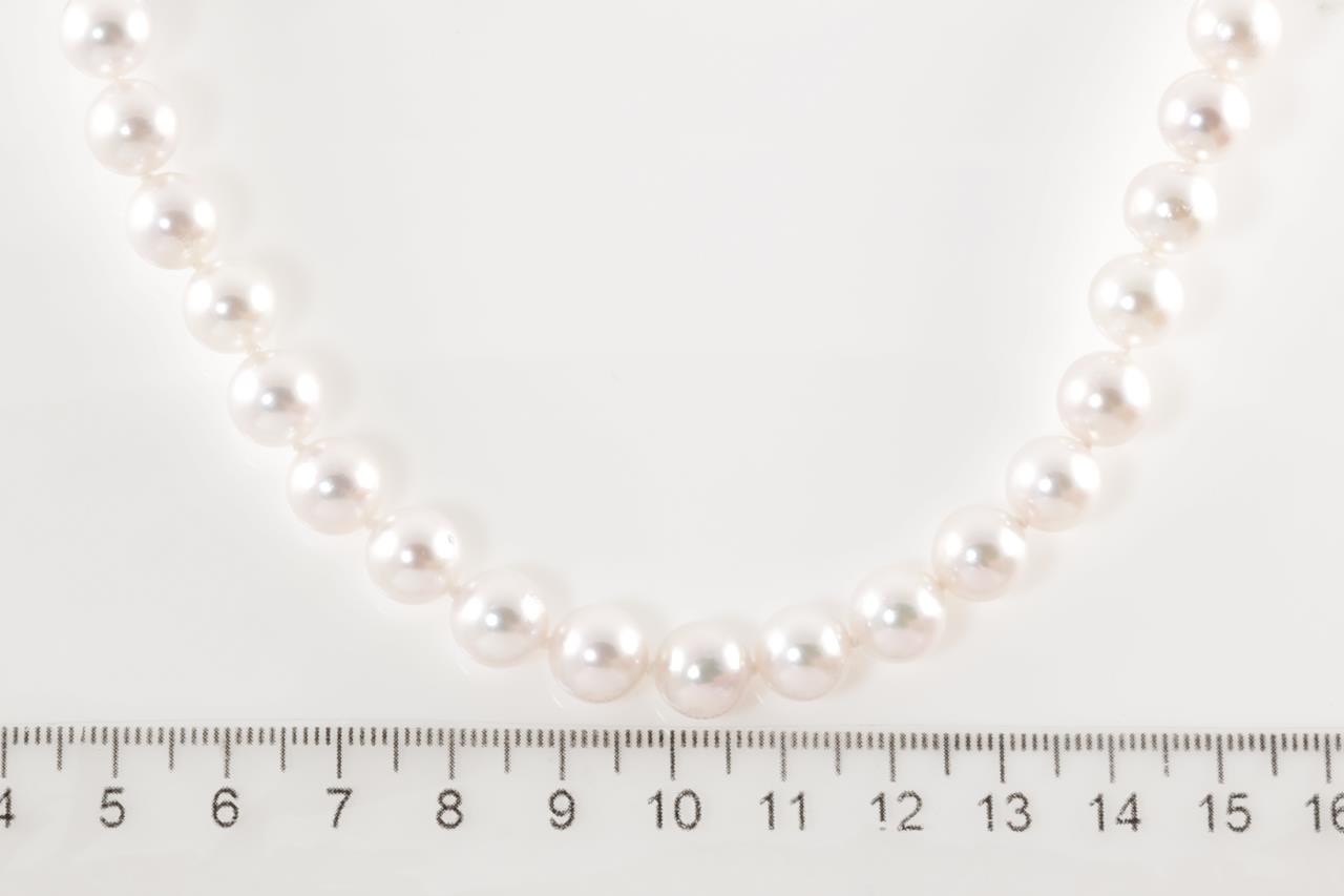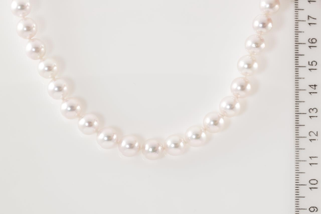 Pearl necklace with Akoya Pearls of 8.5mm-8.8mm. 14ct white gold clasp. Length: 46cm. Weight: 46.3g. (As new)