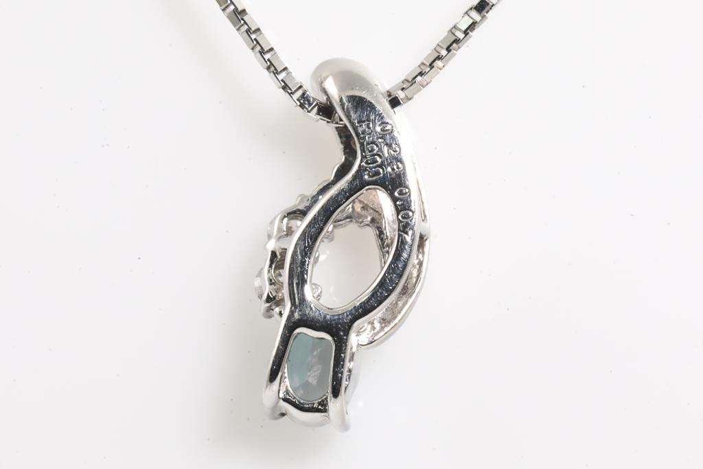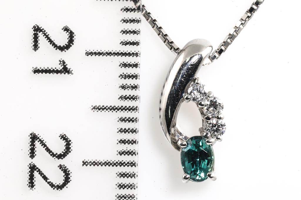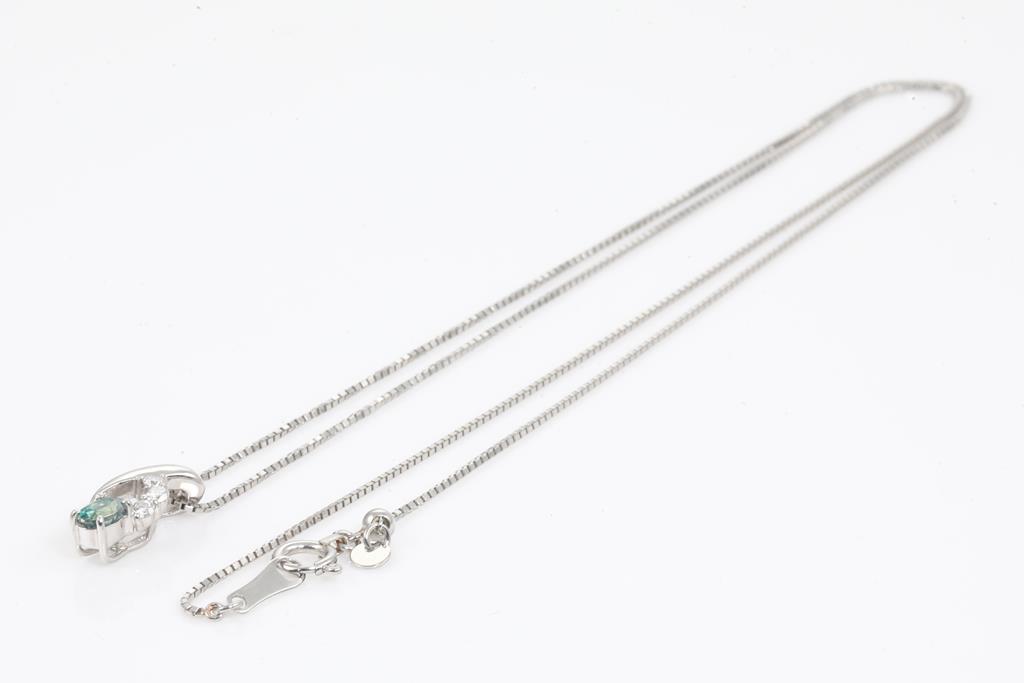 Alexandrite and Diamond pendant with Alexandrite of 0.23ct (colour change from blueish green to pink) and 3 round Diamonds totalling 0.07cts. Platinum with 45cm adjustable chain. Weight: 3.5g (Pre-owned)