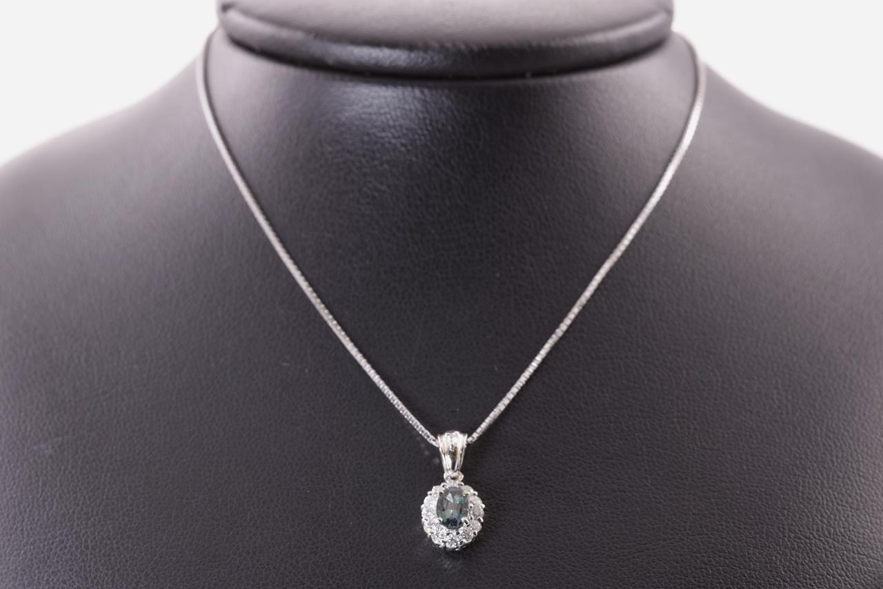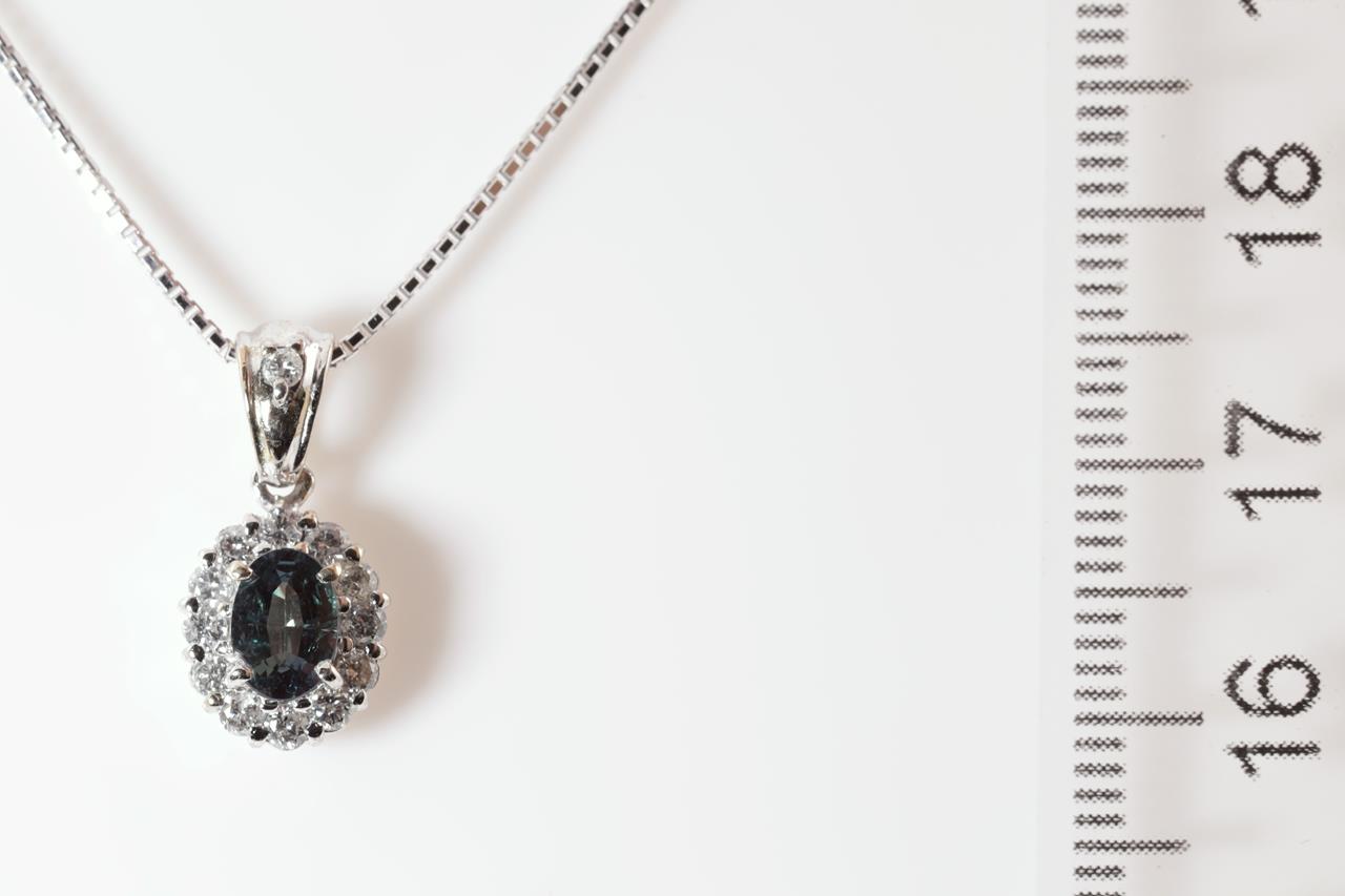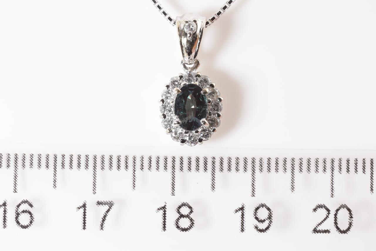 Alexandrite and Diamond pendant with centre oval shape Alexandrite of 0.41ct (colour change from blueish green to pink) and surrounding Diamonds totalling 0.29cts. 18ct white gold with 45cm adjustable chain. Weight: 4.2g. (Pre-owned)