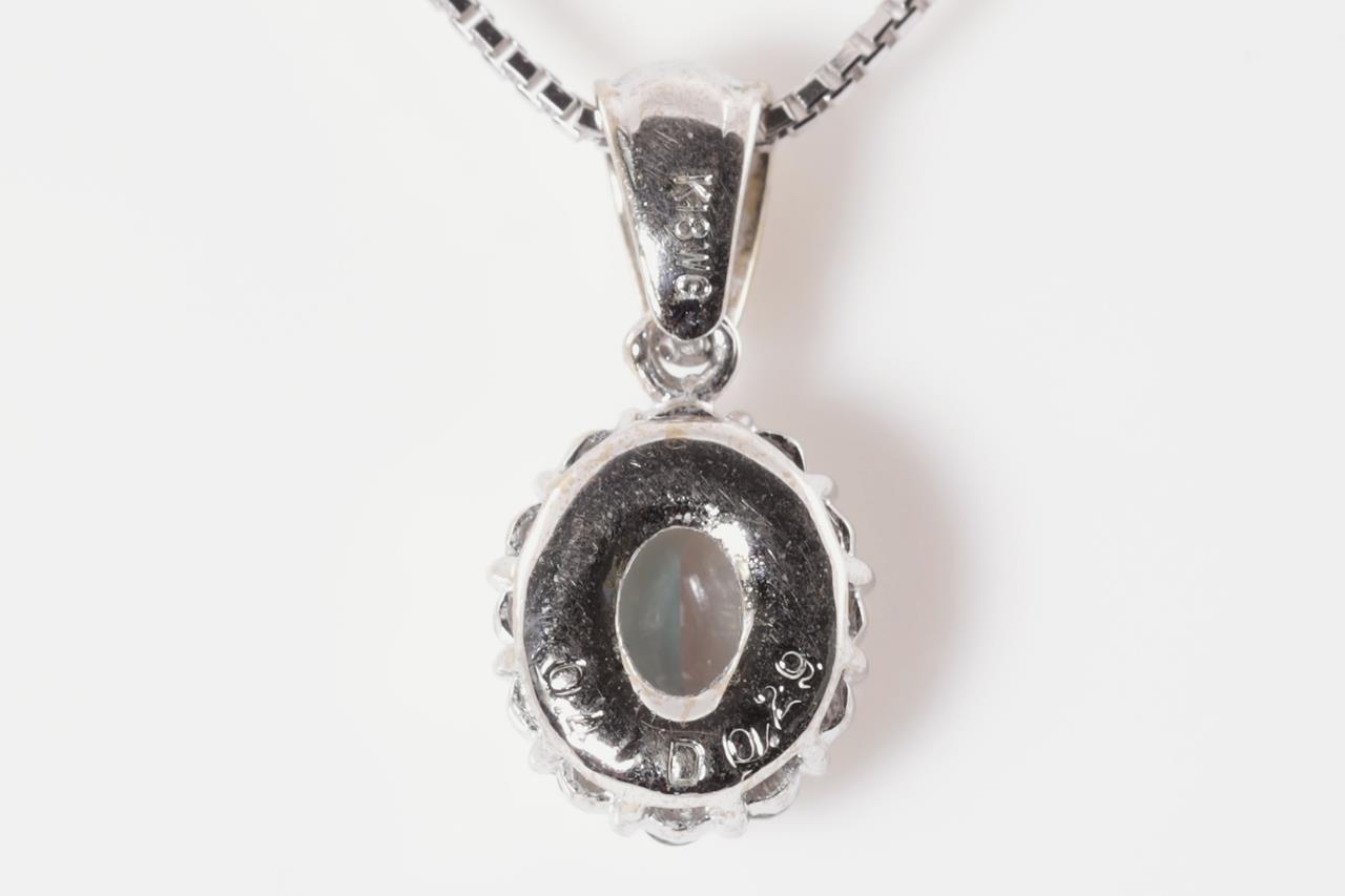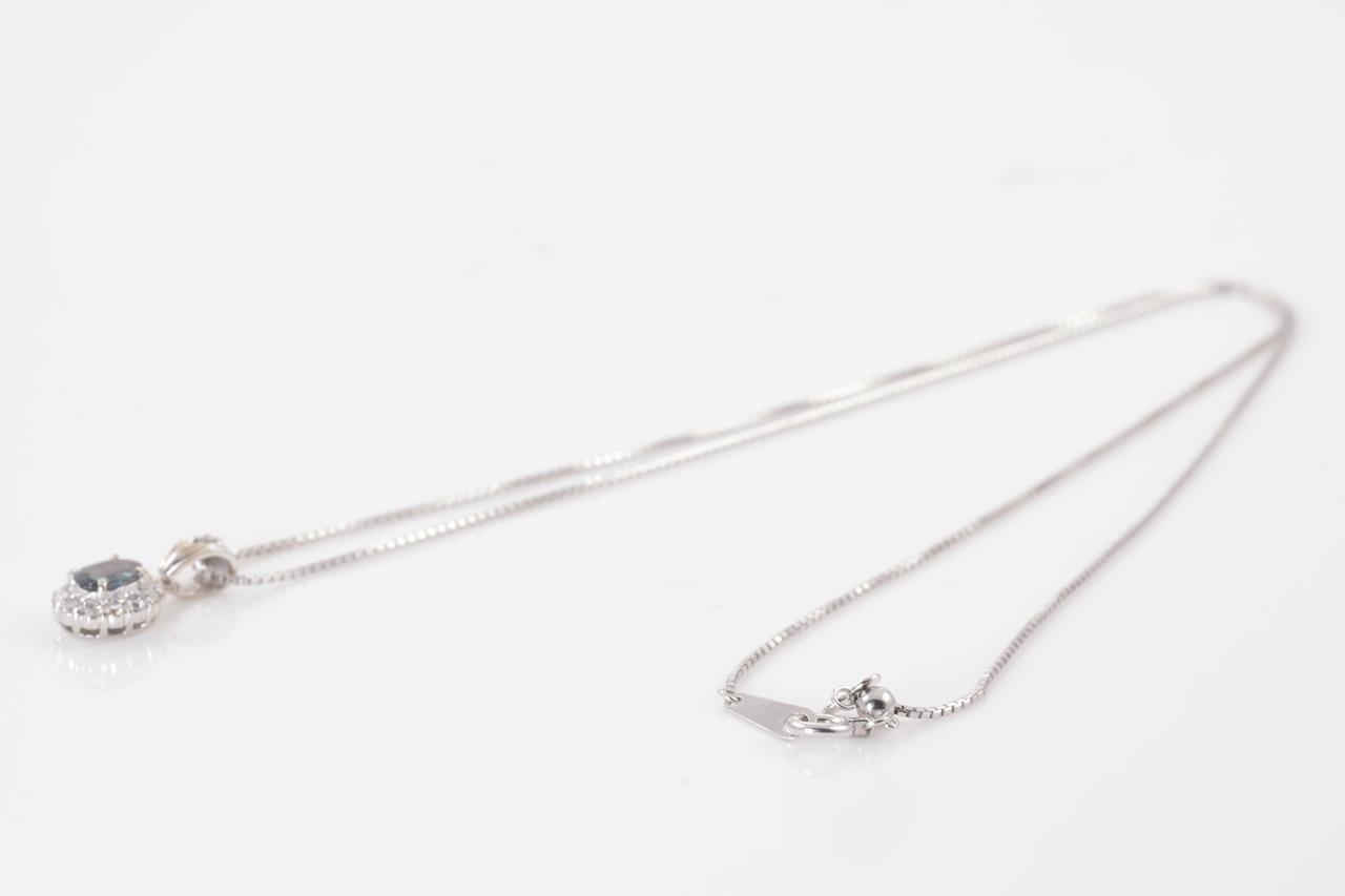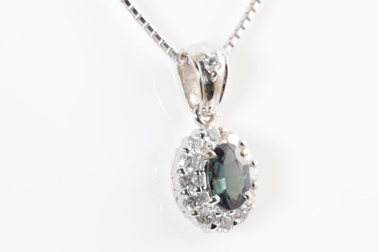 Alexandrite and Diamond pendant with centre oval shape Alexandrite of 0.41ct (colour change from blueish green to pink) and surrounding Diamonds totalling 0.29cts. 18ct white gold with 45cm adjustable chain. Weight: 4.2g. (Pre-owned)