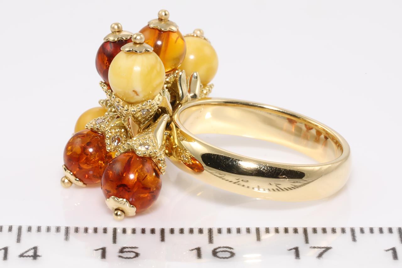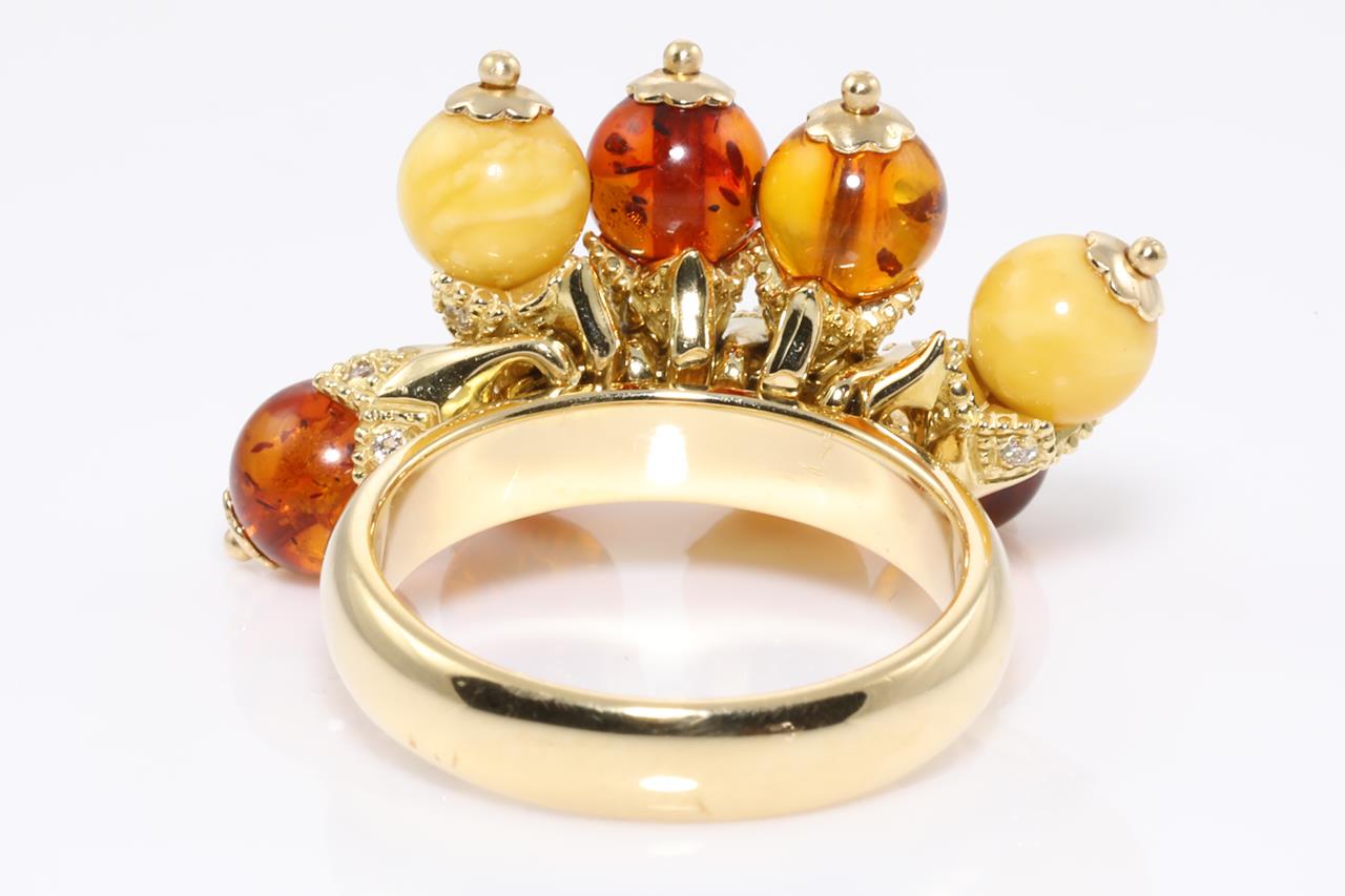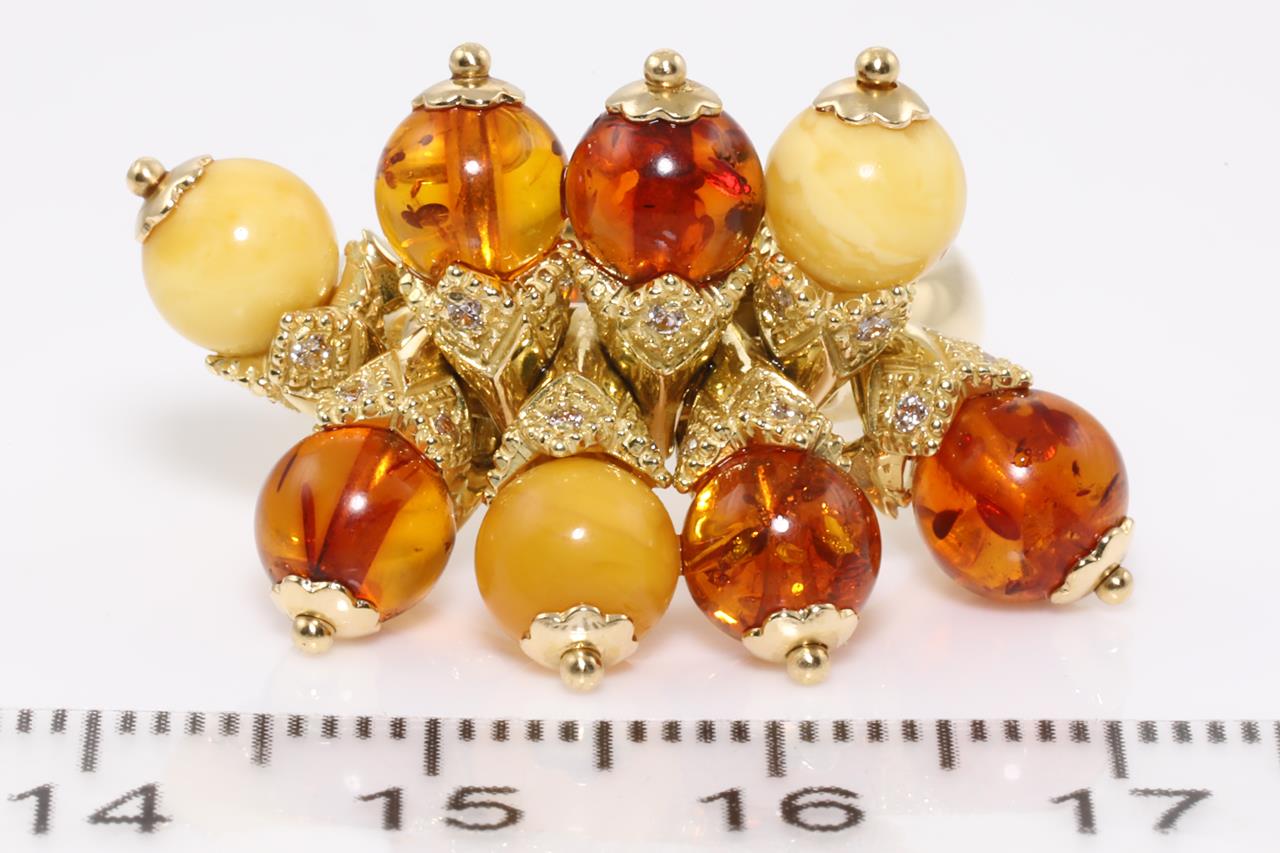 Amber ring with Butterscotch Amber and Amber beads set with 24 diamonds totalling approximately 0.08cts. 18ct yellow gold. Ring size O1/2. Weight 13.1g. (Pre-owned).
