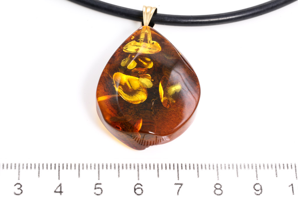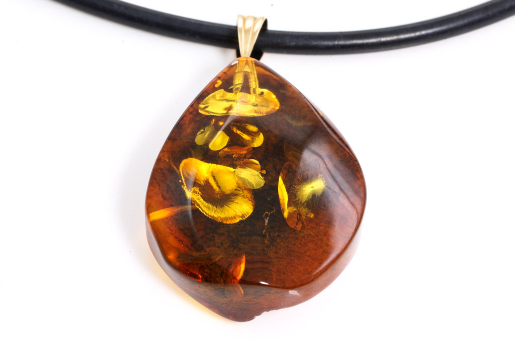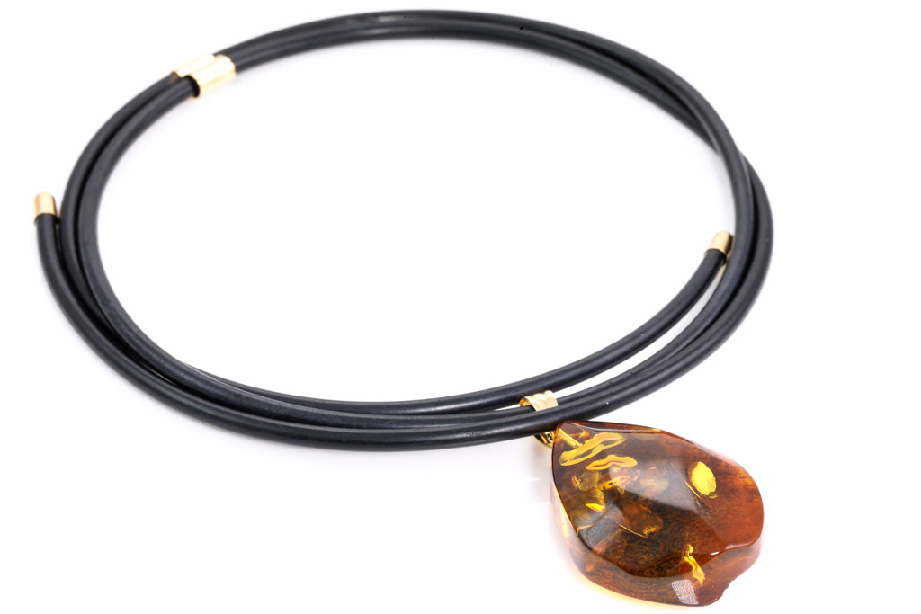 Amber pendant with Amber of approximately 36x27x12 mm. 18ct yellow gold with 60cm adjustable rubber cord. Weight: 24.5g. (Pre-owned)