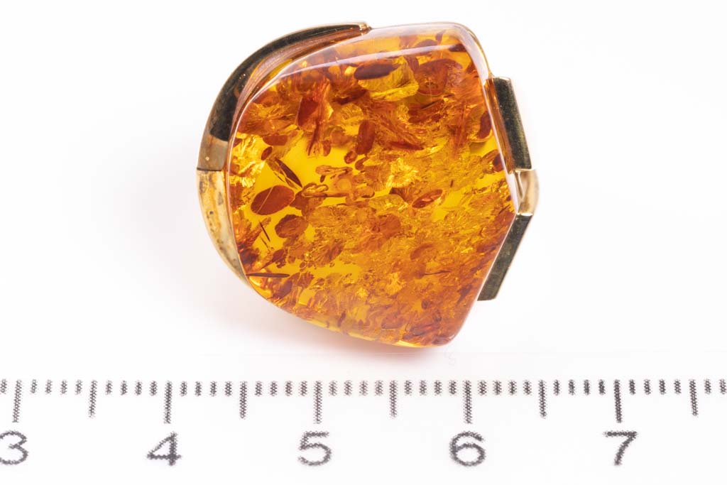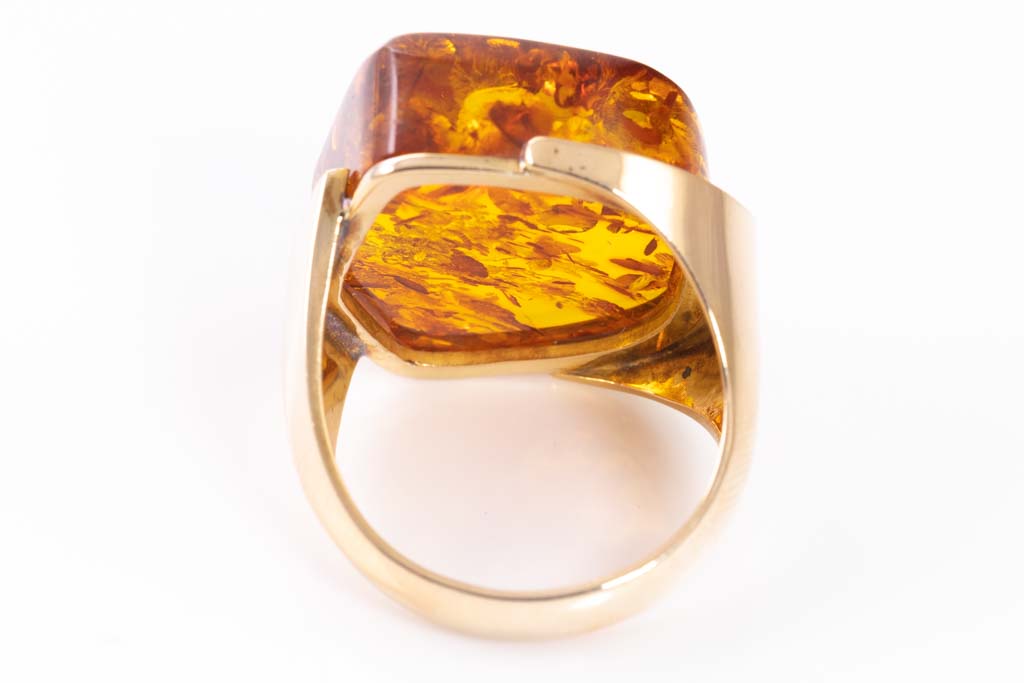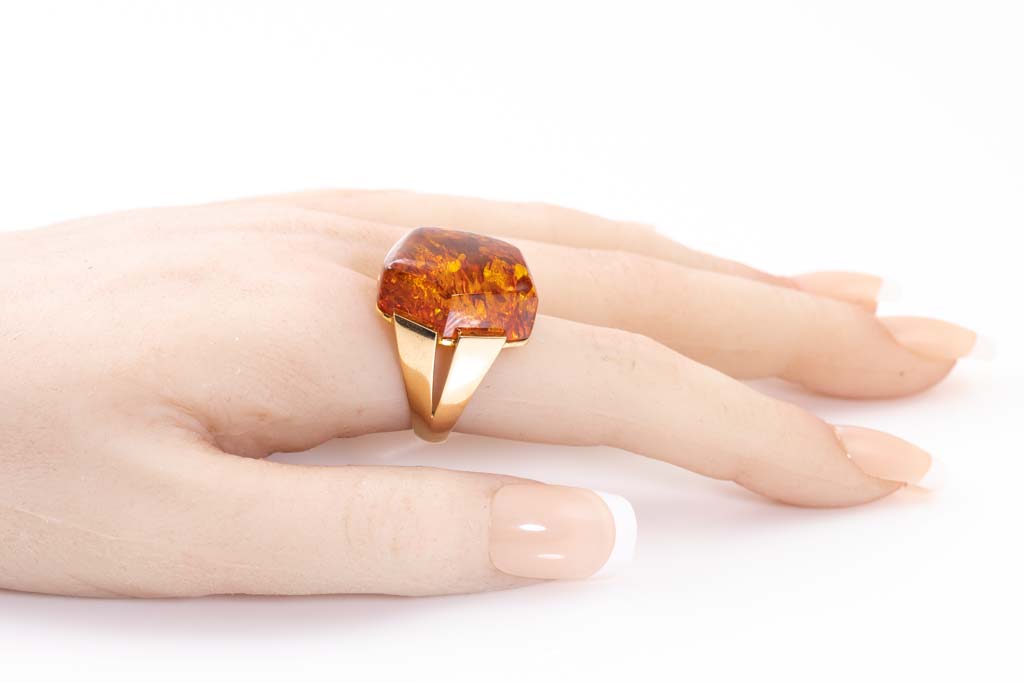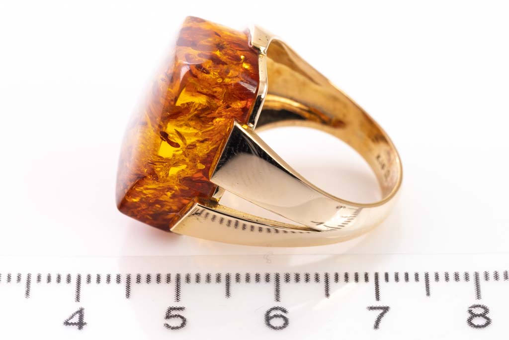 Amber ring with Amber of 18.5 x 21.2mm. 18ct yellow gold. Ring size P 1/2 - ring resize is not recommended. Weight: 10.6g. (Pre-owned)