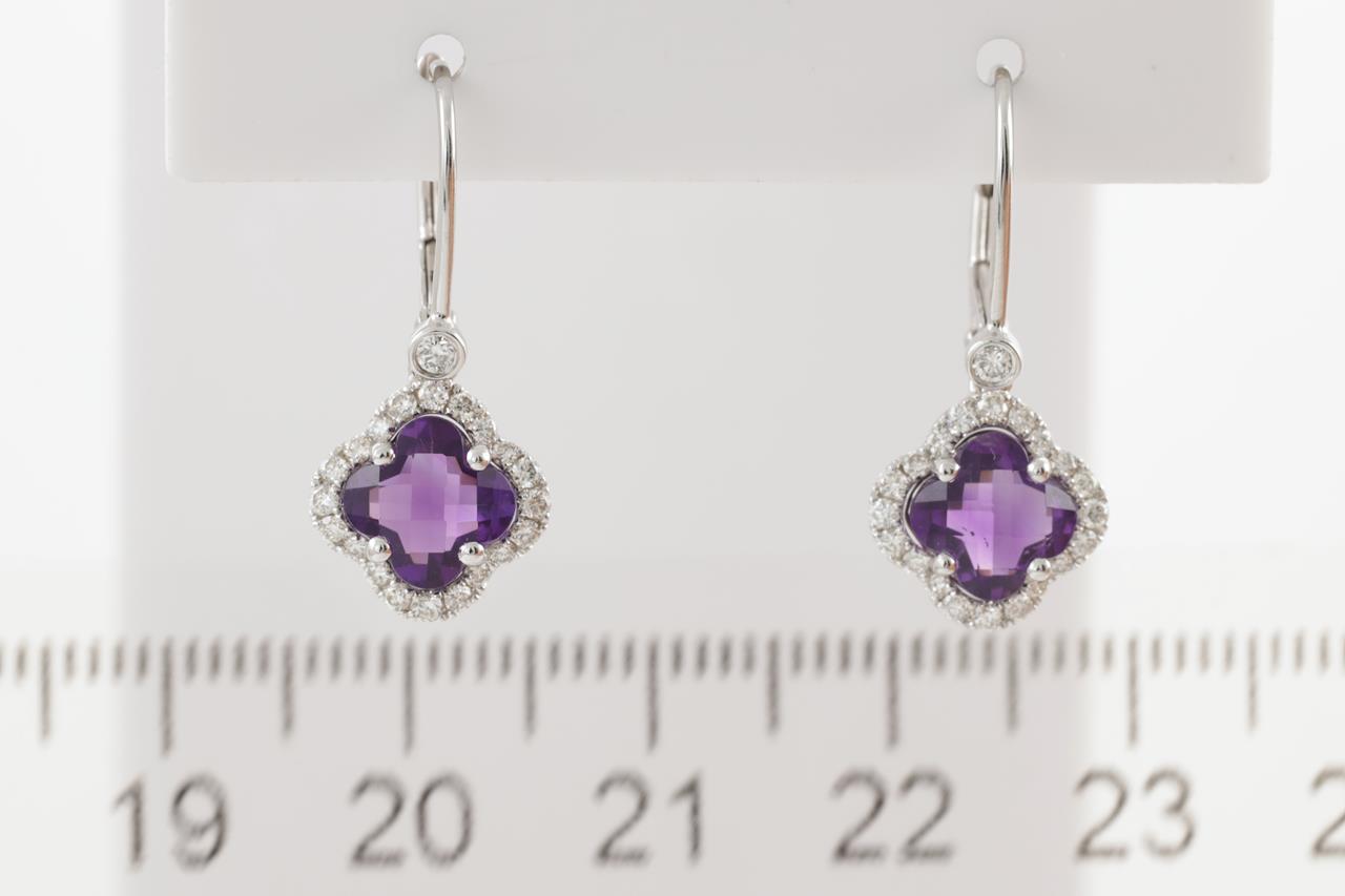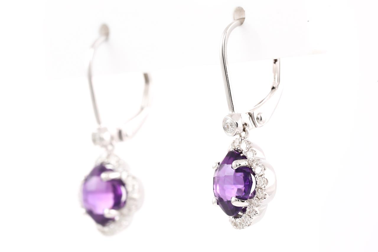 Amethyst and Diamond leverback earrings with fancy cut Amethyst totalling 1.57cts and Diamonds totalling 0.31cts (Estimated grading: H SI). 14ct white gold. Weight: 2.6g. (New)