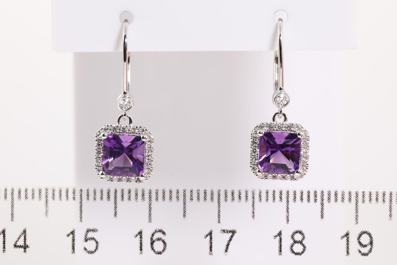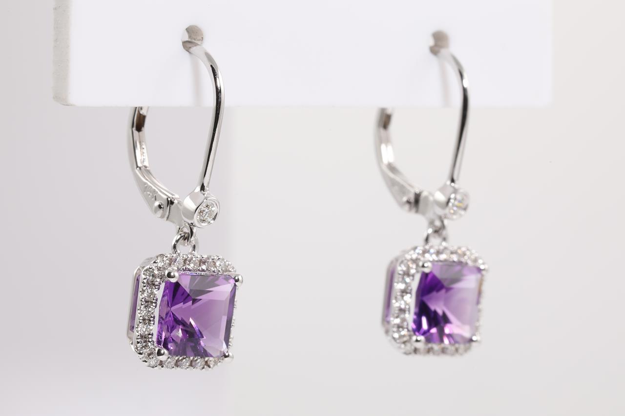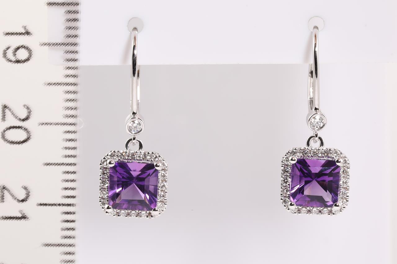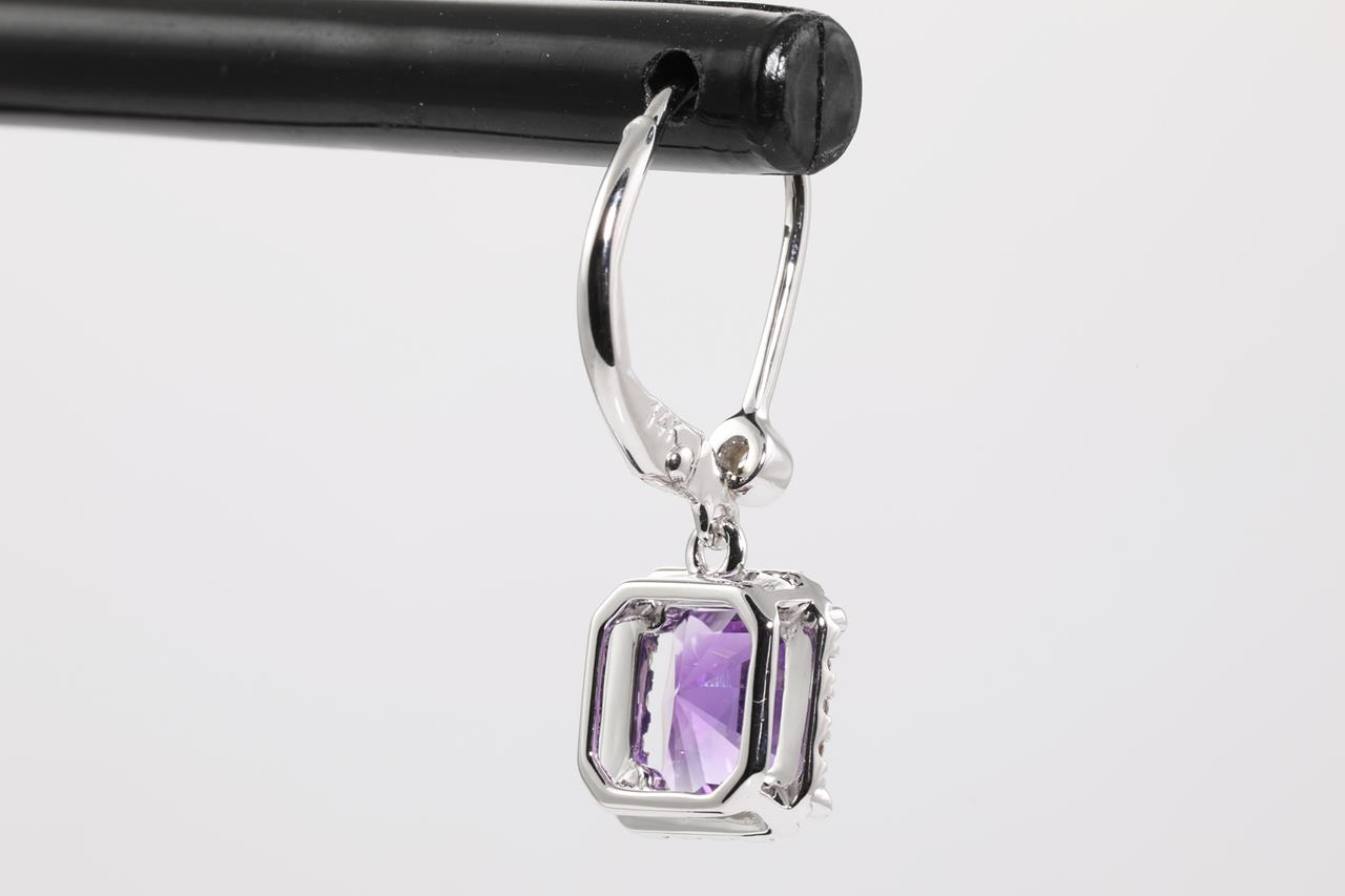Amethyst and Diamond leverback earrings with emerald cut Amethyst totalling 1.86cts and Diamonds totalling 0.25cts. 14ct white gold. Weight: 2.3g. (New)