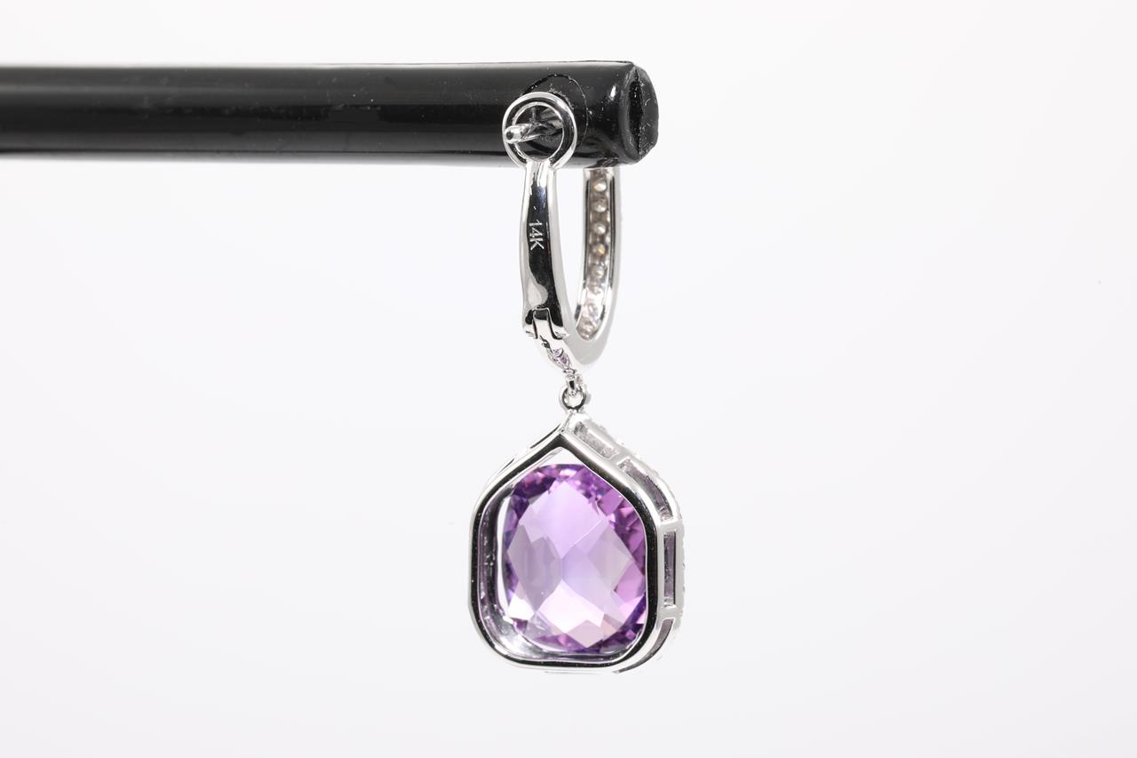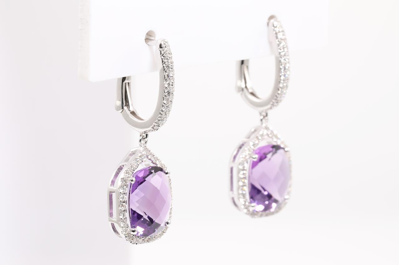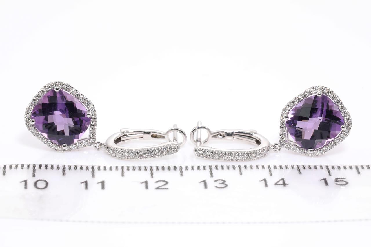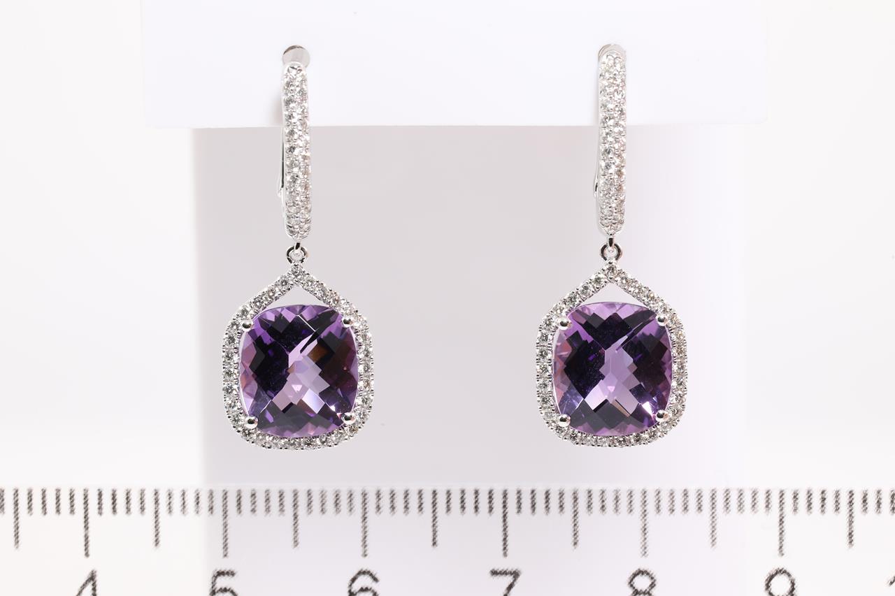 Amethyst and Diamond earrings with cushion cut Amethyst totalling 5.13cts and Diamonds totalling 0.48cts (Estimated grading: H SI). 14ct white gold. Weight: 4.1g. (New)