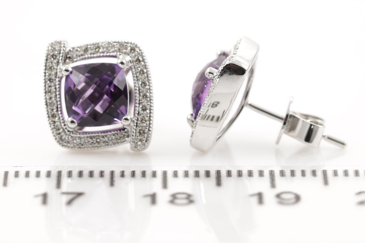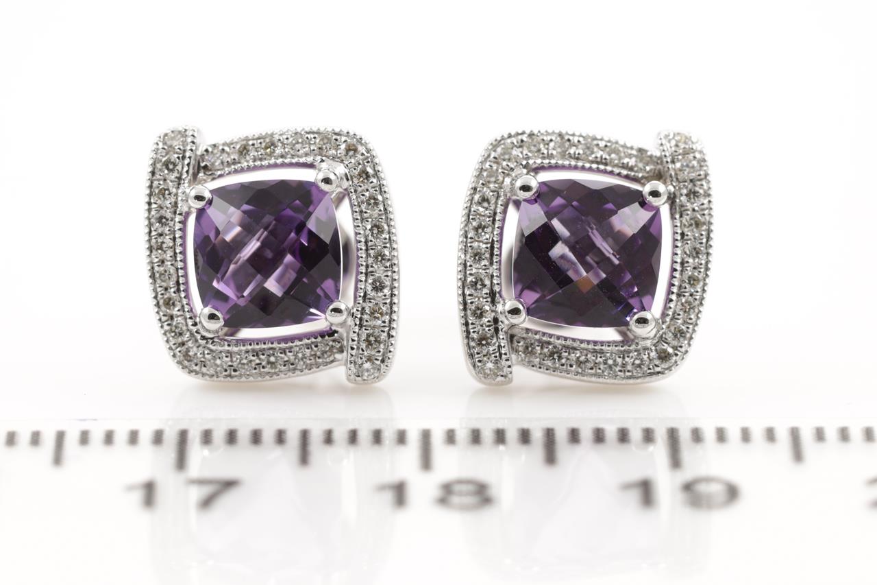 Amethyst and Diamond earrings with cushion cut Amethyst totalling 1.91cts and Diamonds totalling 0.21cts. 14ct white gold. Weight: 3.4g. (New)