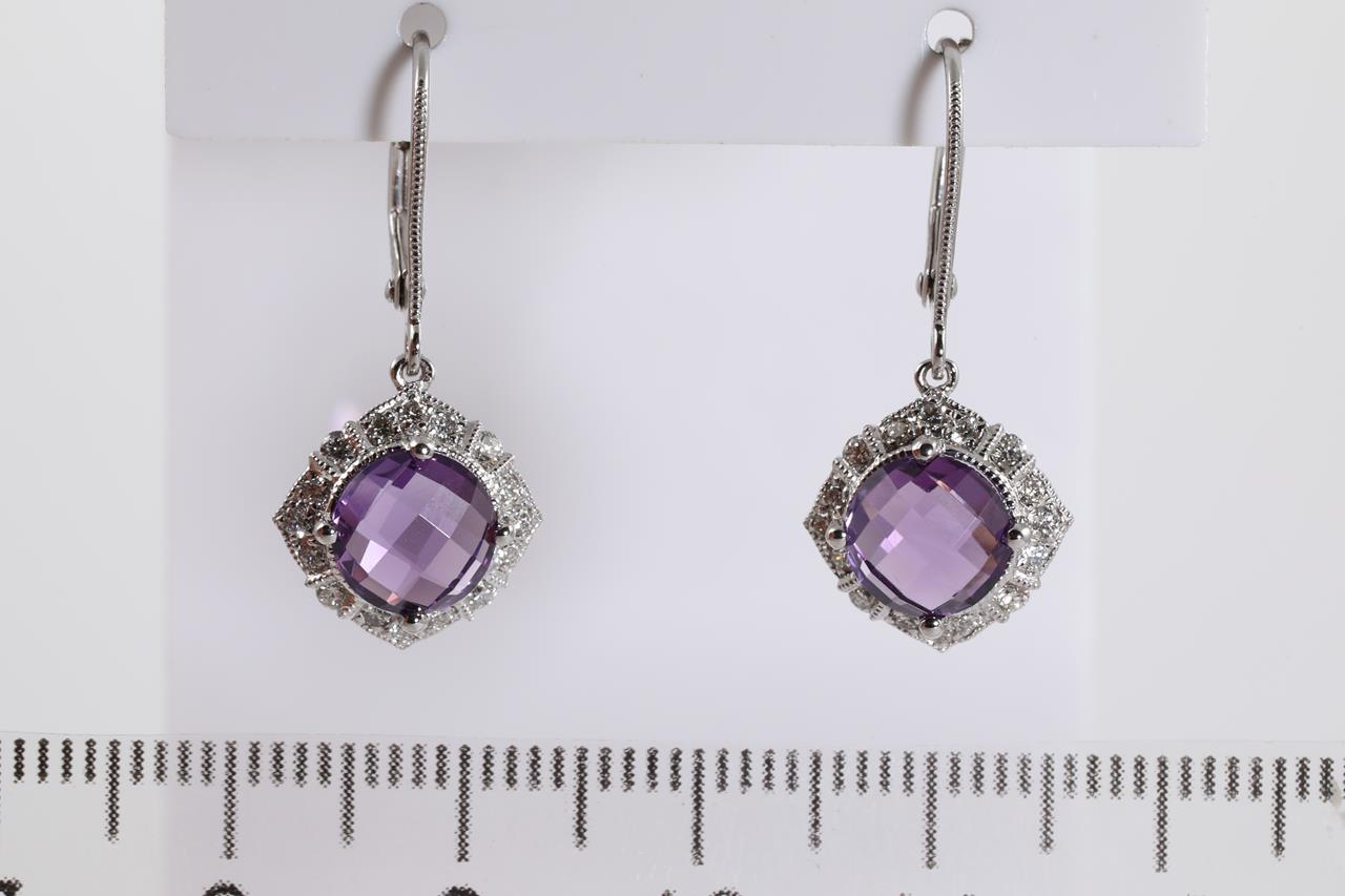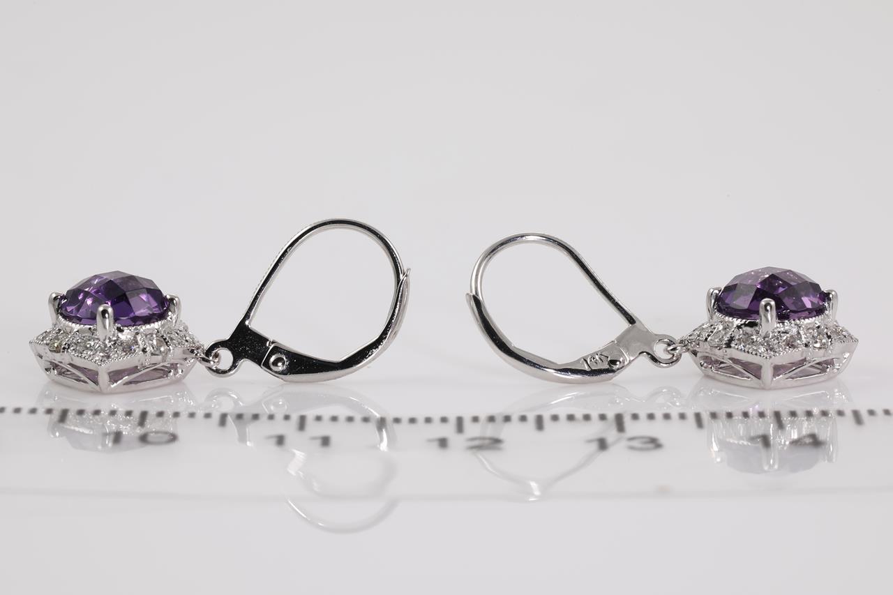 Amethyst and Diamond leverback earrings with round Amethyst totalling 2.48cts and Diamonds totalling 0.35cts (Estimated grading: H SI). 14ct white gold. Weight: 3.5g. (New)
