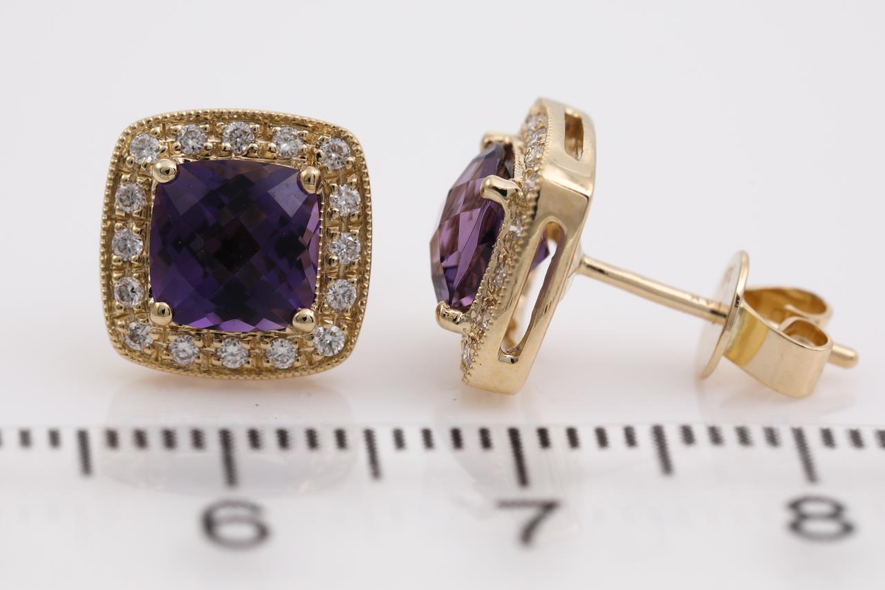 Amethyst and Diamond earrings with cushion cut Amethyst totalling 1.76cts and Diamonds totalling 0.19cts. 14ct yellow gold. Weight: 2.6g. (New)