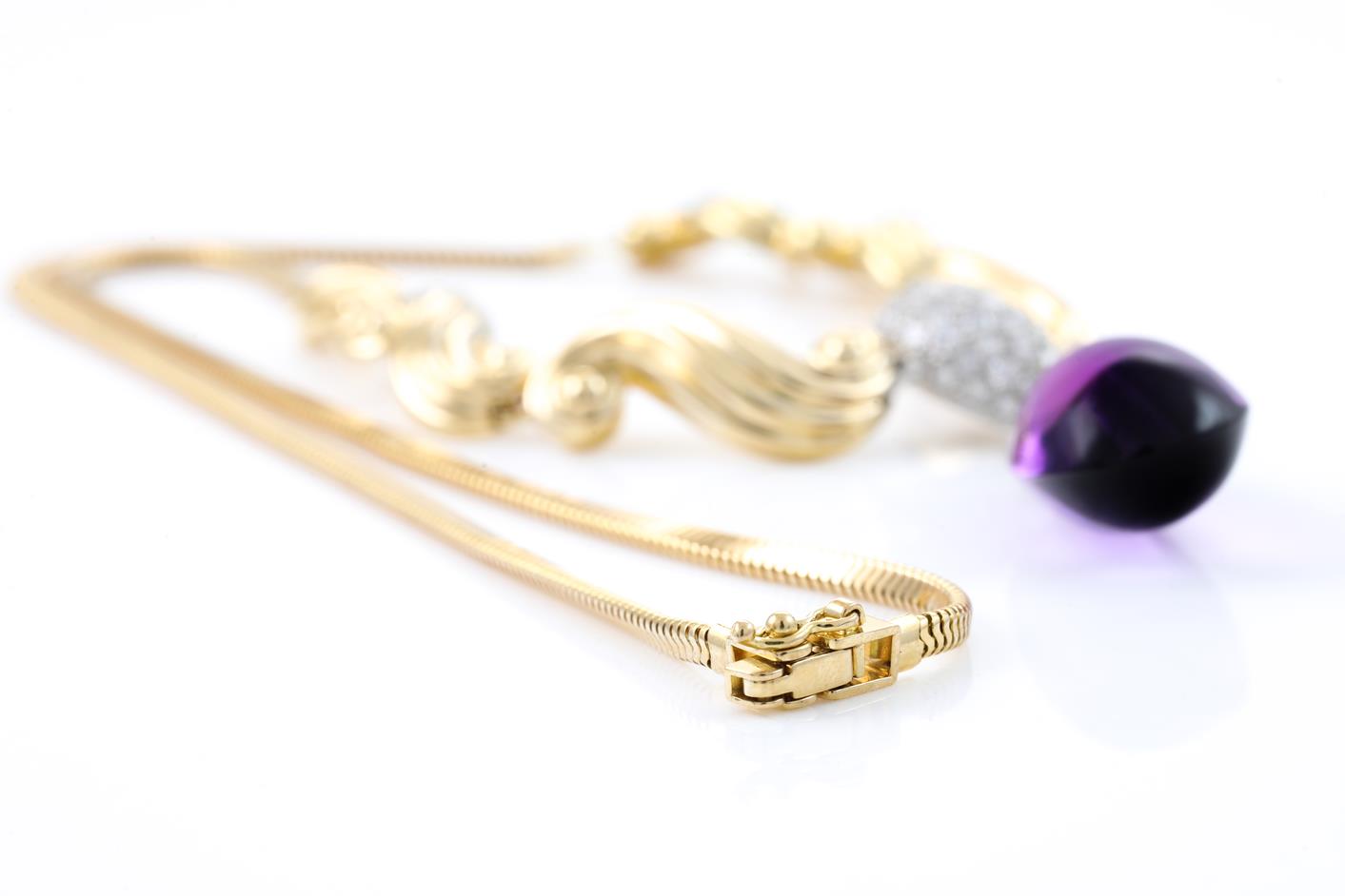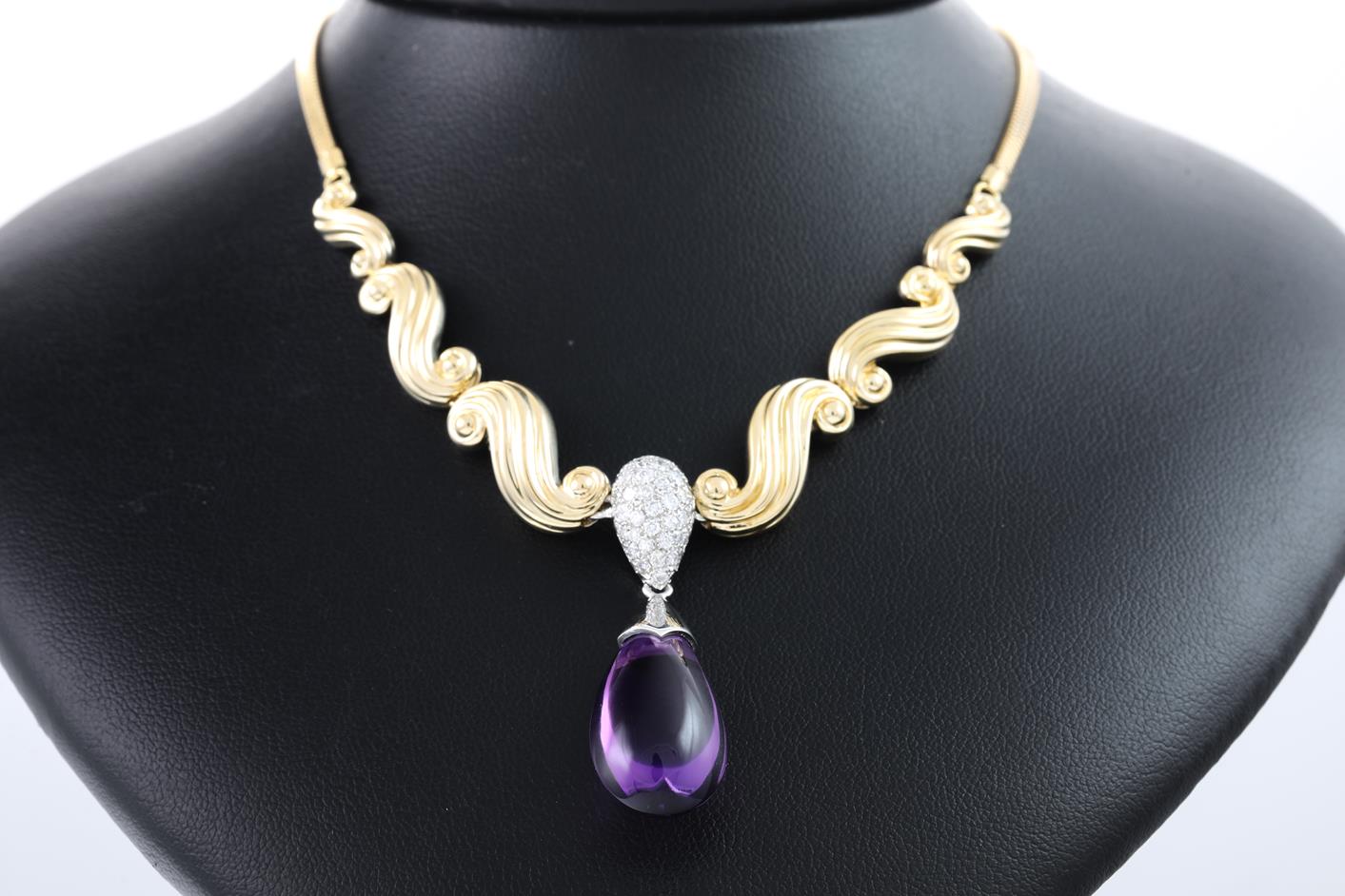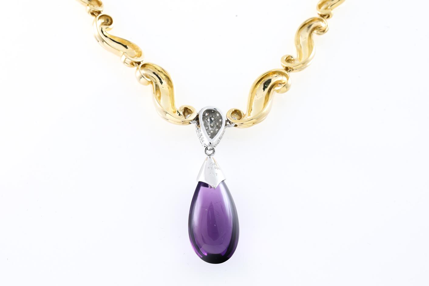 Amethyst and Diamond necklace with a cabochon drop shape Amethyst of 2.5cm x 1.2cm x 1.3cm and Diamonds totalling 0.35cts (Estimated grading: G-H SI). 18ct yellow gold and platinum. Length: 41cm. Weight: 29.4g. With certificate #415729. (Pre-owned)