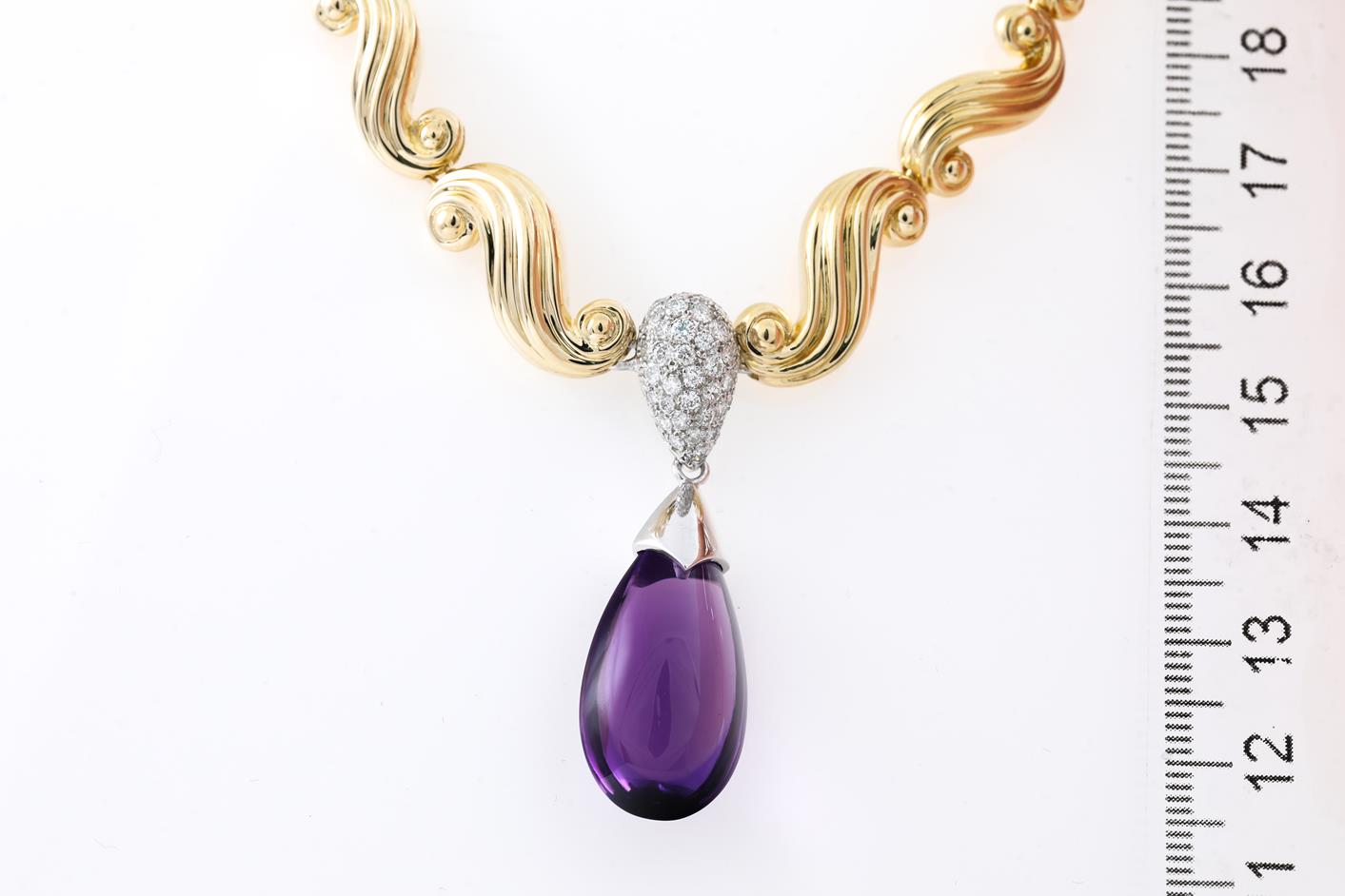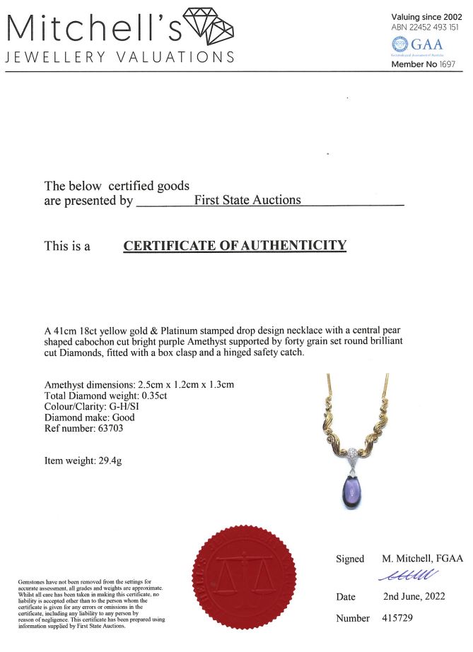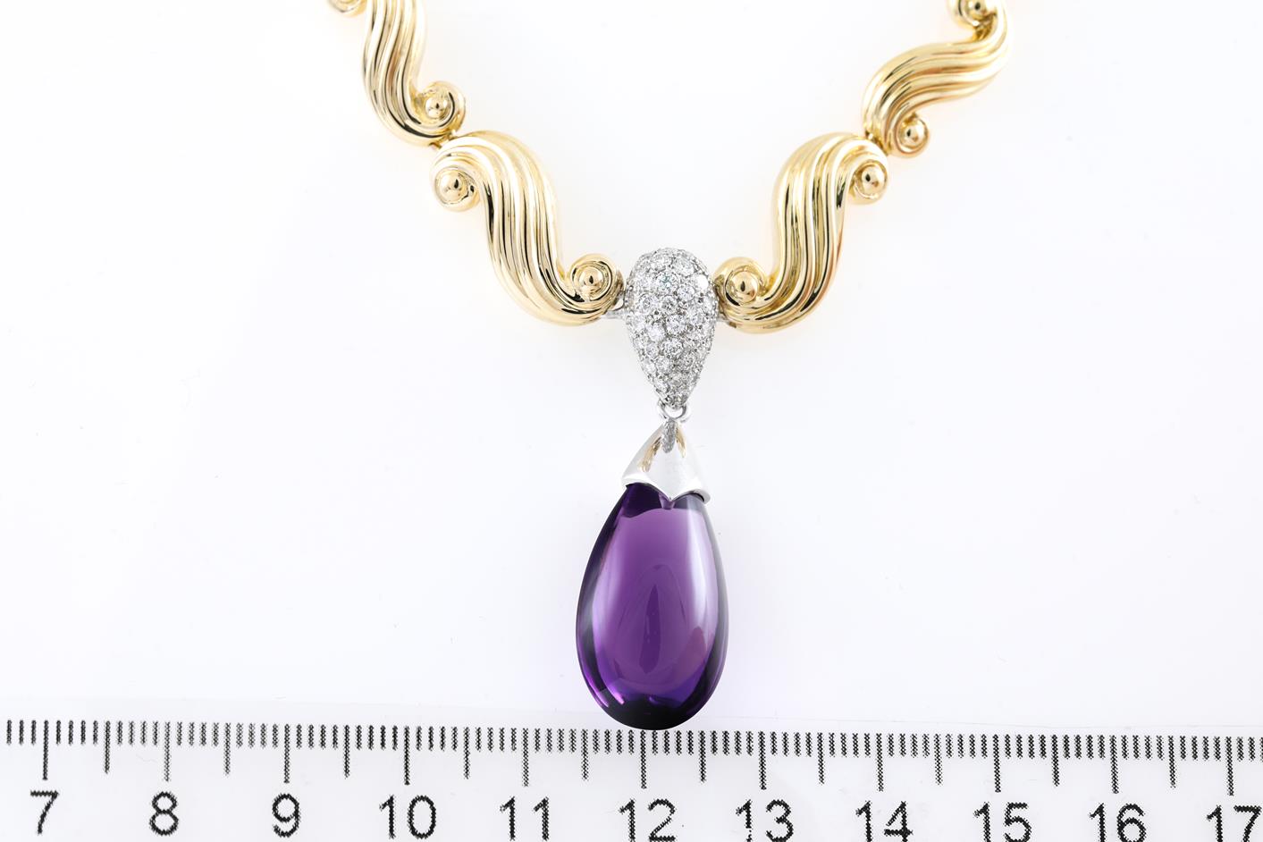 Amethyst and Diamond necklace with a cabochon drop shape Amethyst of 2.5cm x 1.2cm x 1.3cm and Diamonds totalling 0.35cts (Estimated grading: G-H SI). 18ct yellow gold and platinum. Length: 41cm. Weight: 29.4g. With certificate #415729. (Pre-owned)