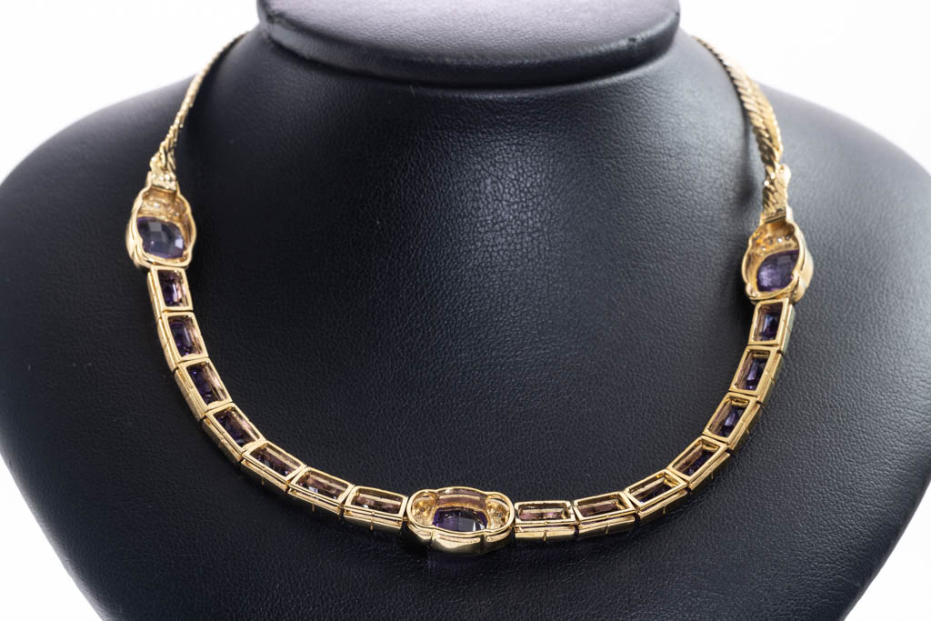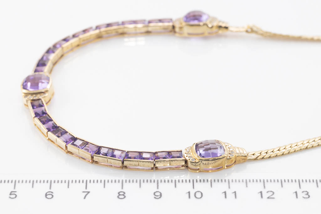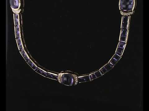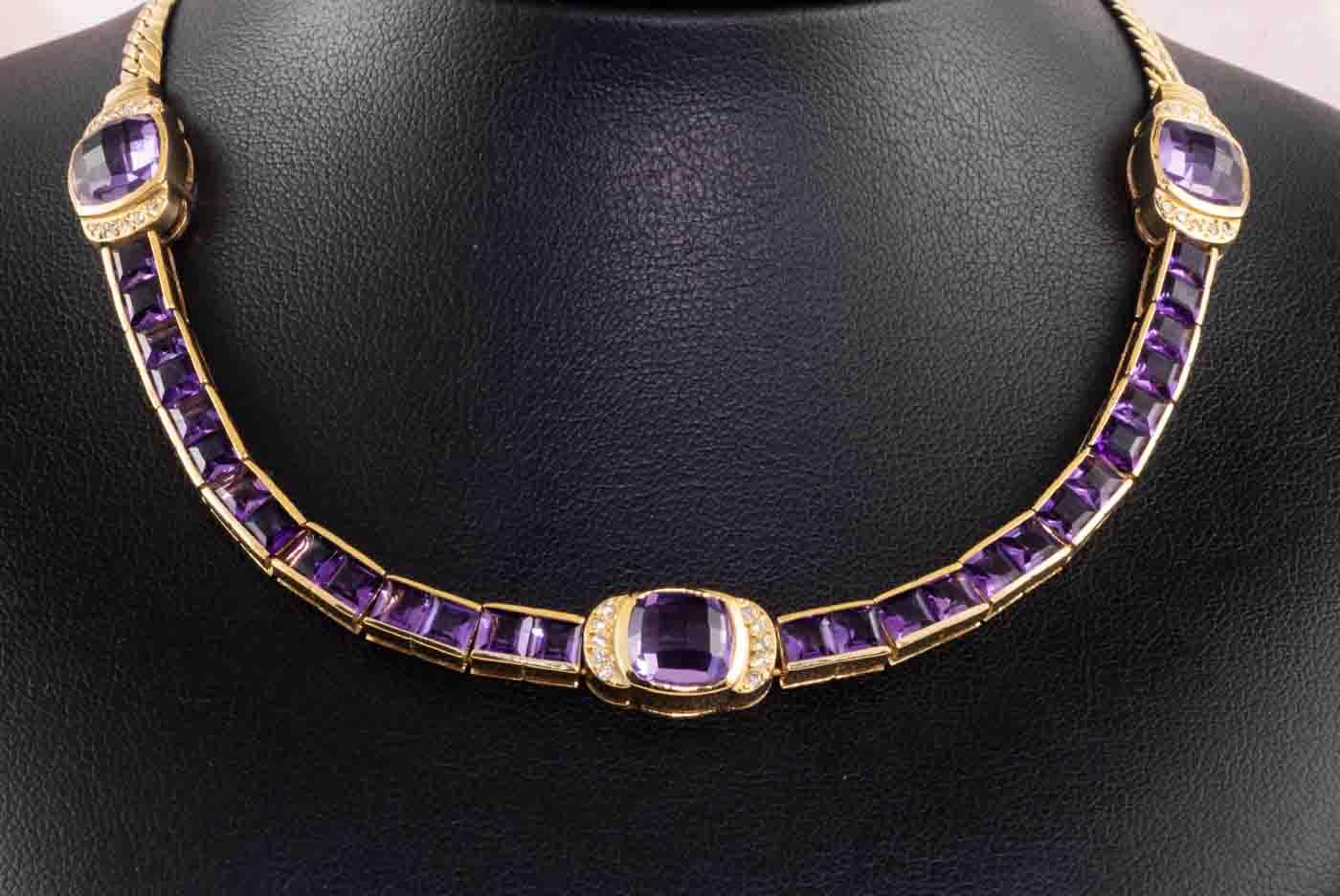 Amethyst and Diamond necklace with carre & cushion cut Amethyst totalling approximately 8.00cts and round Diamonds totalling approximately 0.15cts. 18ct yellow gold. Length: 46cm. Weight: 22.9g. (Pre-owned)