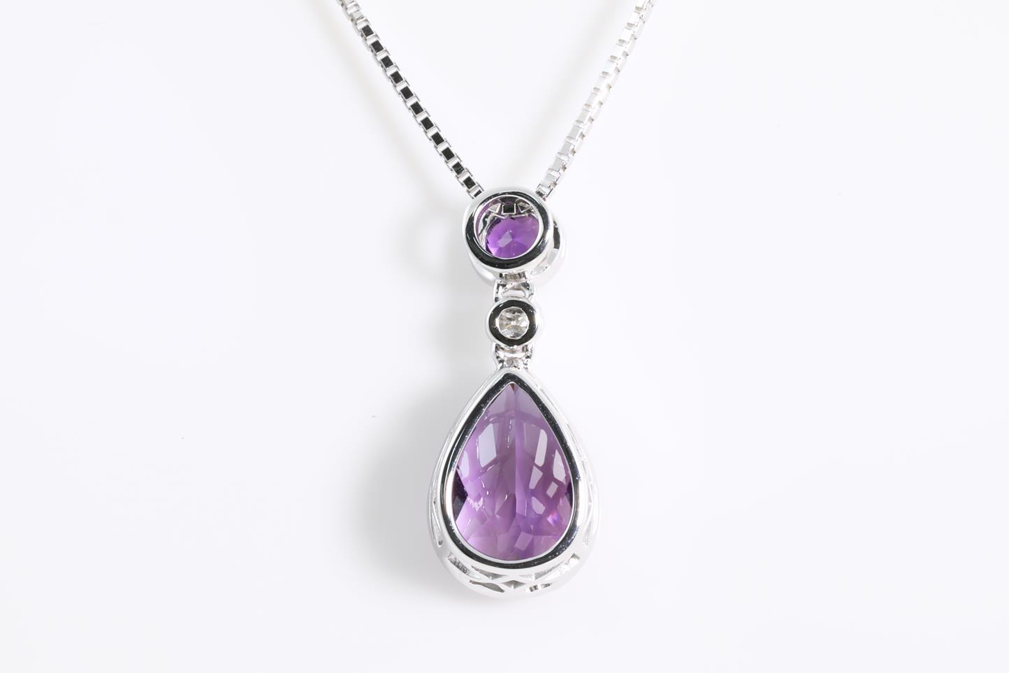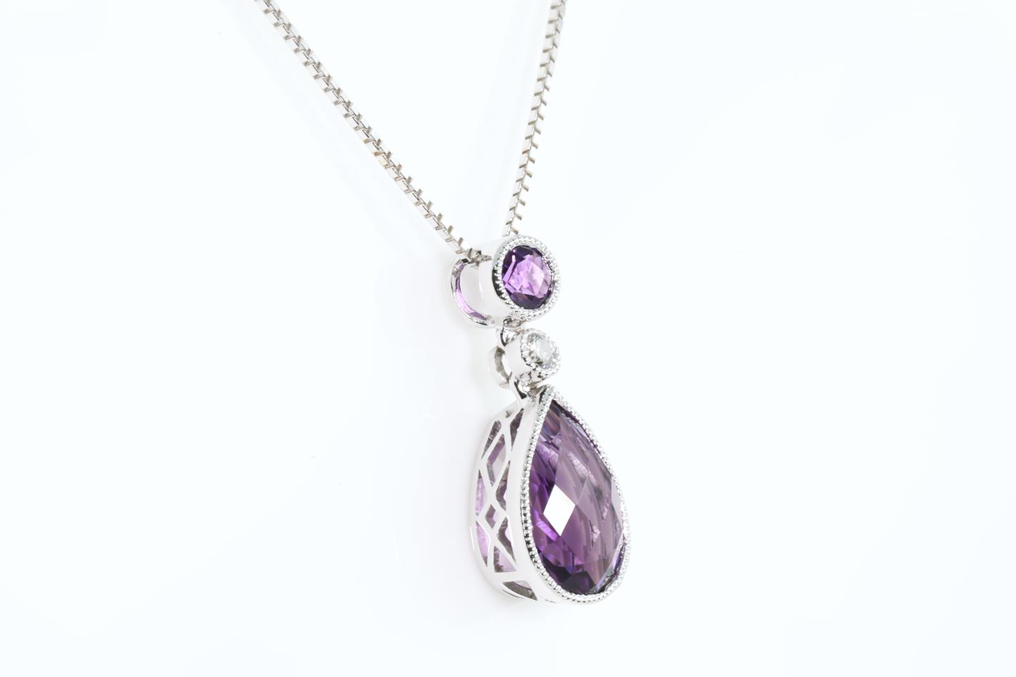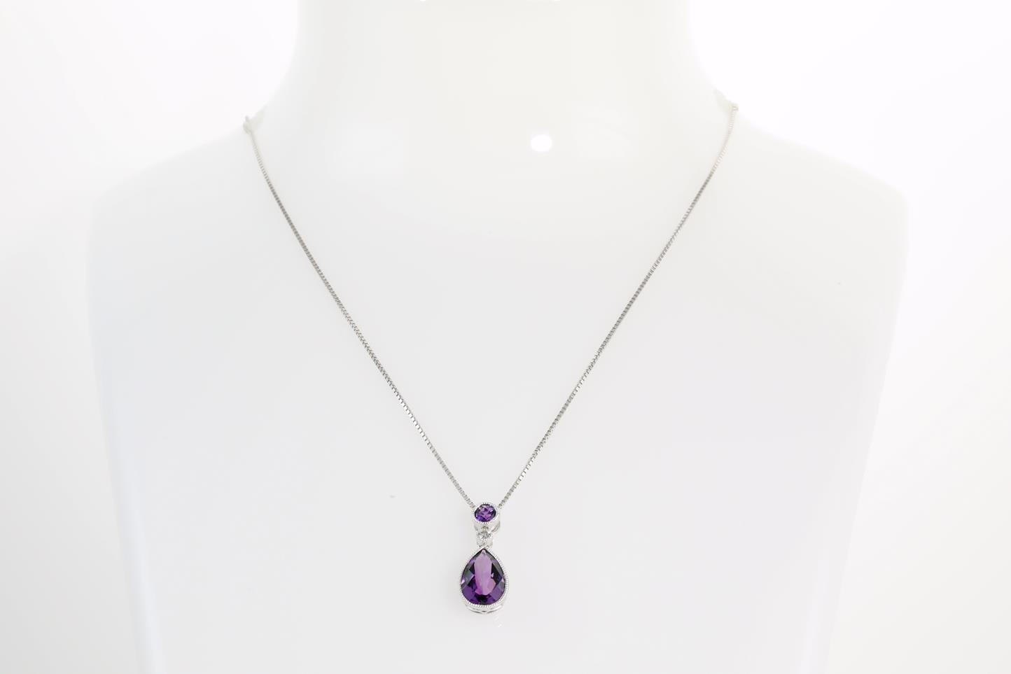 Amethyst and Diamond pendant with pear shape Amethyst of 1.26ct, round shape Amethyst of 0.10ct and a 0.03ct Diamond. 14ct White gold with 18ct gold adjustable 45cm chain. Weight: 4.6g (New)