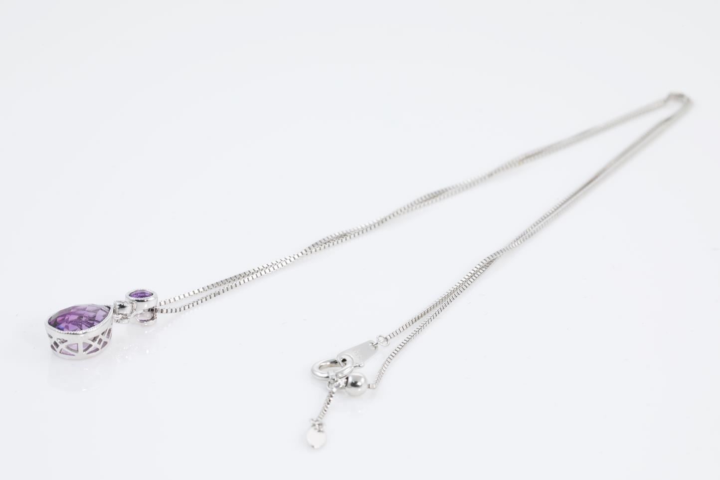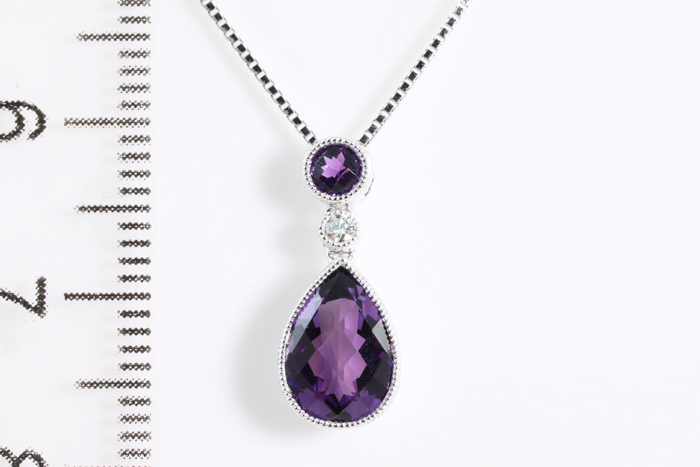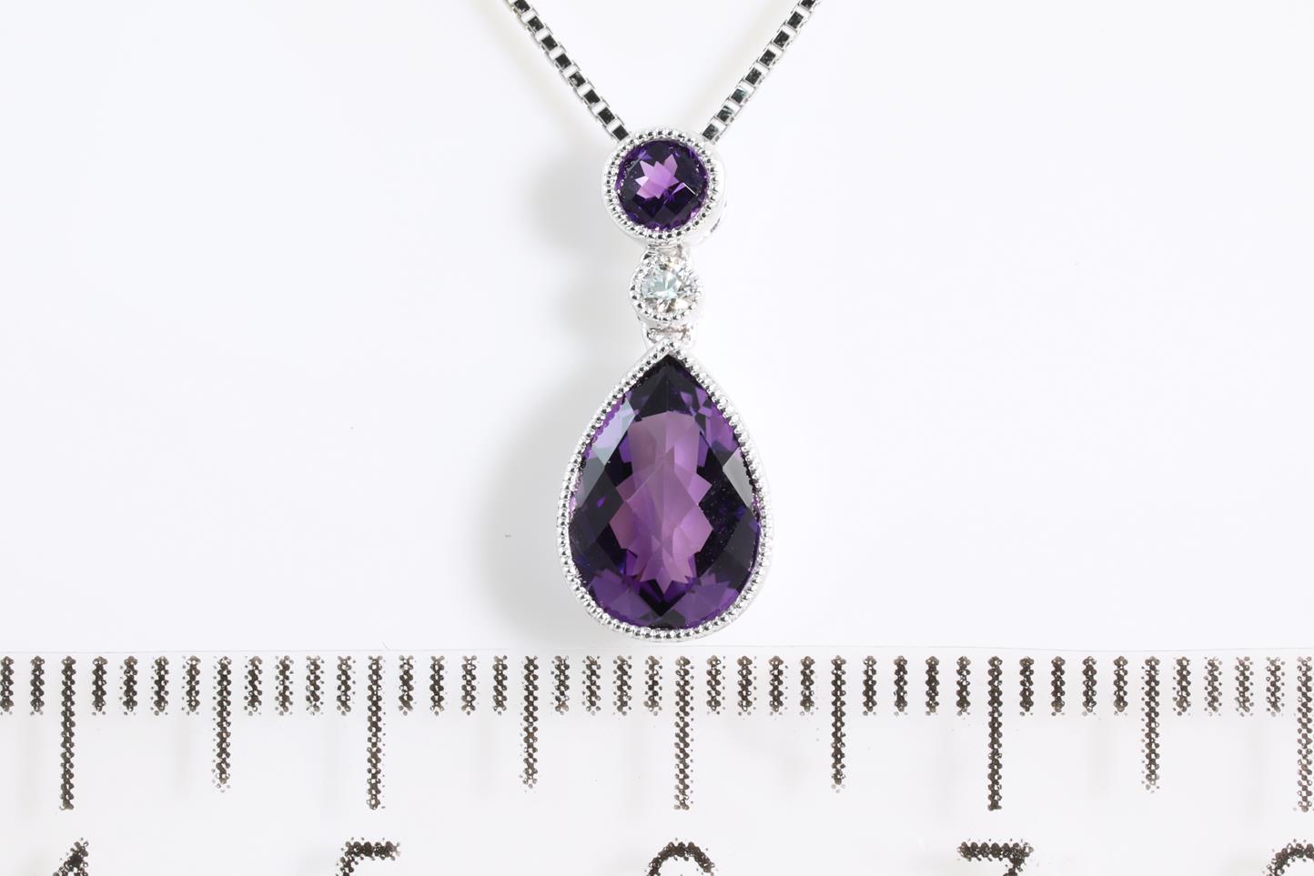 Amethyst and Diamond pendant with pear shape Amethyst of 1.26ct, round shape Amethyst of 0.10ct and a 0.03ct Diamond. 14ct White gold with 18ct gold adjustable 45cm chain. Weight: 4.6g (New)