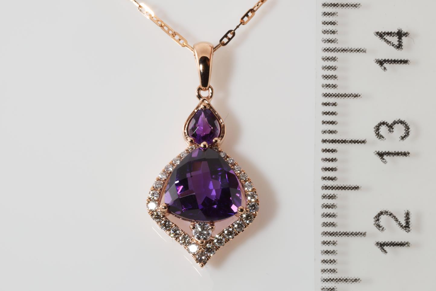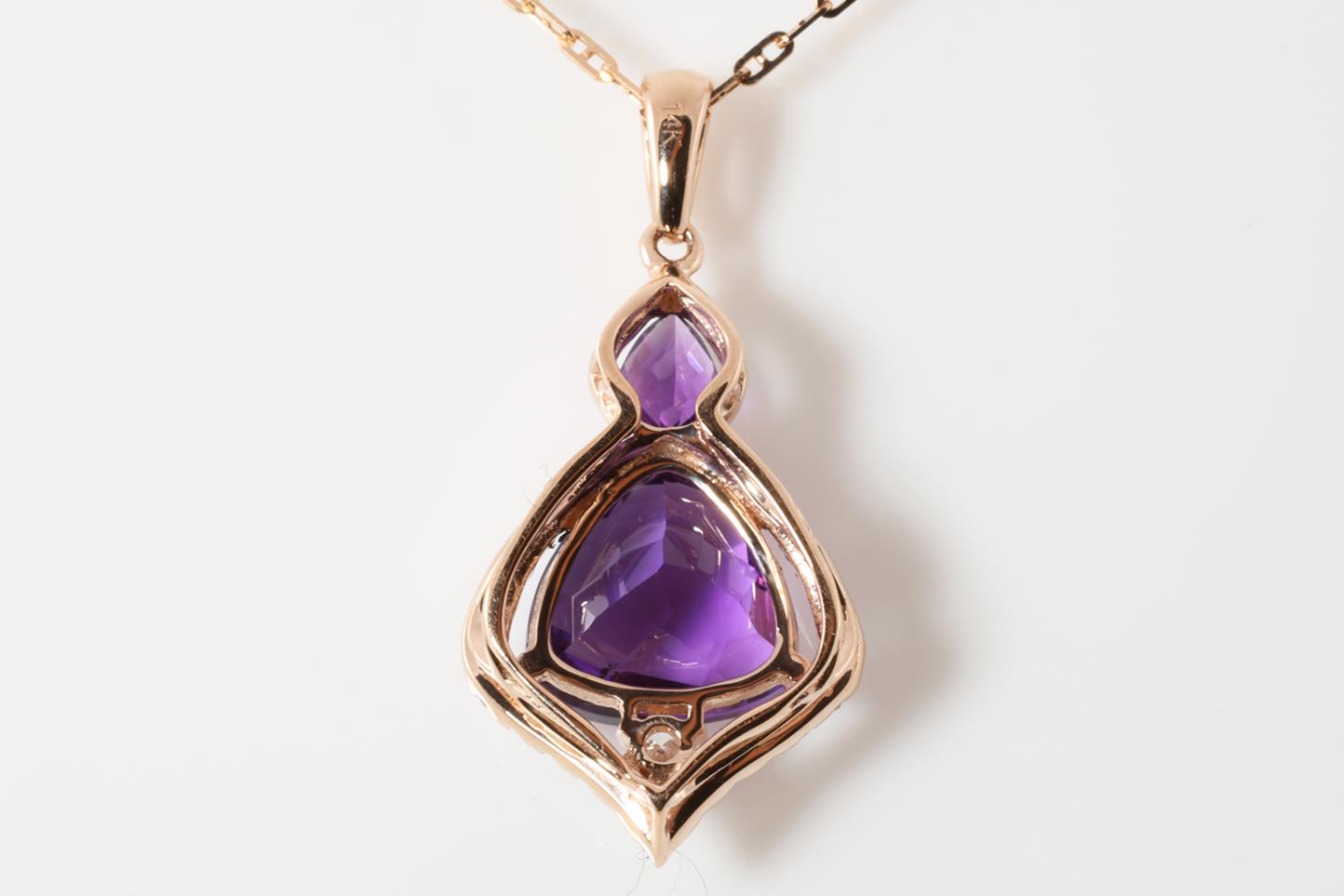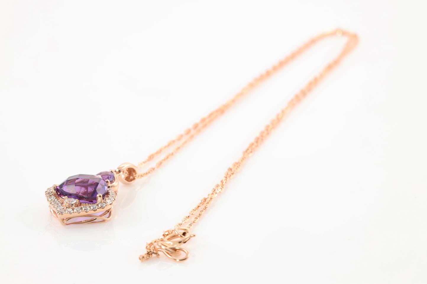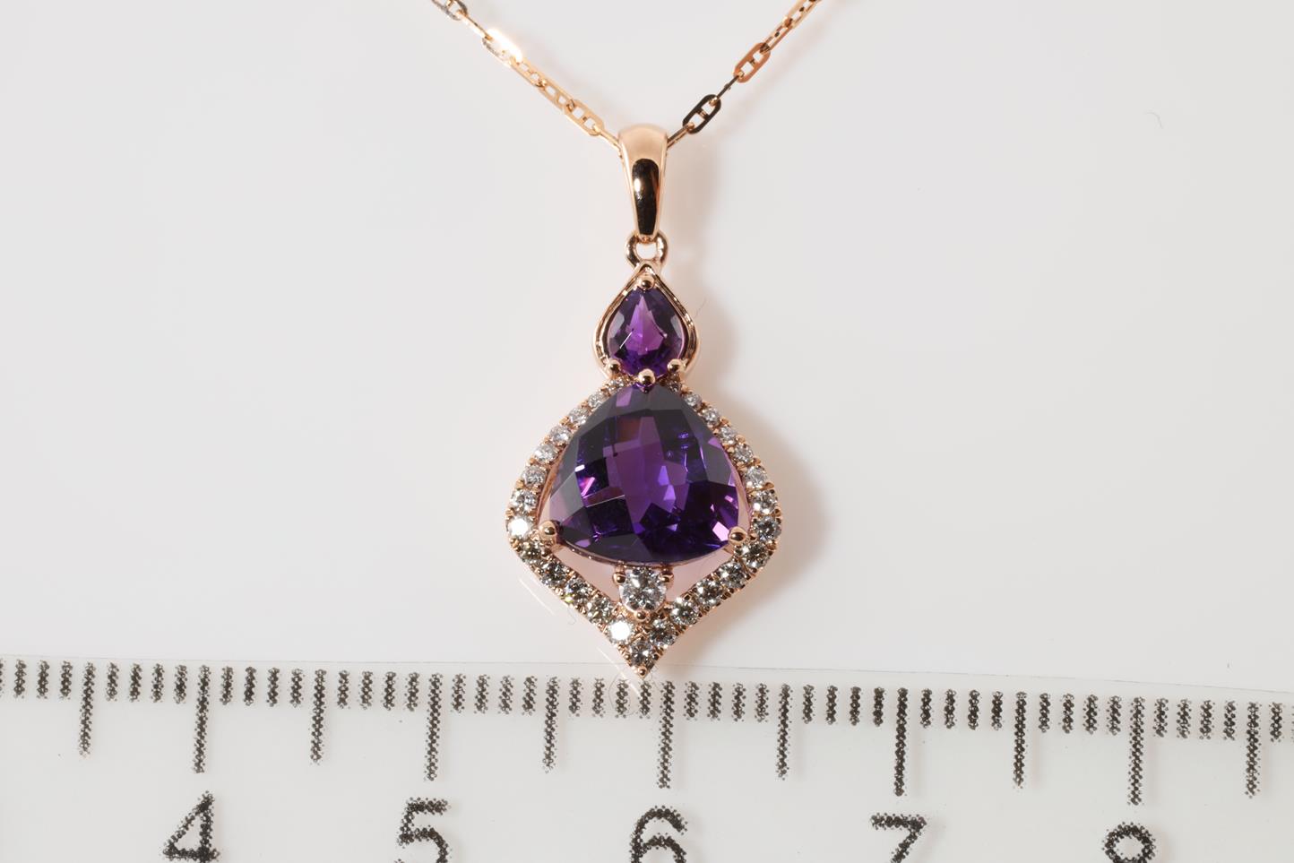 Amethyst and Diamond pendant with pear shape Amethyts of 0.16ct, trilliant shape Amethyst of 1.93ct and Diamonds totalling 0.20cts. 14ct rose gold with rose gold 45cm chain. Weight: 3.7g (New)