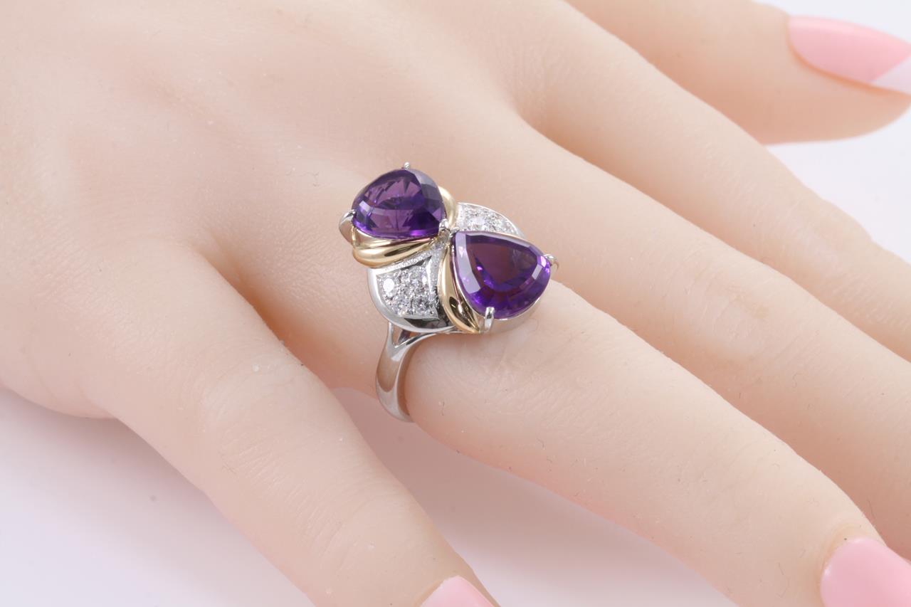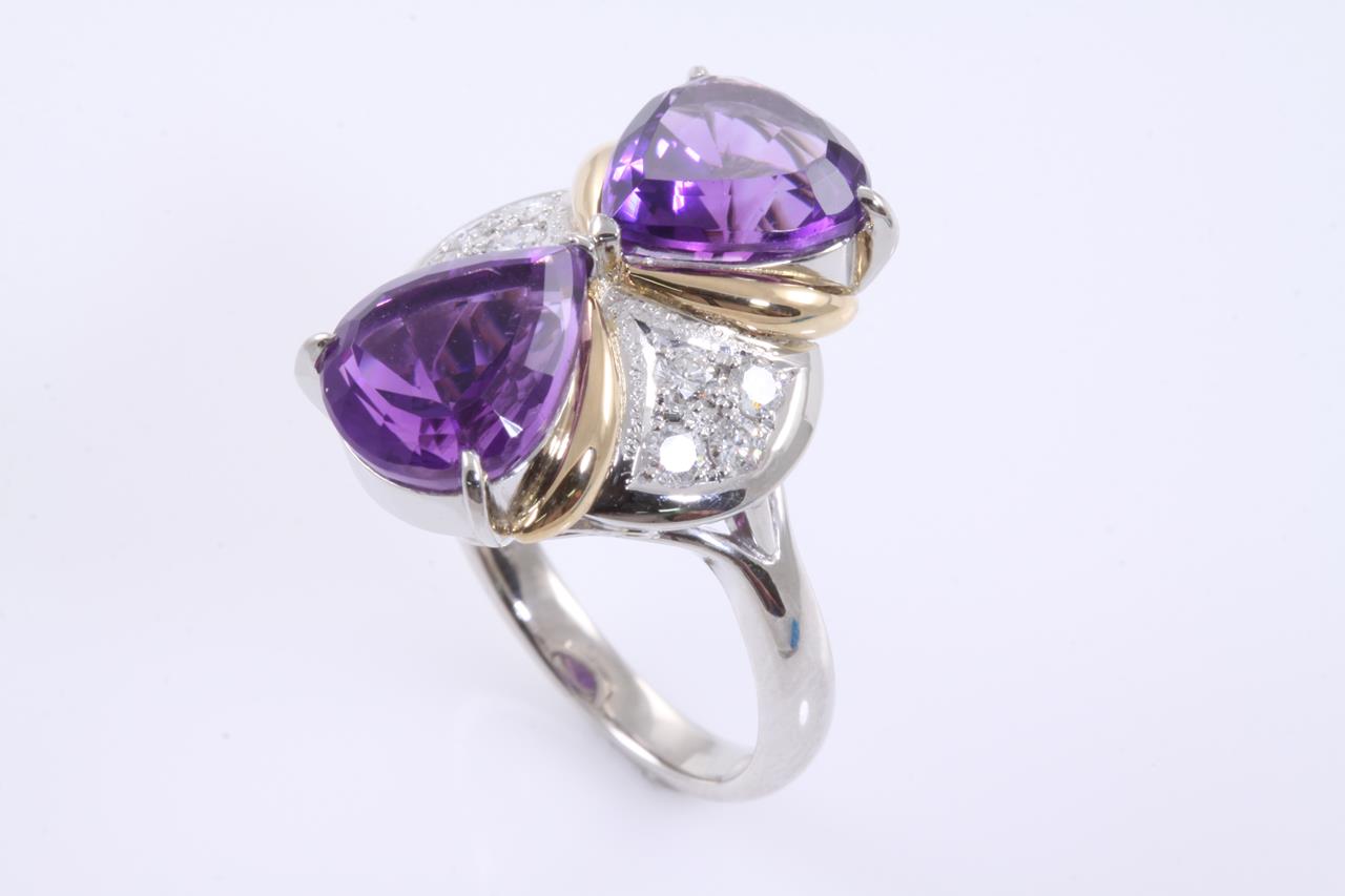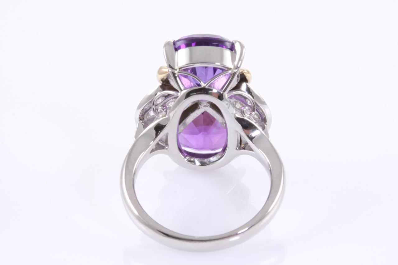 Amethyst and Diamond ring with pear shape Amethyst totalling 5.78cts and Diamonds totalling 0.29cts (Estimated grading: G-H VS). 18ct yellow gold and platinum. Ring size K. Weight: 11.3g. (Pre-owned)