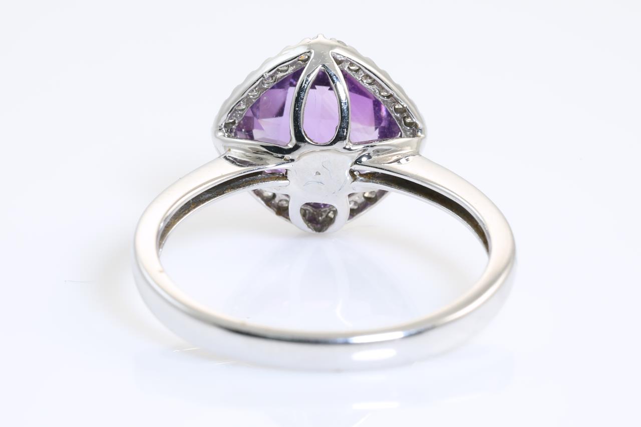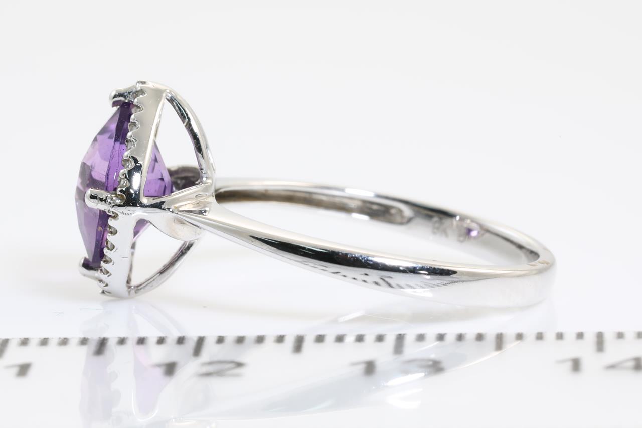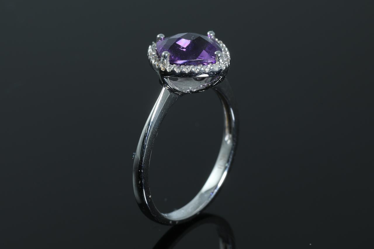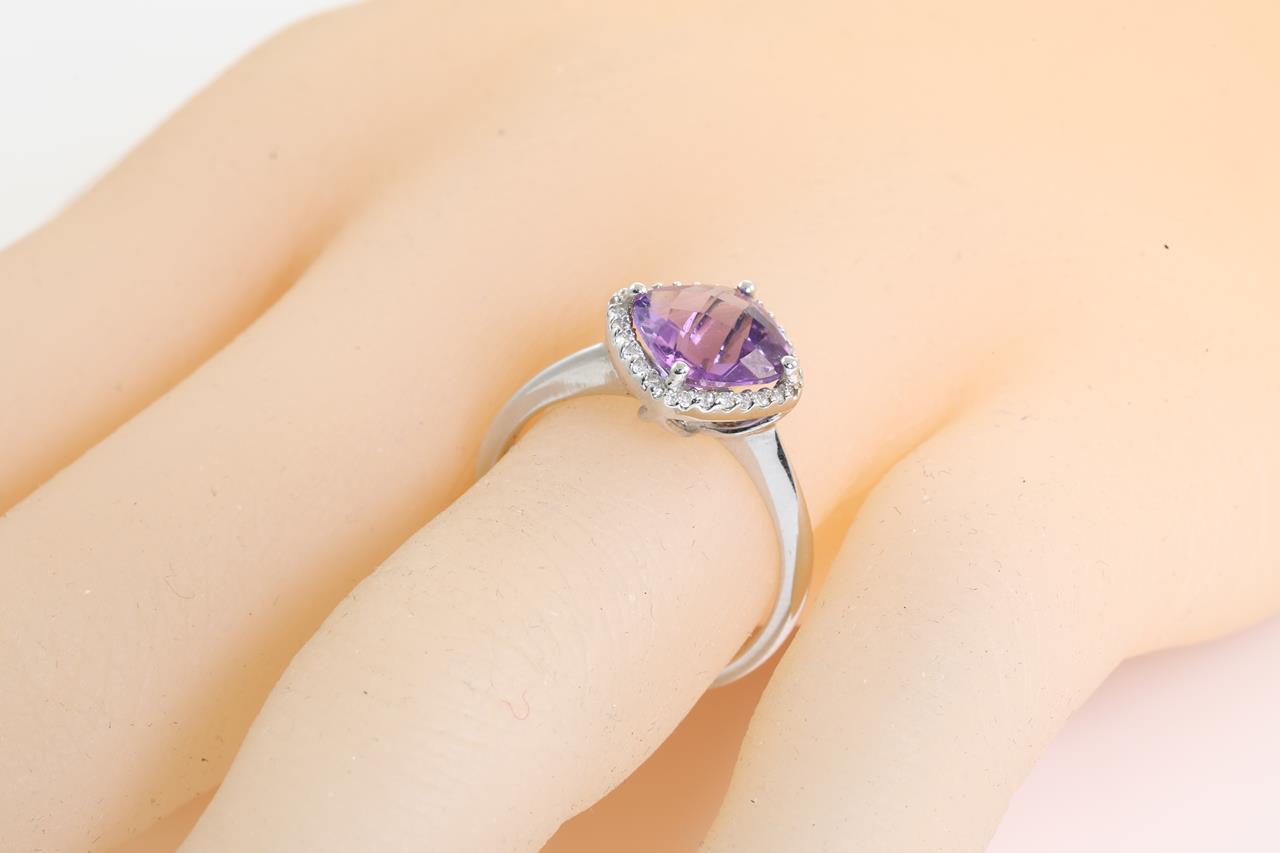 Amethyst and Diamond ring with a cushion checkerboard cut Amethyst of 1.82ct and Diamonds totalling 0.14cts. 9ct white gold. Ring size M1/2. Weight: 2.4 (As new)
