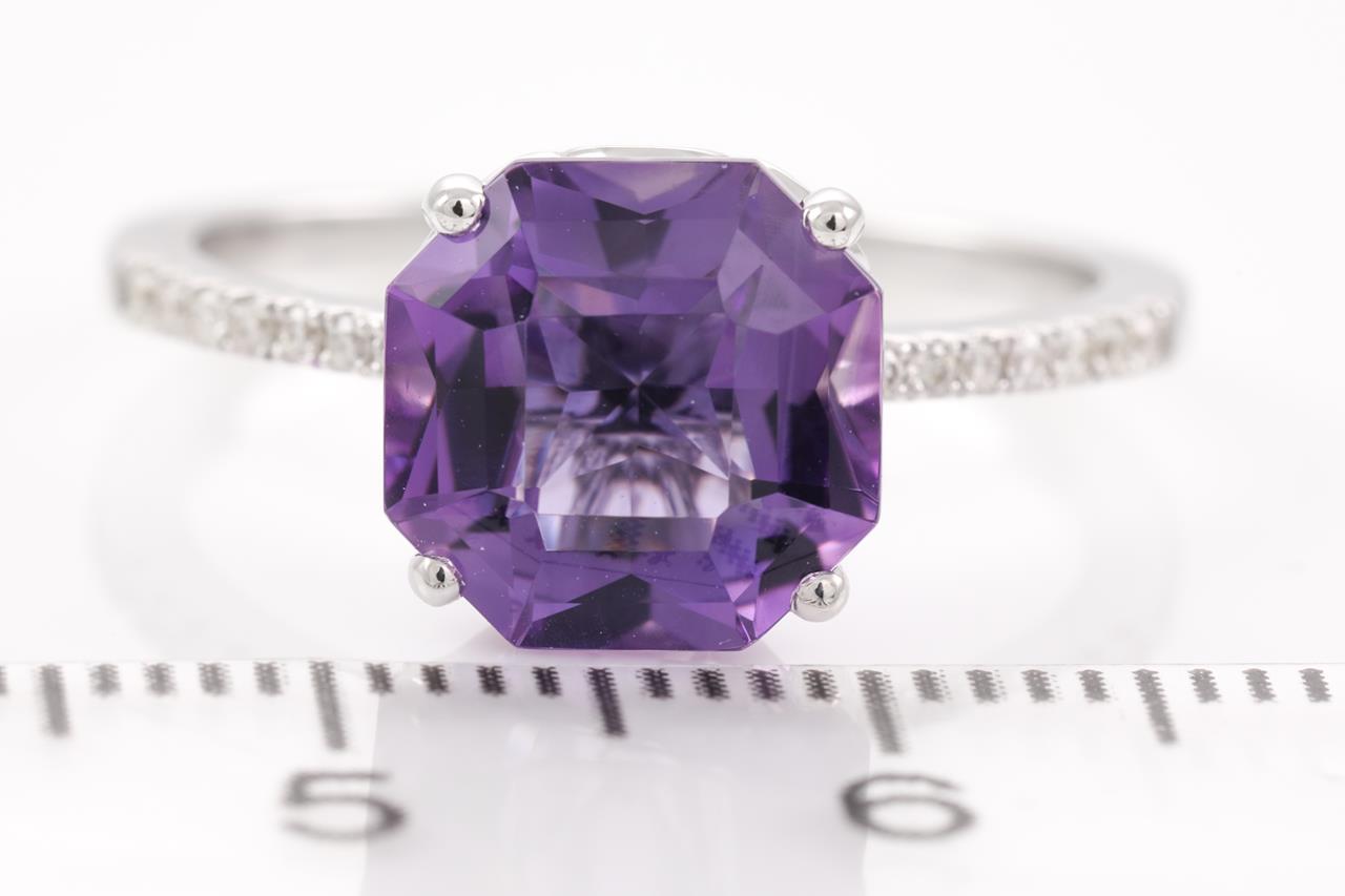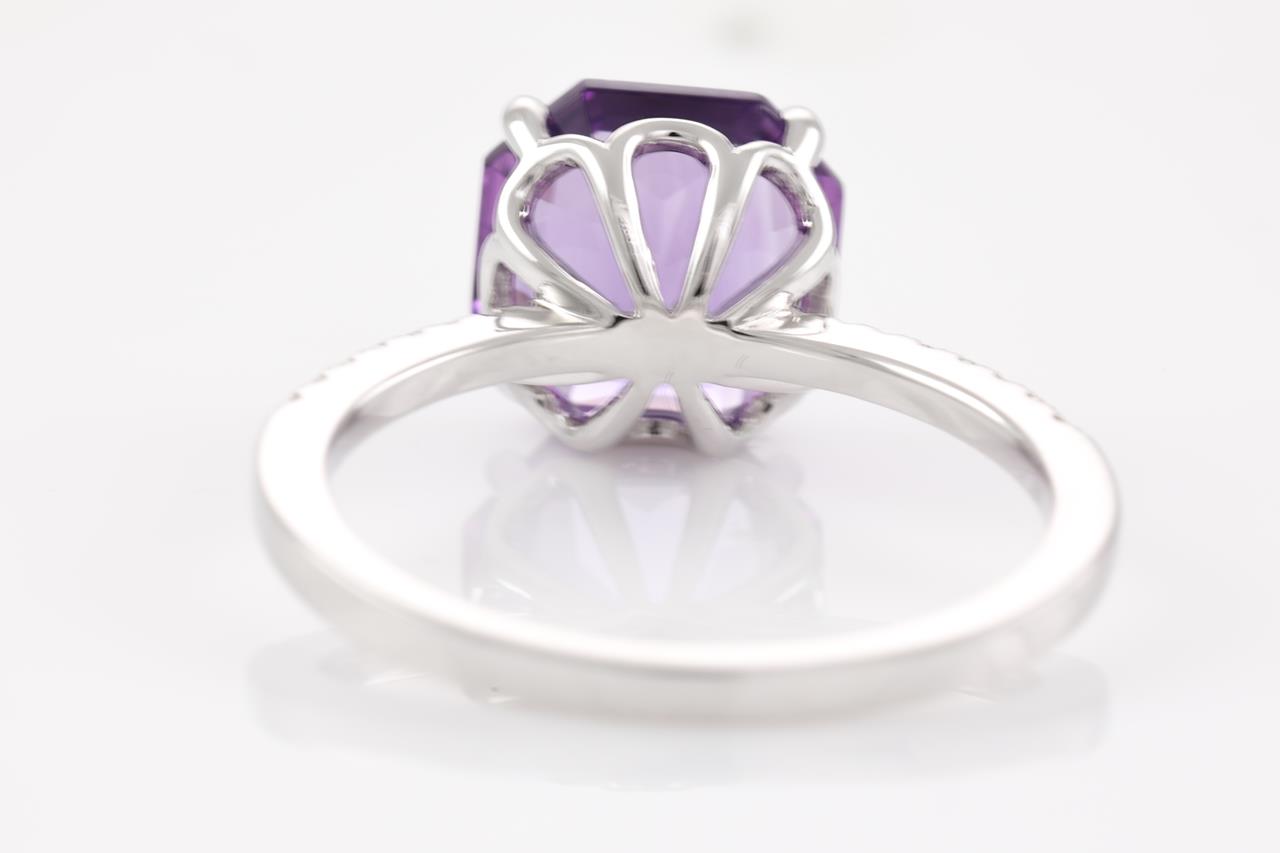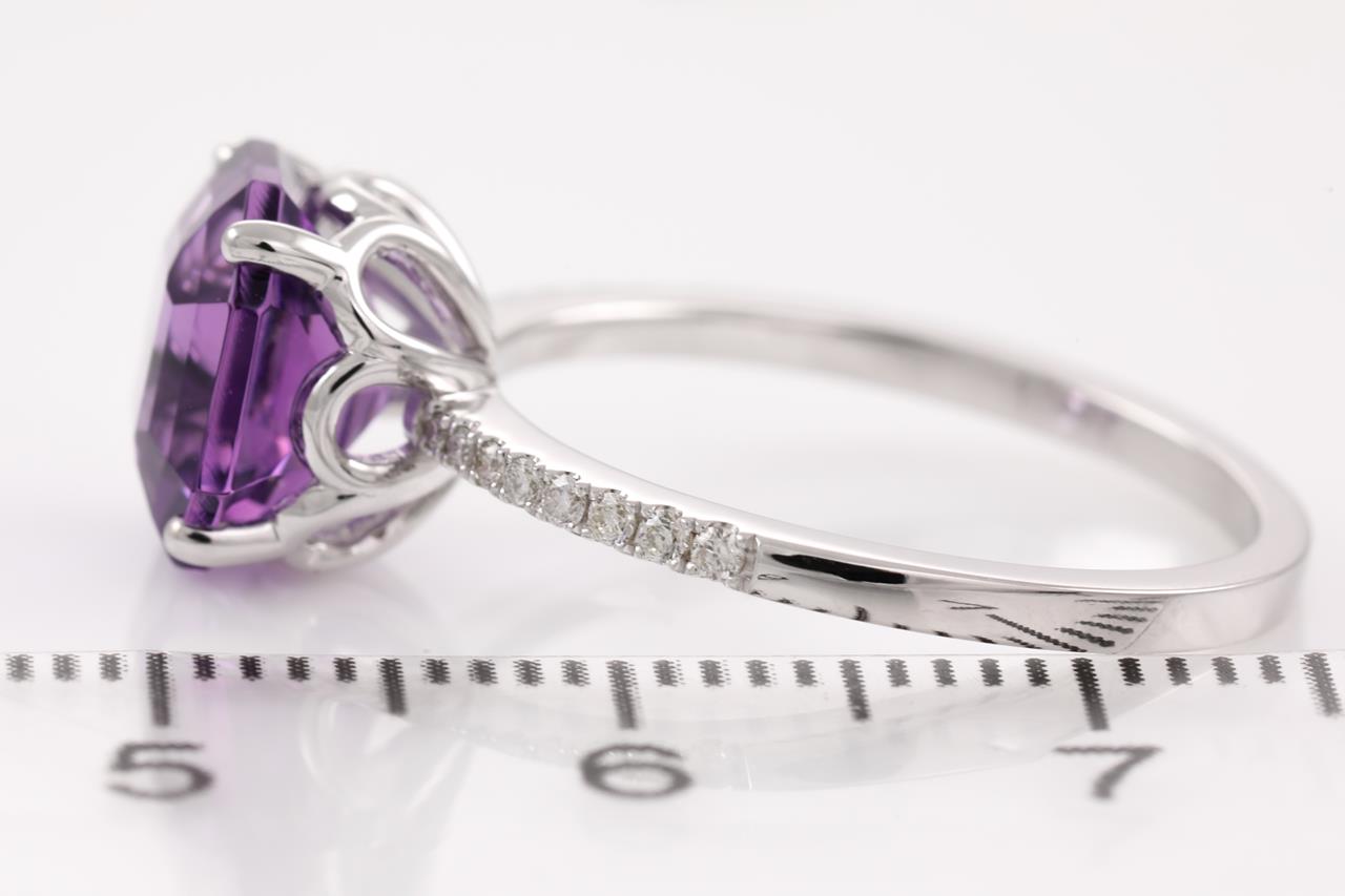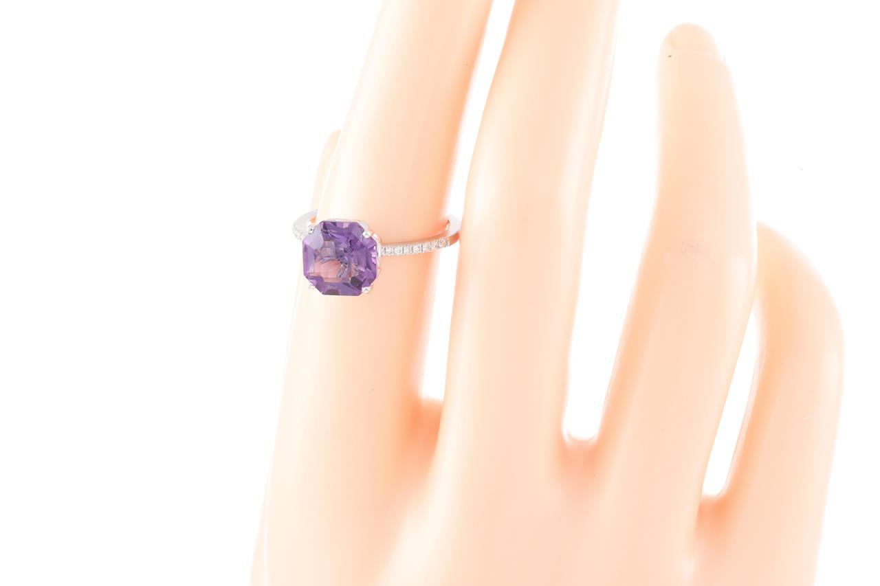 Amethyst and Diamond ring with an octagonal cut Amethyst of 2.85ct and Diamonds totalling 0.10cts. 14ct white gold. Ring size N - ring resizing is not recommended. Weight: 2.8g. (New)