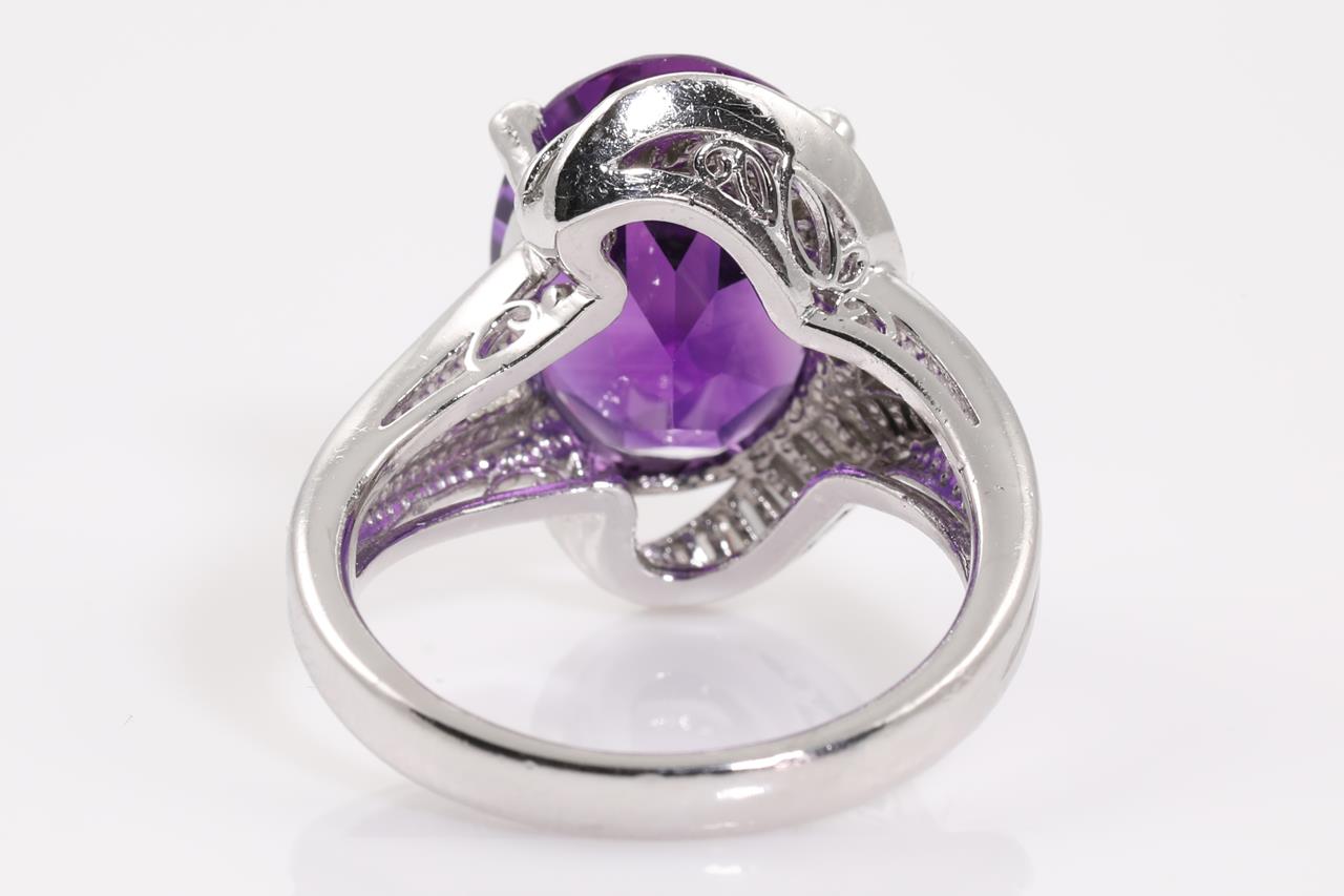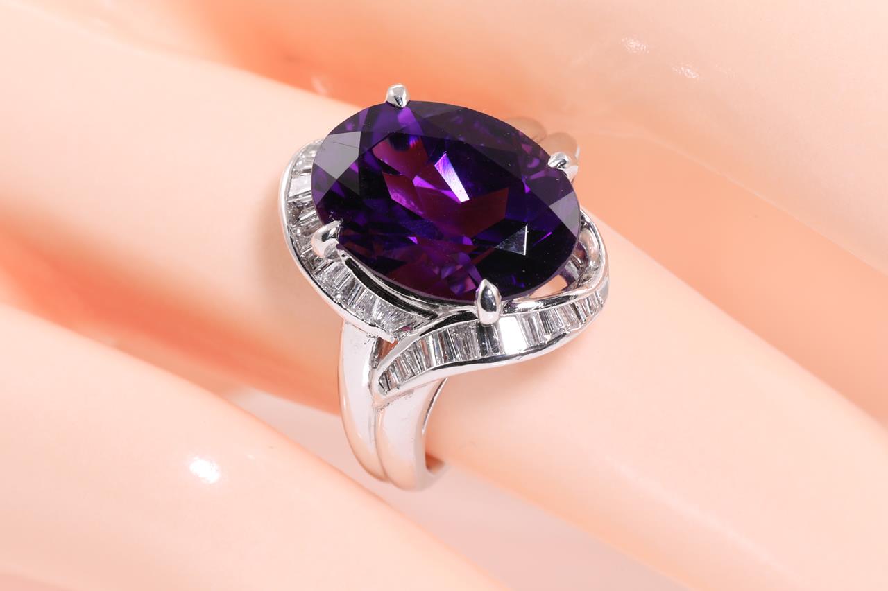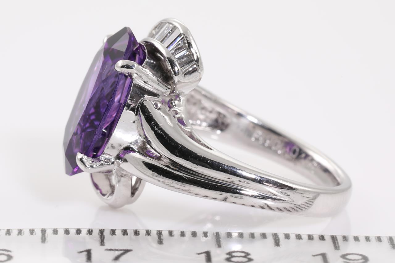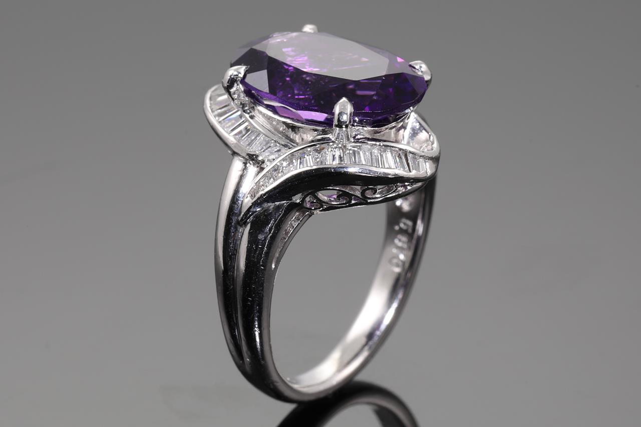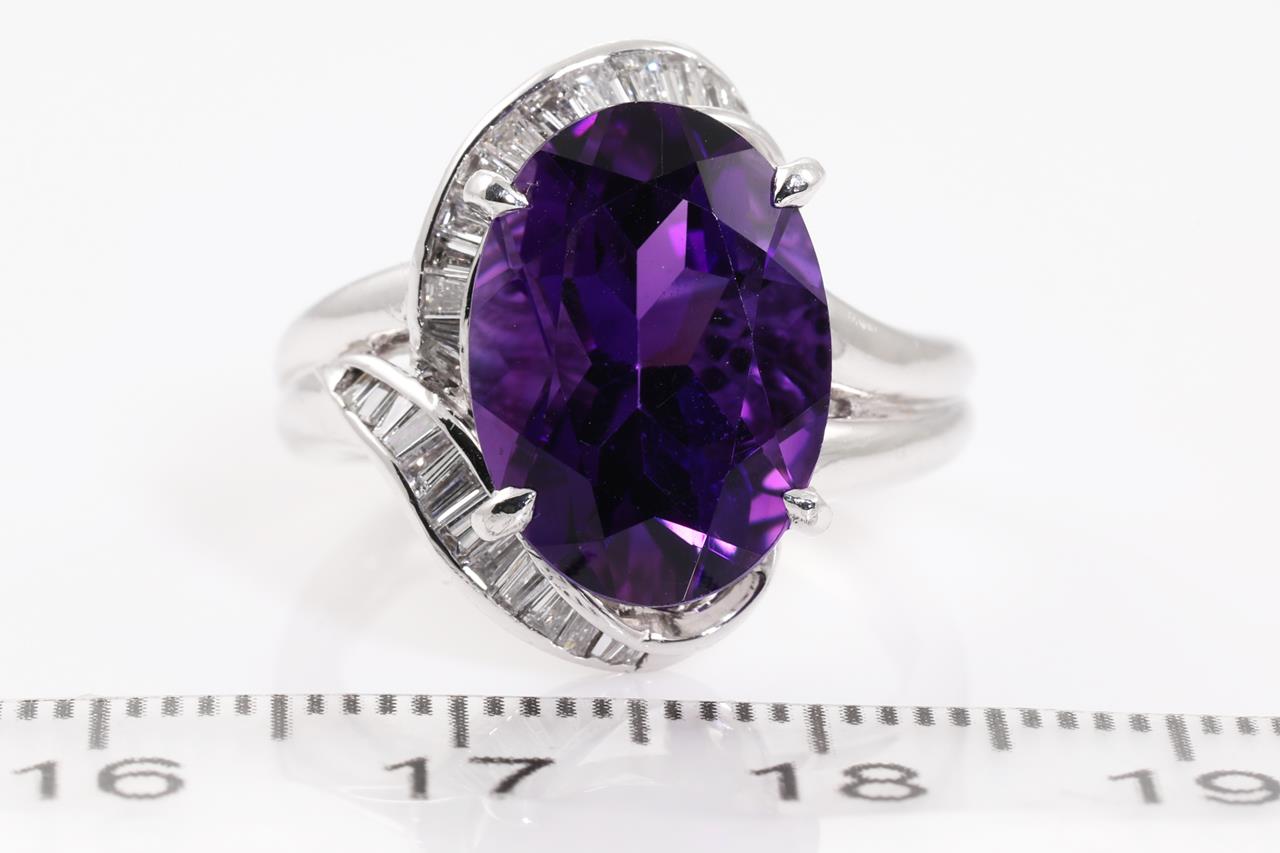 Amethyst and Diamond ring with centre oval shape Amethyst of 5.57ct and baguette cut Diamonds totalling 0.44cts (Estimated grading: G SI). Platinum. Ring size: K. Weight: 9.6g. (Pre-owned)
