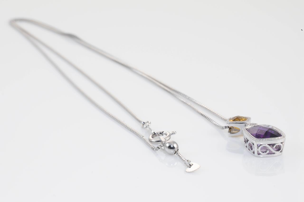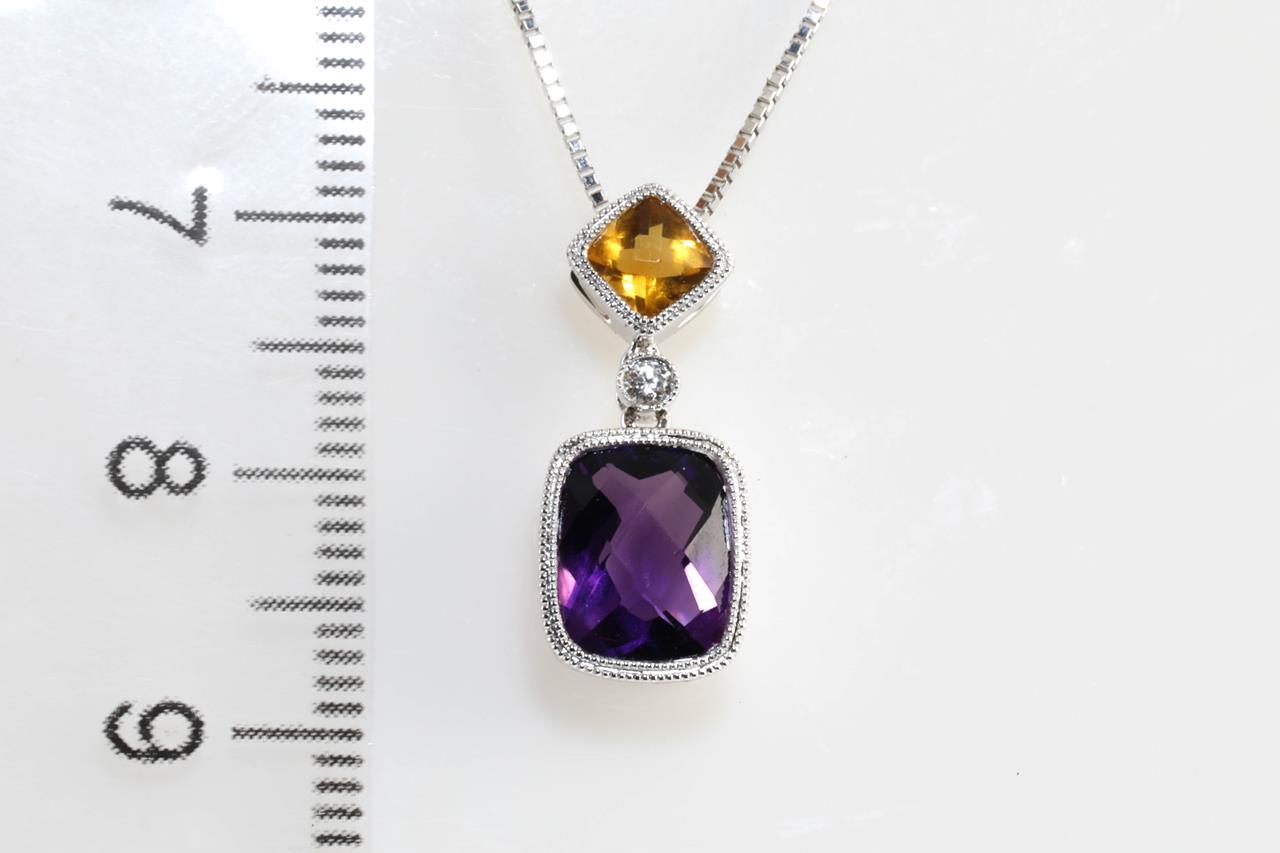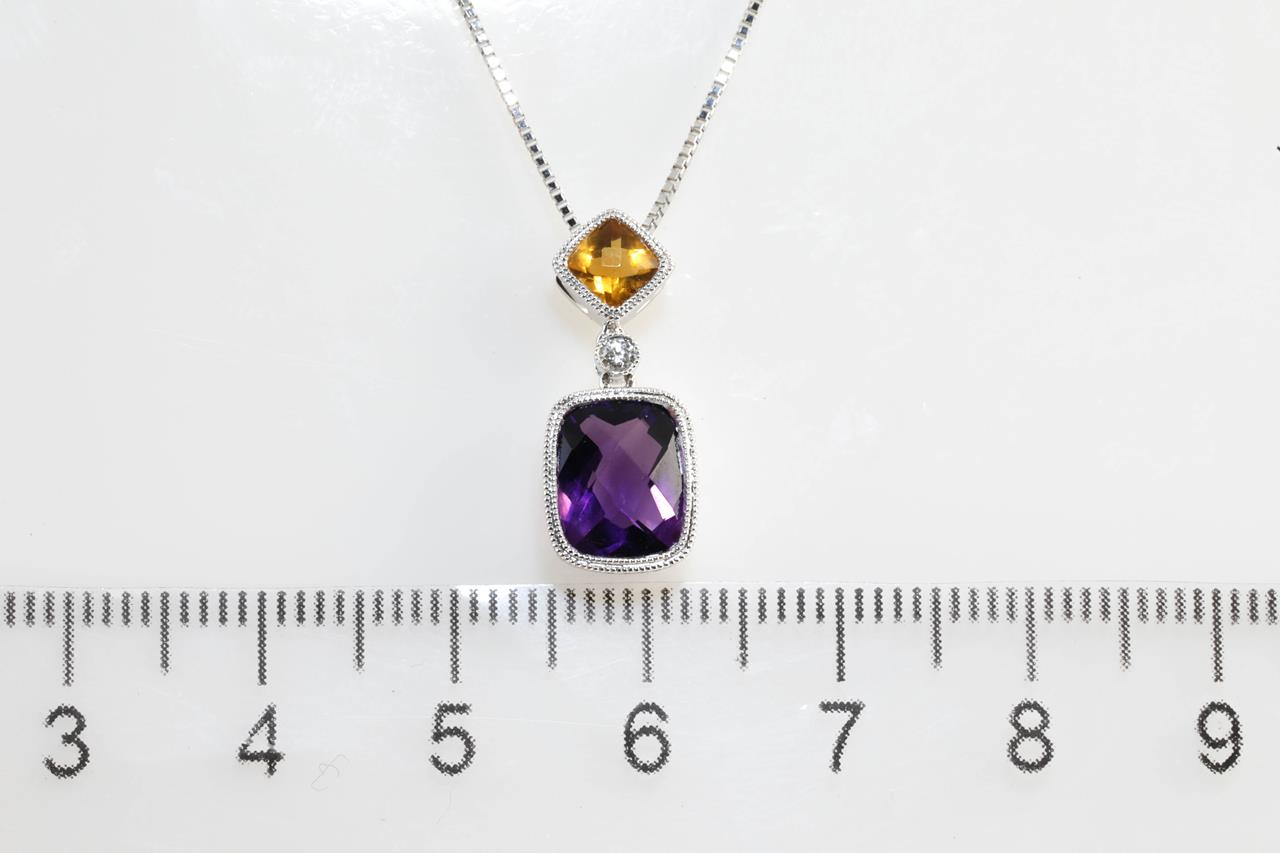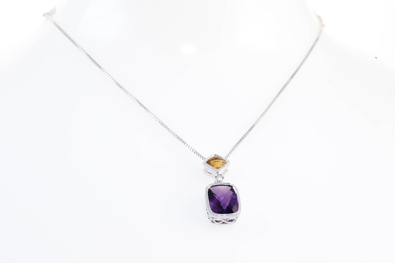 Amethyst, Citrine and Diamond pendant with cushion cut Amethyst of 1.47ct, cushion cut Citrine of 0.30ct and Diamond of 0.02ct. 14ct white gold with 18ct gold adjustable 45cm chain. Weight: 5.0g (New)