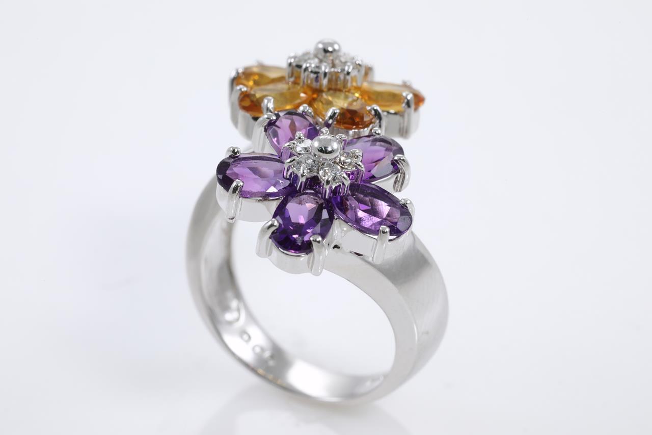 Amethyst, Citrine and Diamond flower design ring with oval Amethysts of approximately 1.65ct, oval Citrines of approximately 1.75cts and Diamonds totalling 0.06cts. 18ct white gold. 9.9g. Ring size M. (Pre-owned)