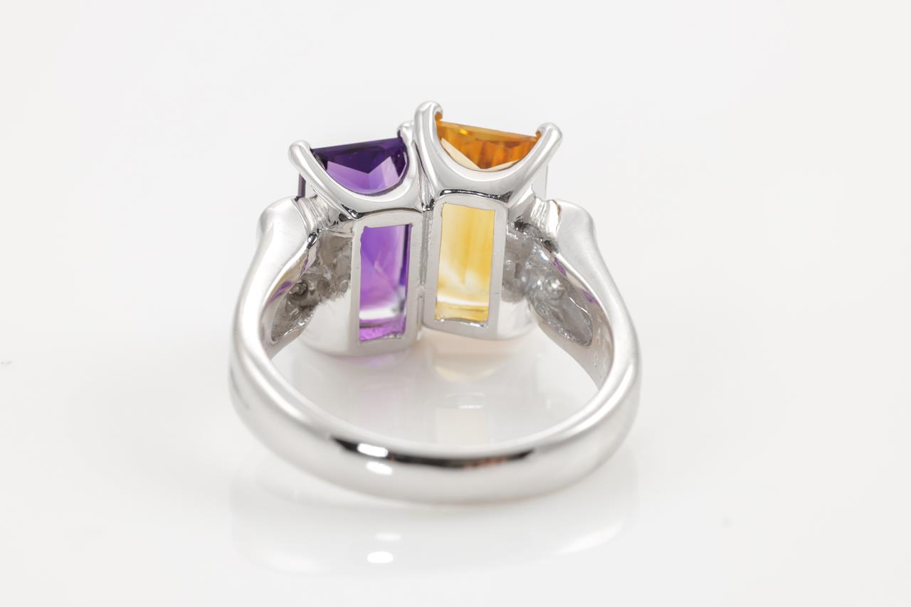 Amethyst, Citrine and Diamond ring with a rectangular Amethyst of 1.71ct & Citrine of 1.76ct and Diamonds totalling 0.08cts. Platinum. Ring size K1/2 - ring resizing is not recommended. Weight: 9.5g (Pre-owned)
