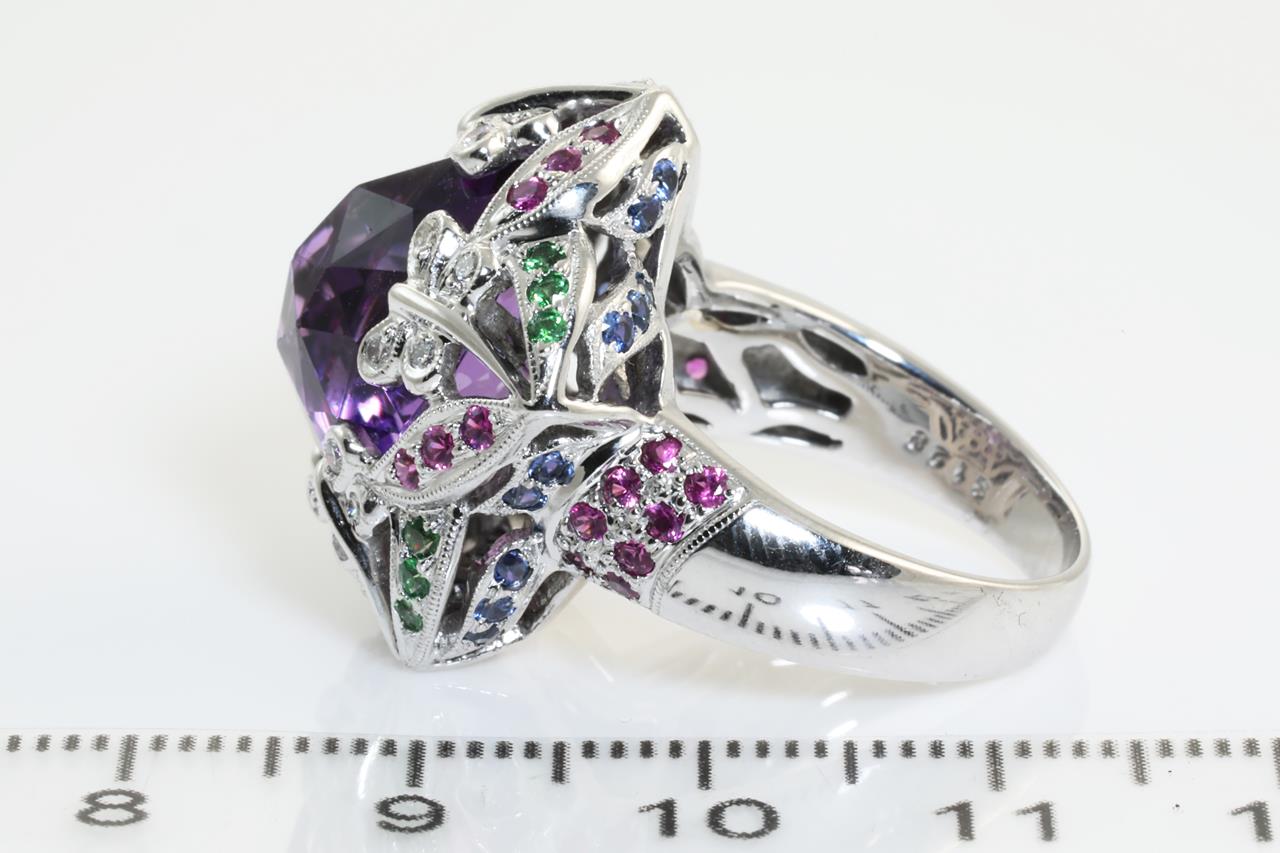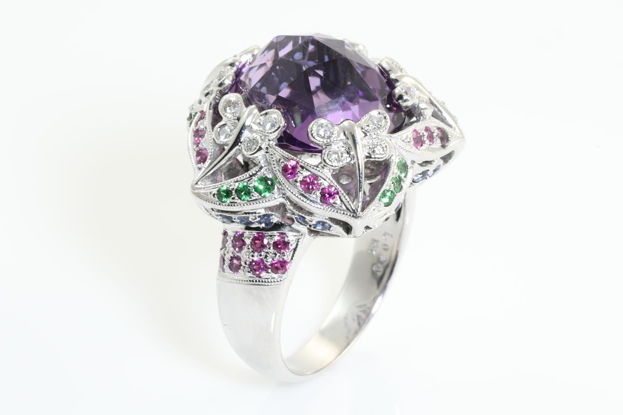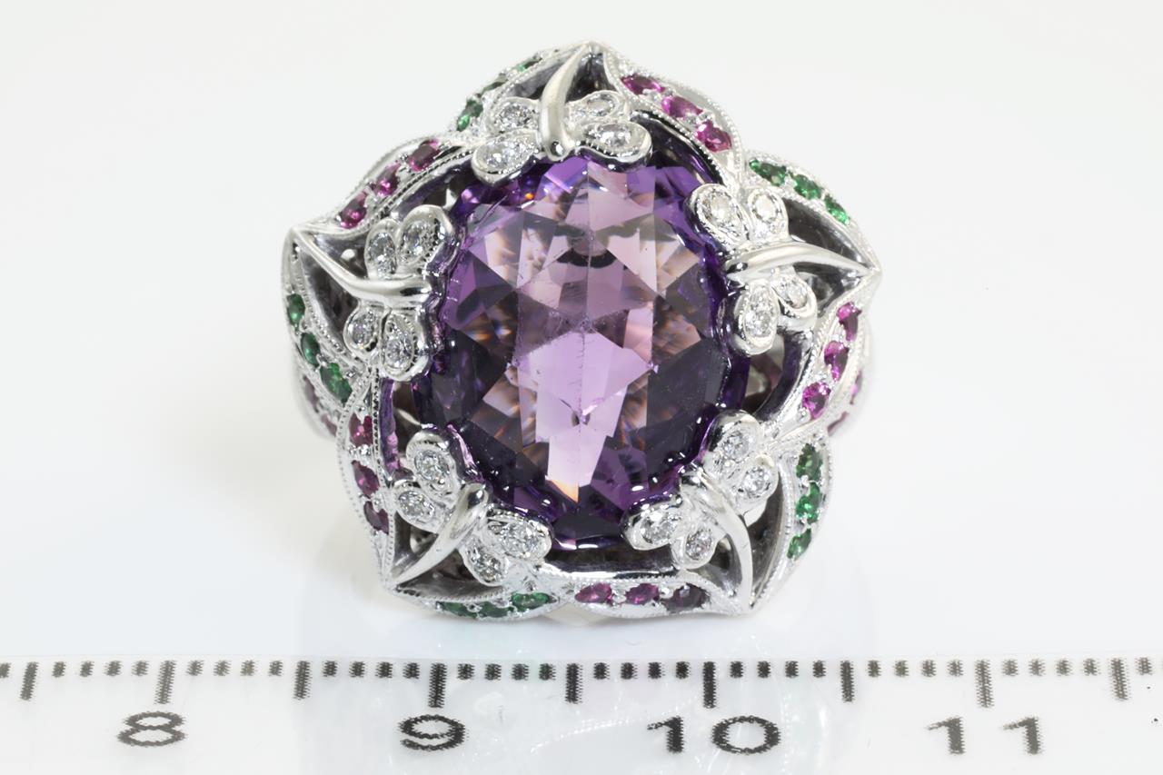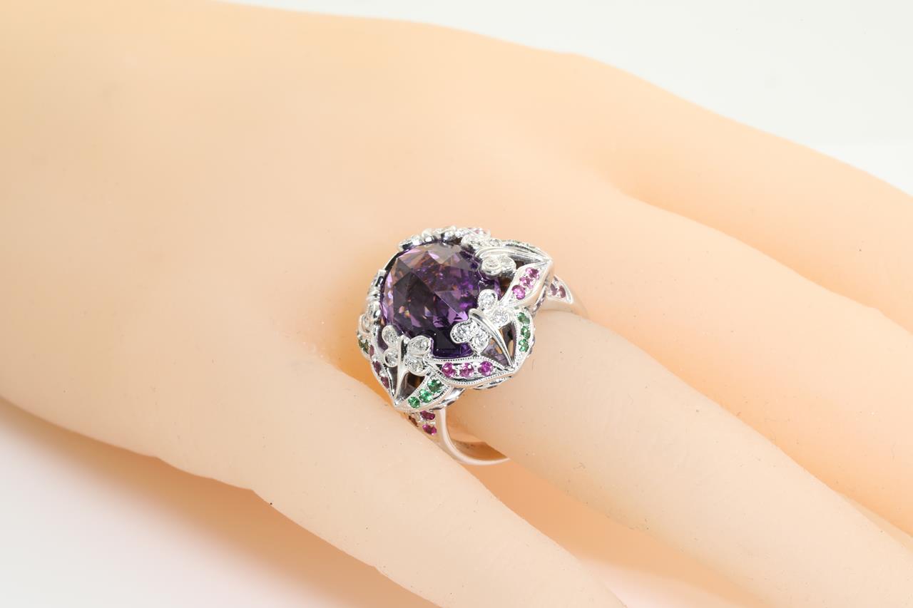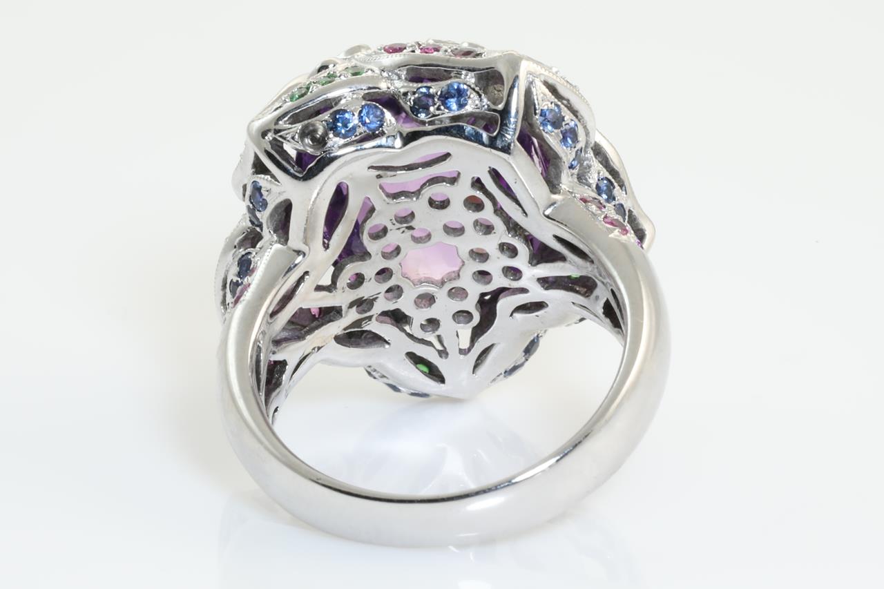 Amethyst ring with pink & blue Sapphires totalling 1.28cts (note 1 blue Sapphire missing), Diamonds totalling 0.20cts & Tsavorite Garnet. 18ct white gold. Ring size O - Ring resizing is not recommended. Weight: 13.3g (Pre-owned)