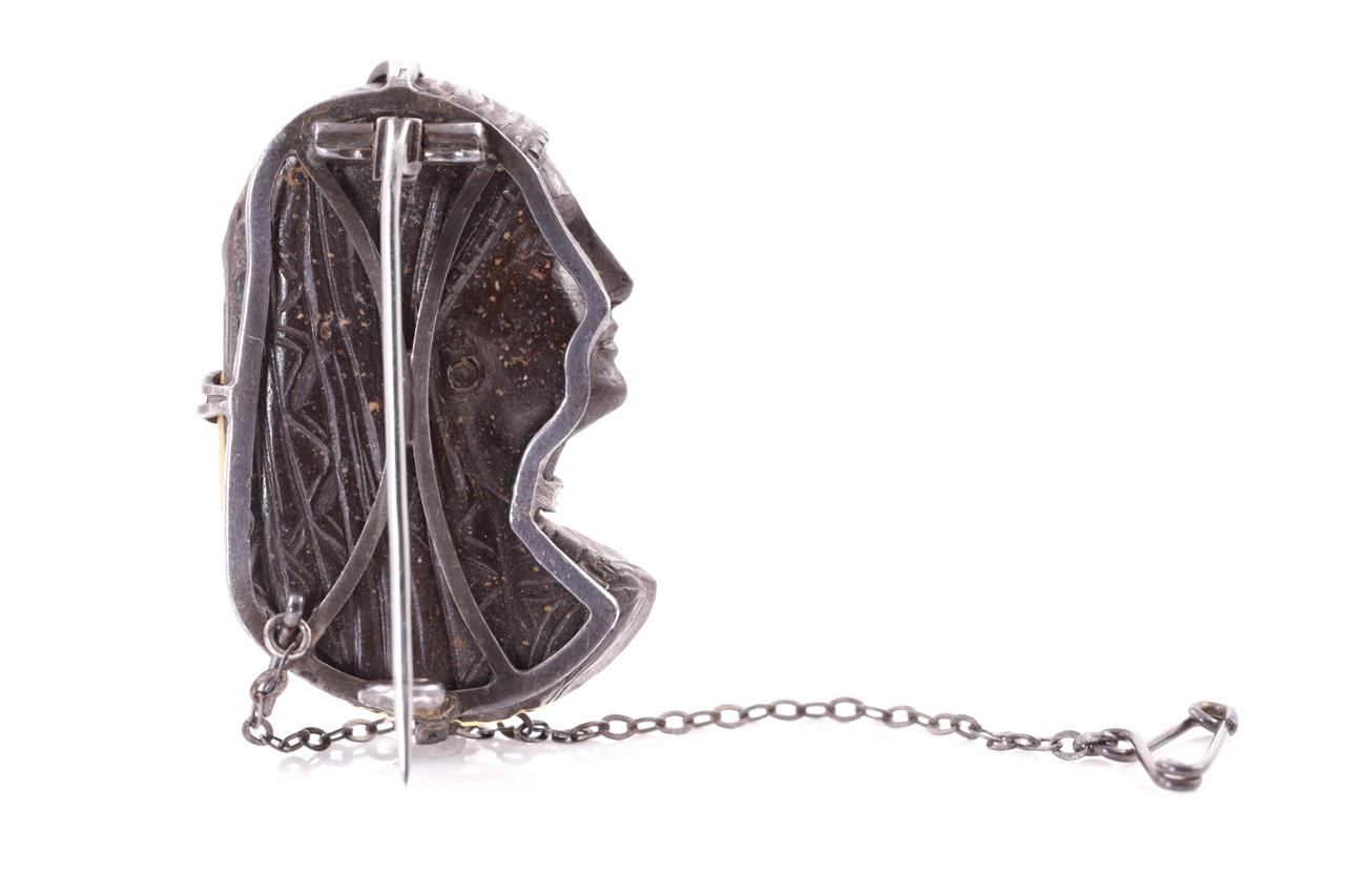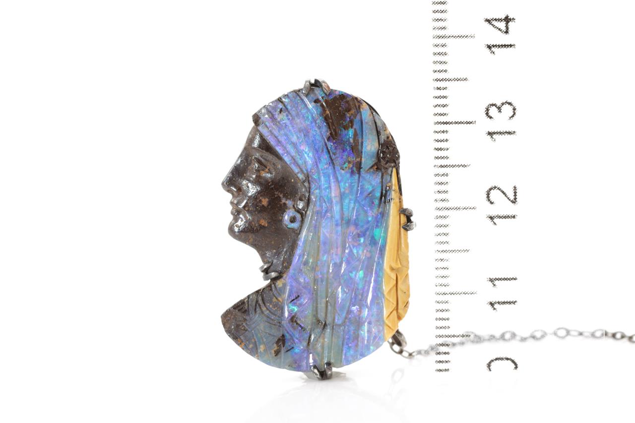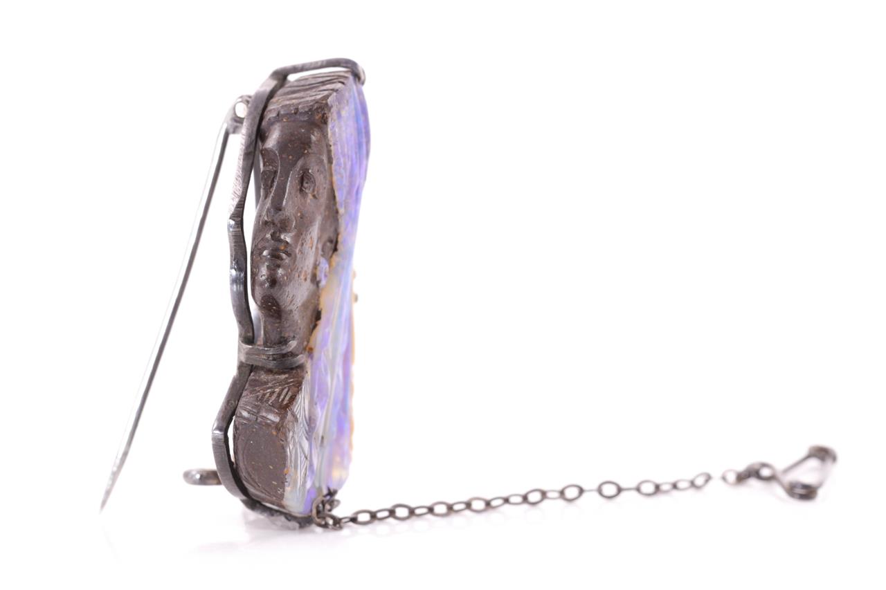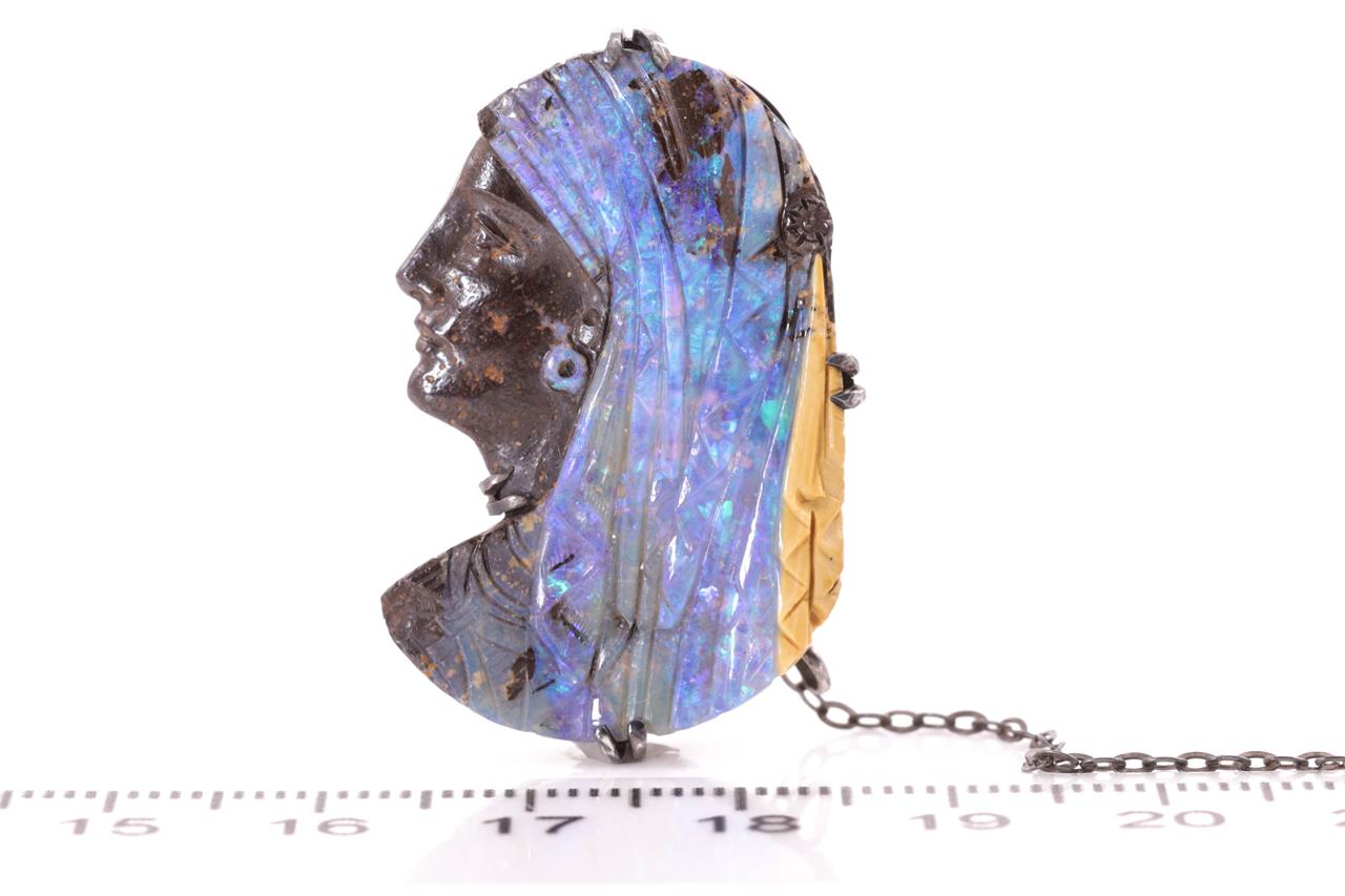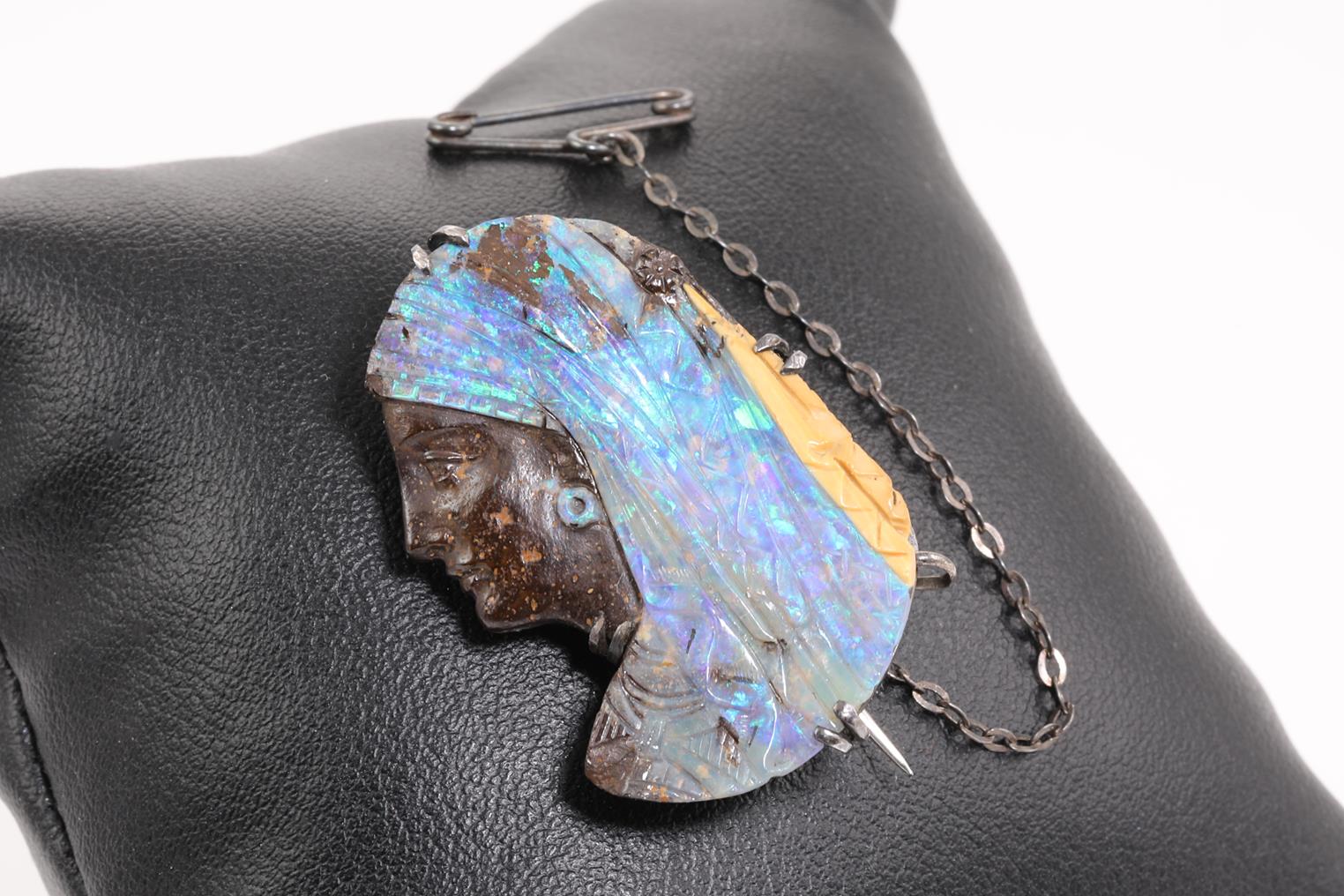 Antique Boulder Opal Brooch, the carved Boulder Opal carved recto and verso into a women profile. Sterling silver. Length 3.5cm. Weight 10g. (Pre-owned)