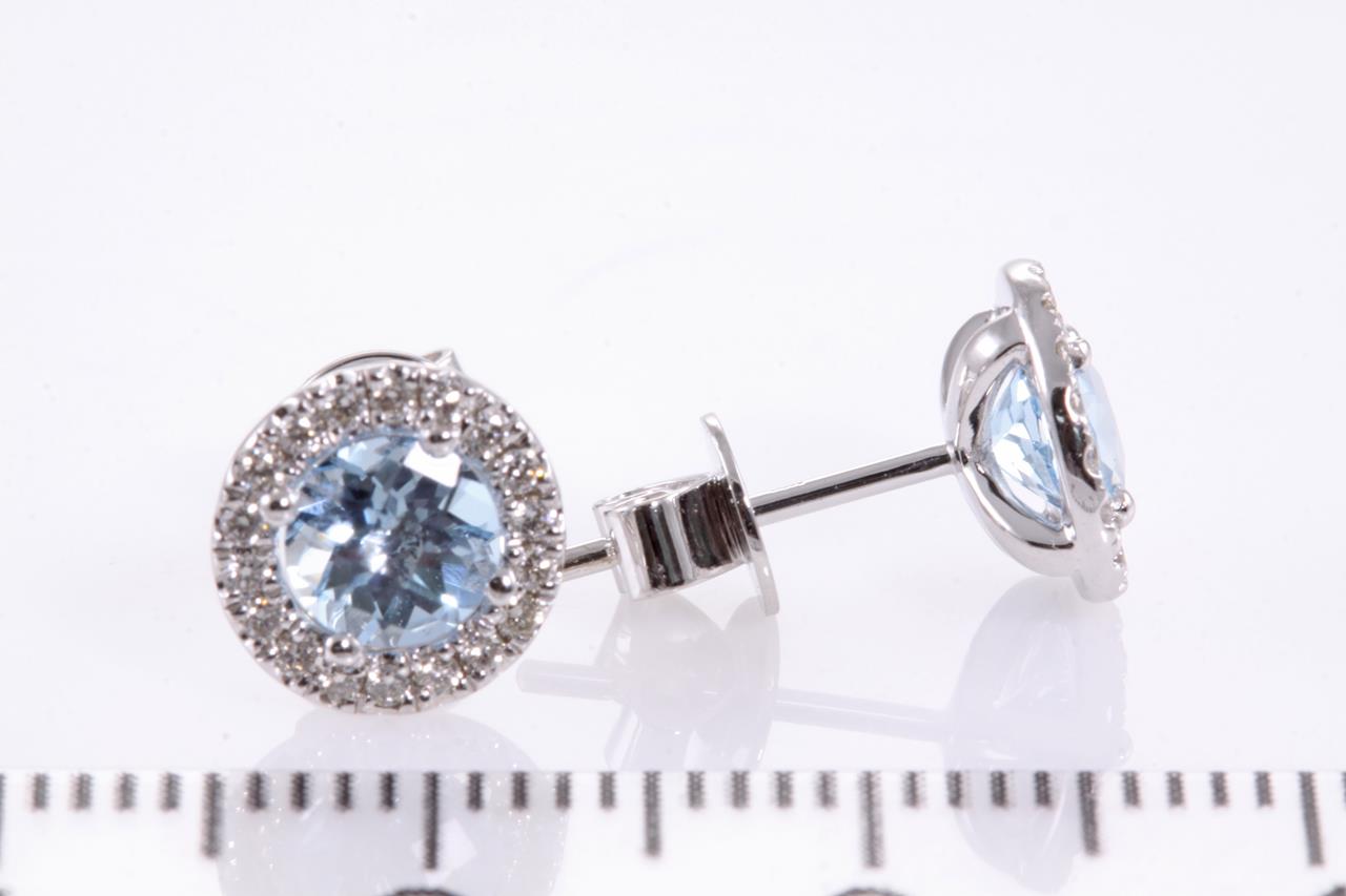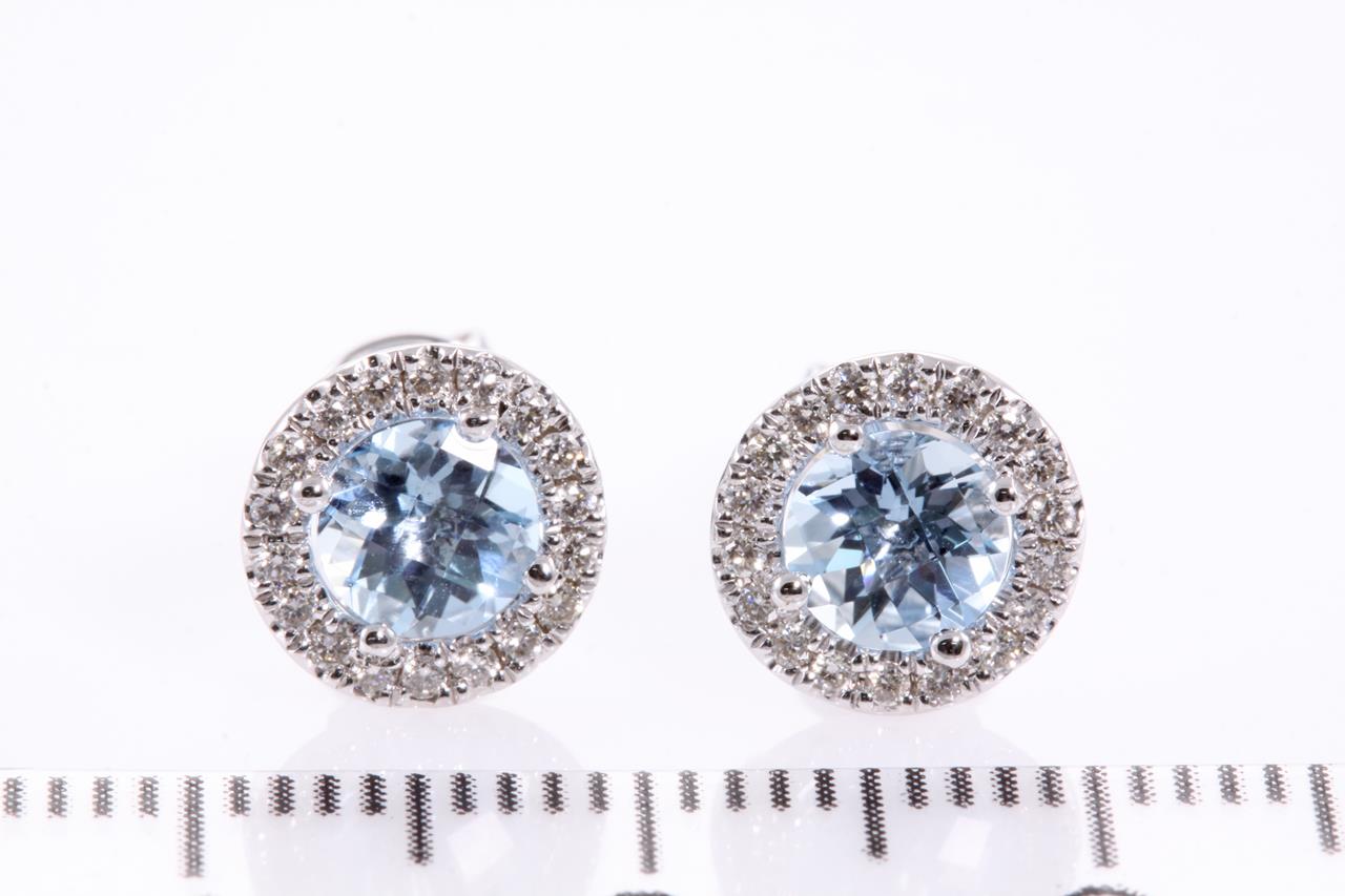 Aquamarine and Diamond Earrings with round checkerboard cut Aquamarine totalling 0.91cts and Diamonds totalling 0.19cts. 14ct white gold. (New)