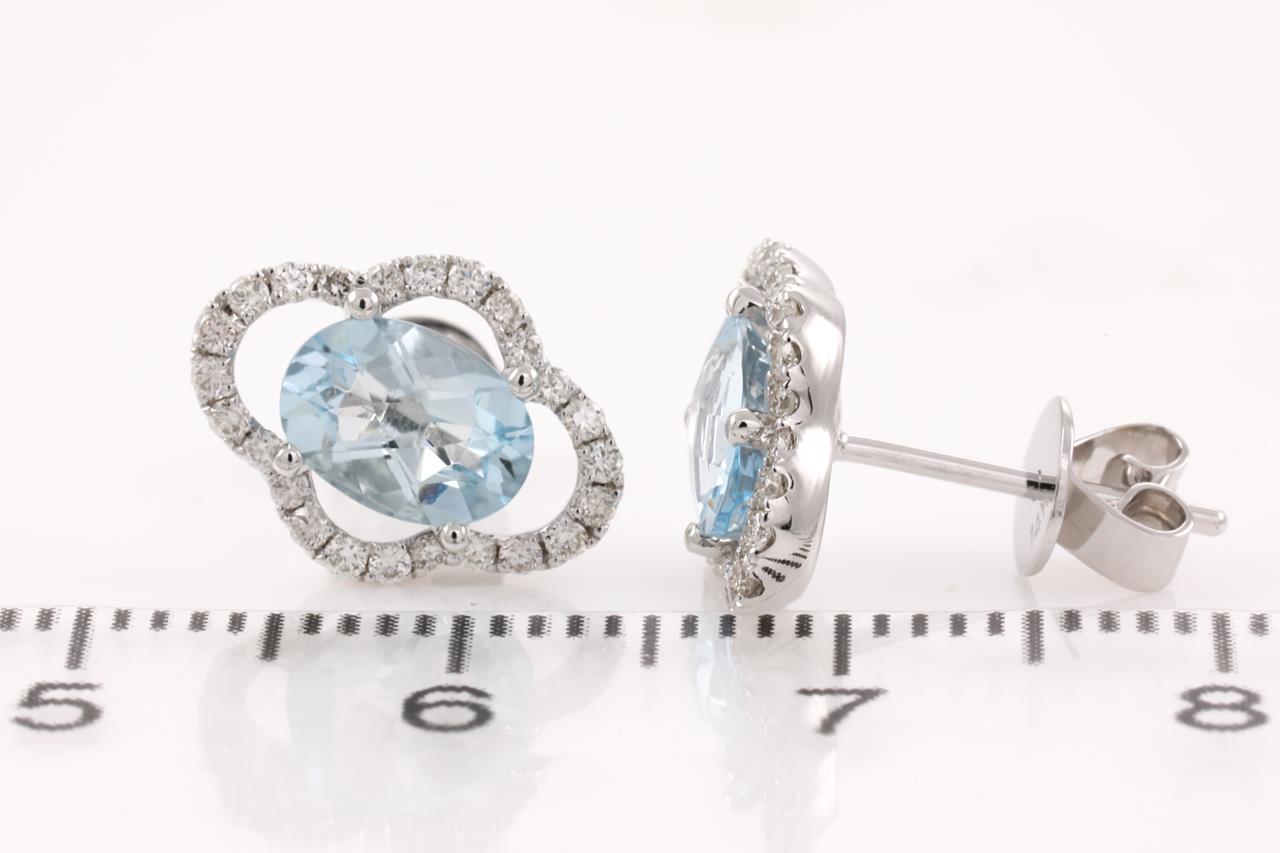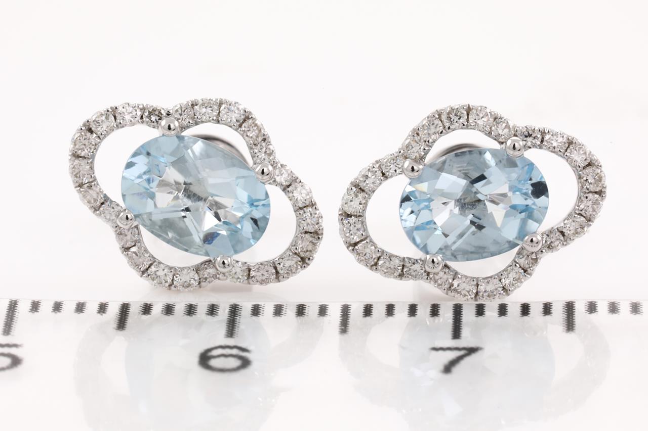 Aquamarine and Diamond earrings with oval Aquamarine totalling 1.35cts and Diamonds totalling 0.31cts (Estimated grading: H SI). 14ct white gold. Weight: 2.2g. (New)
