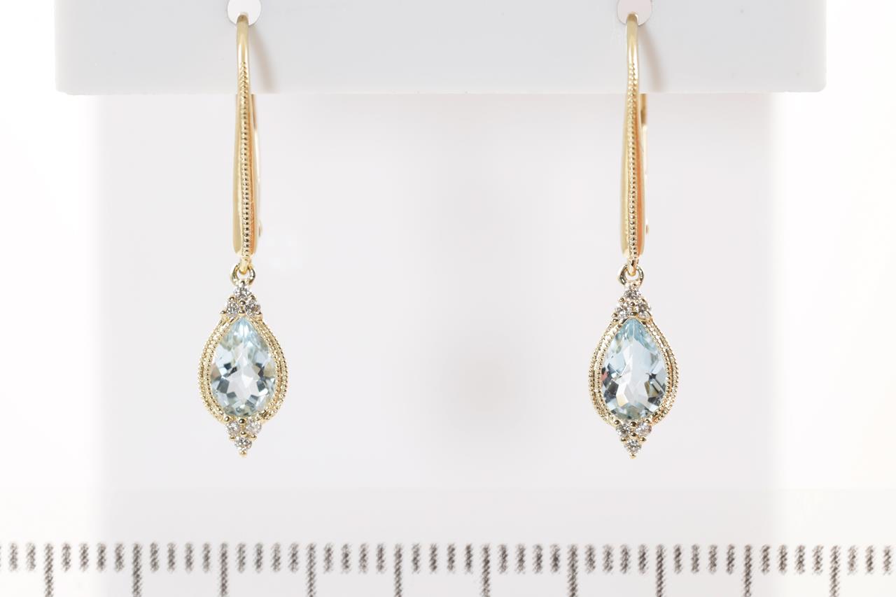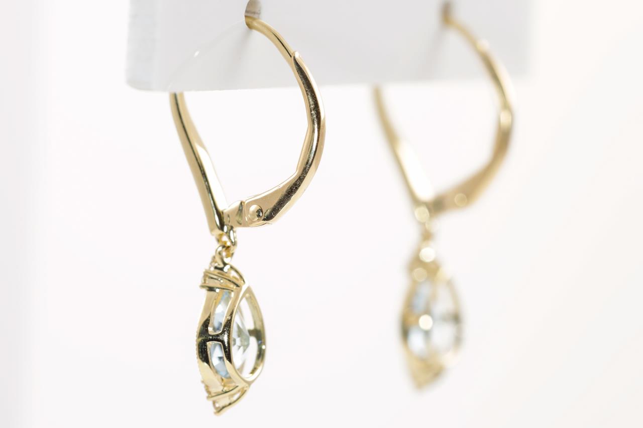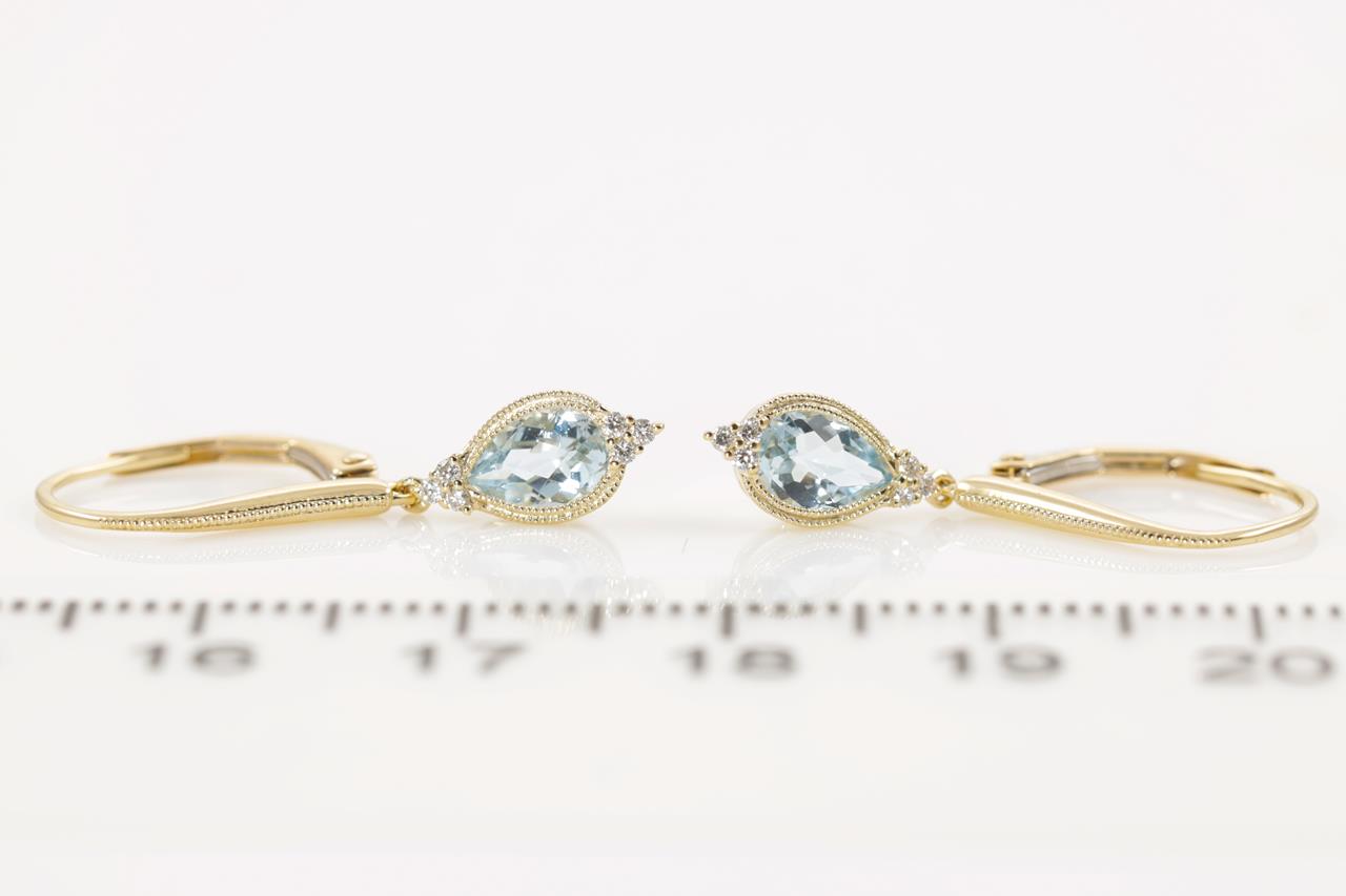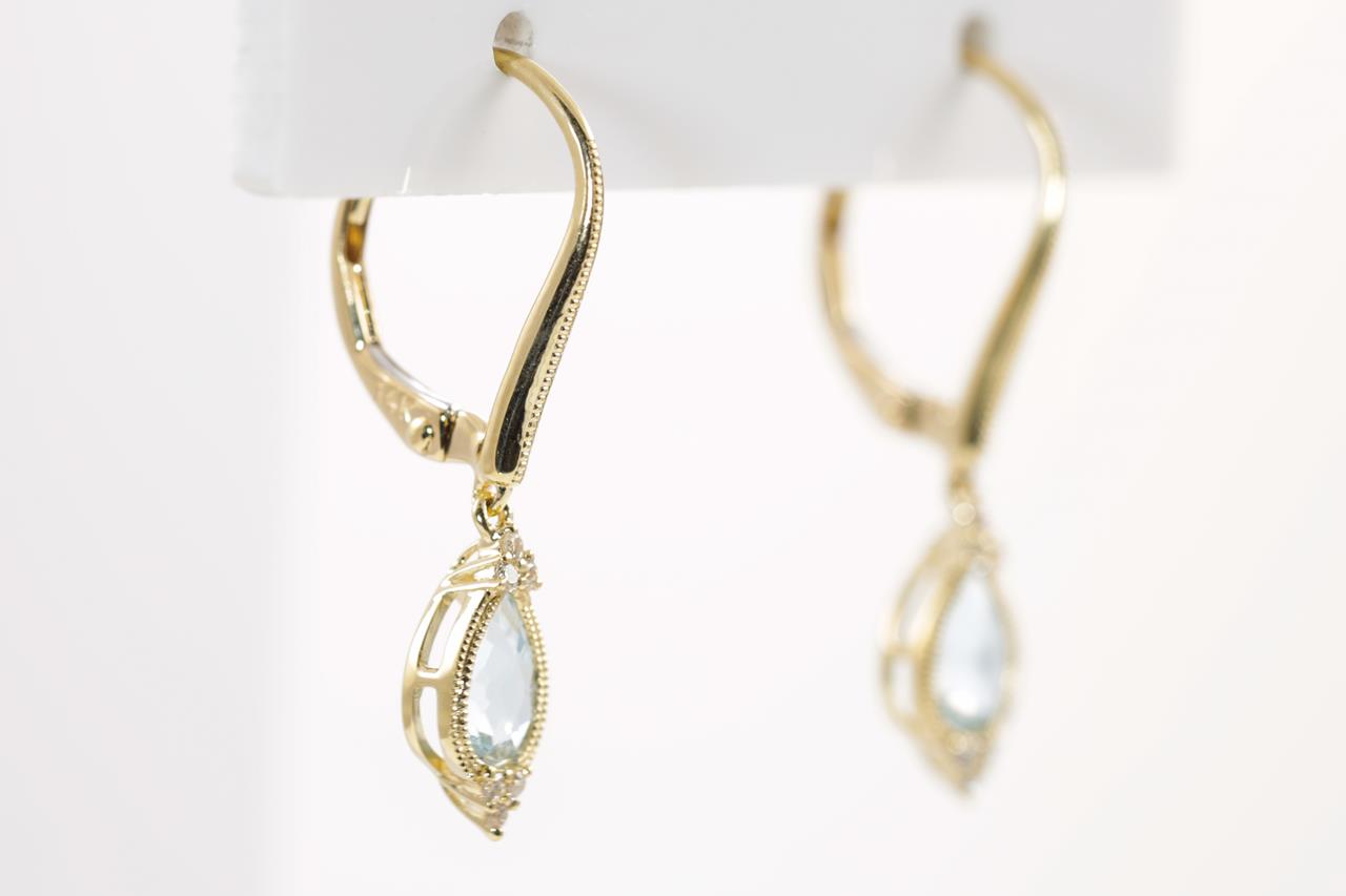 Aquamarine and Diamond leverback earrings with pear shape Aquamarine totalling 0.67cts and Diamonds totalling 0.06cts. 14ct yellow gold. Weight: 1.3g. (New)