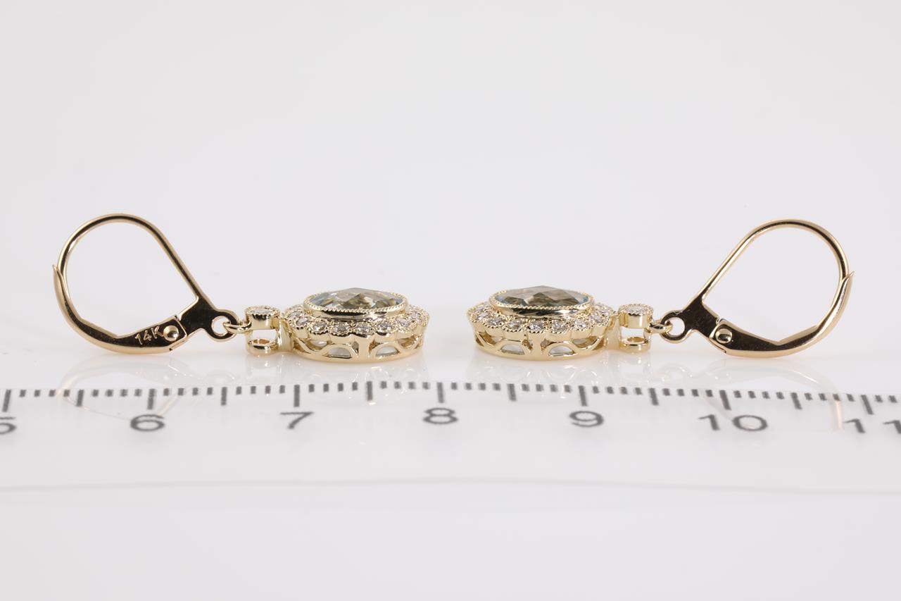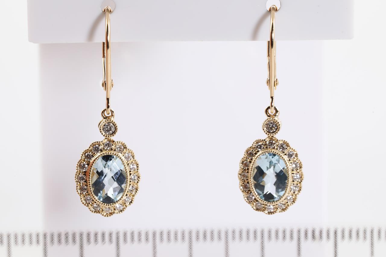 Aquamarine and Diamond leverback earrings with oval shape Aquamarine totalling 1.35cts and Diamonds totalling 0.24cts. 14ct yellow gold. Weight: 2.8g. (New)