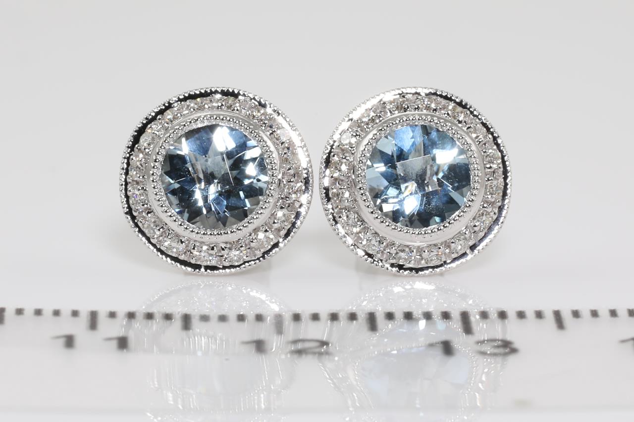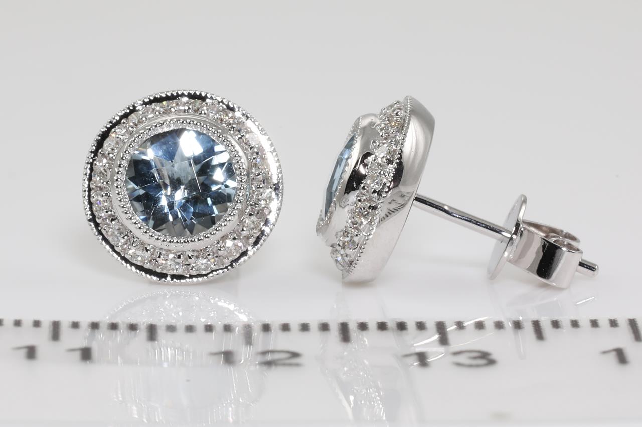 Aquamarine and Diamond earrings with round Aquamarine totalling 1.45cts and Diamonds totalling 0.25cts. 14ct white gold. Weight: 3.0g. (New)