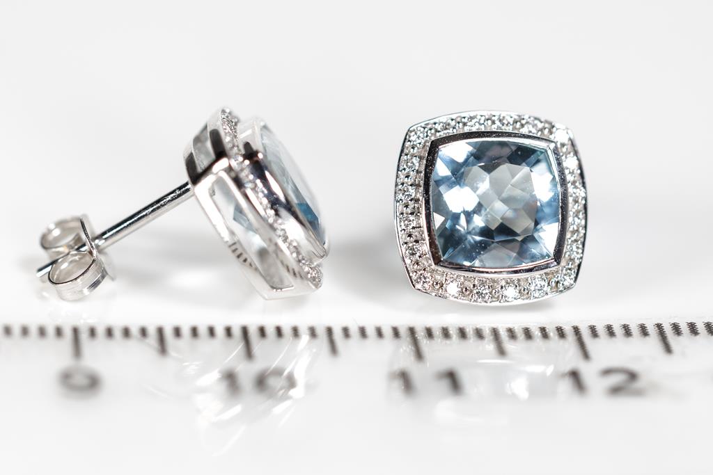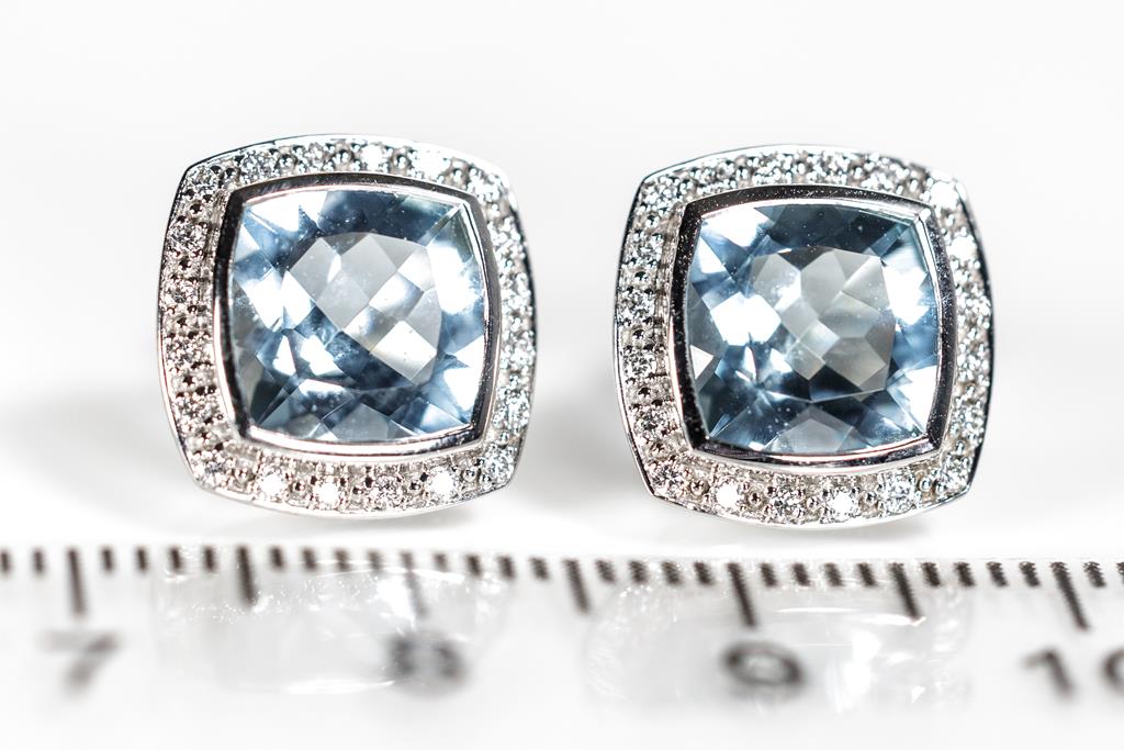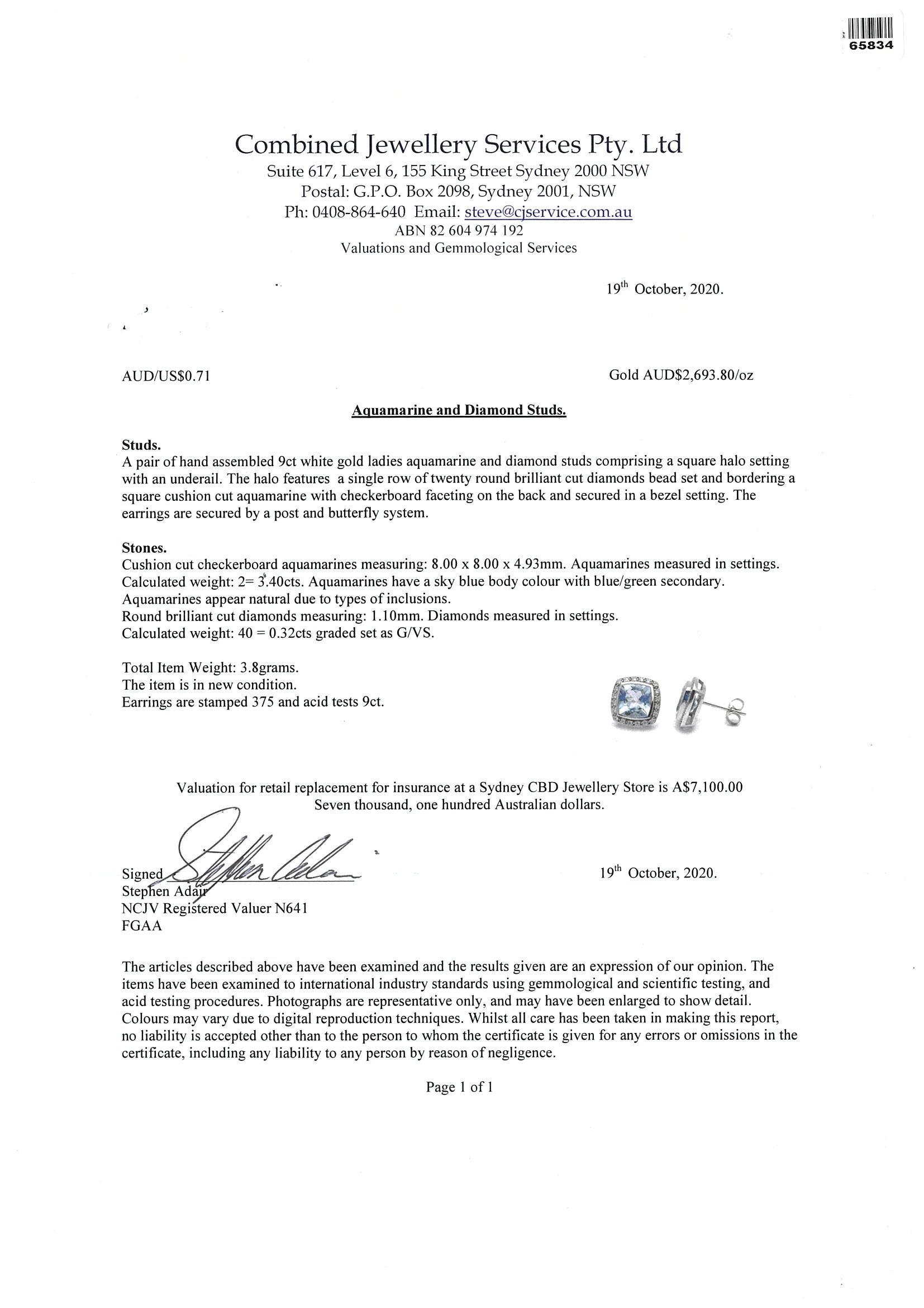 Aquamarine and Diamond Earrings with cushion cut Aquamarines totalling approximately 3.40cts and round Diamonds totalling approximately 0.32cts (Estimated grading: G VS). 9ct white gold. With valuation. Weight 3.8g. (Pre-owned)