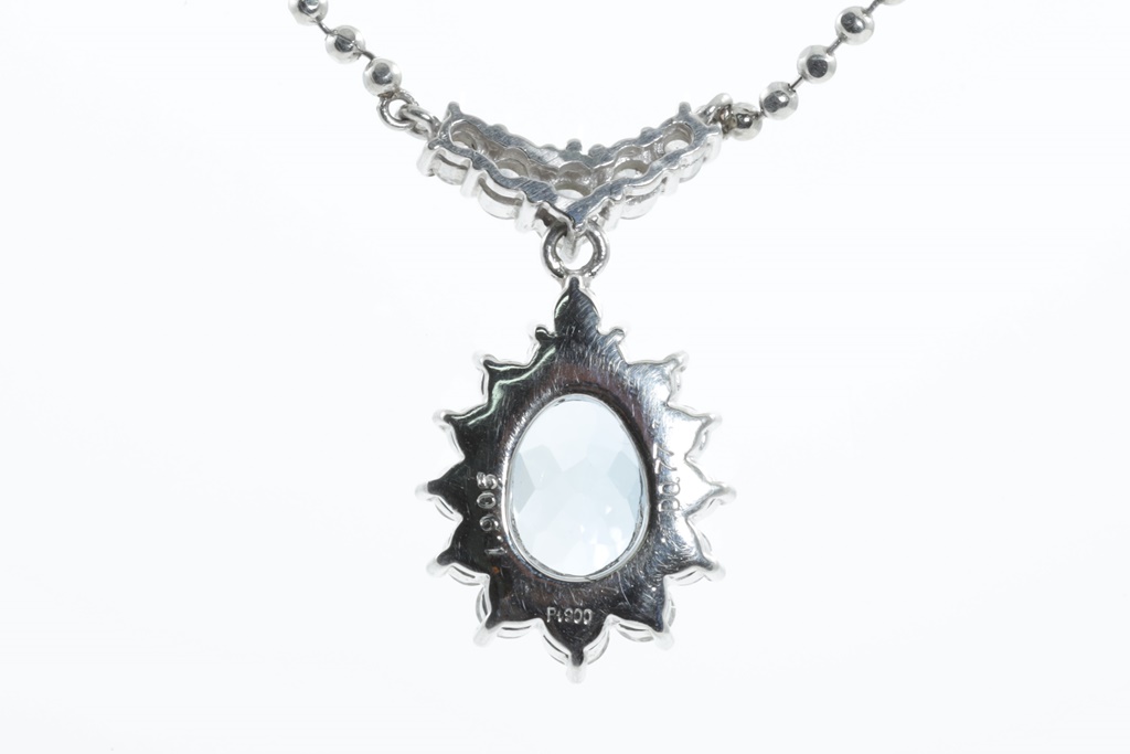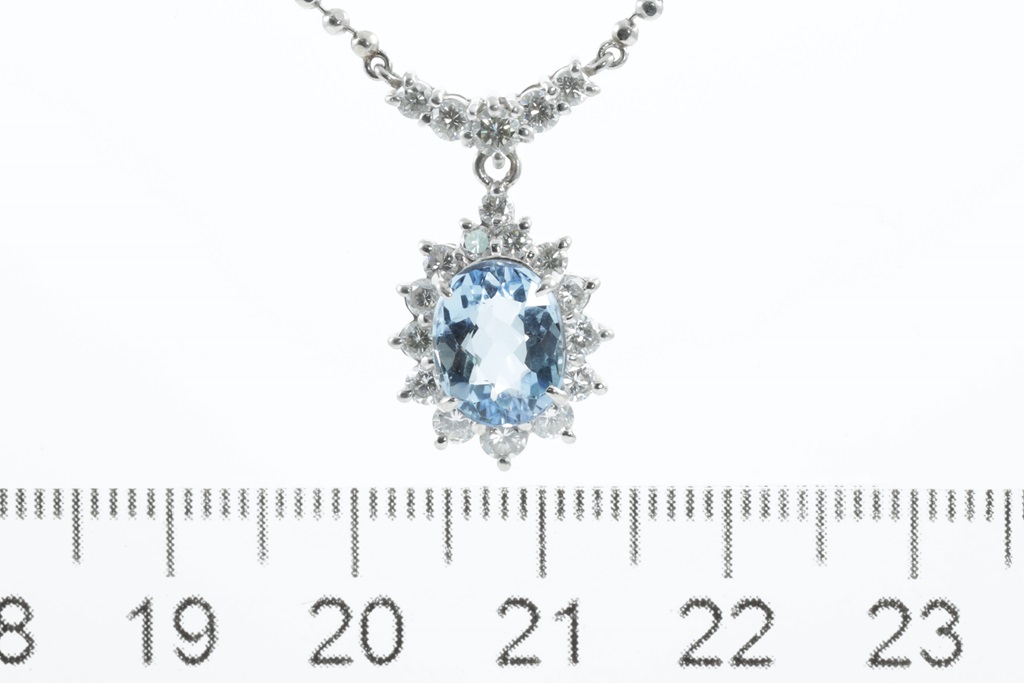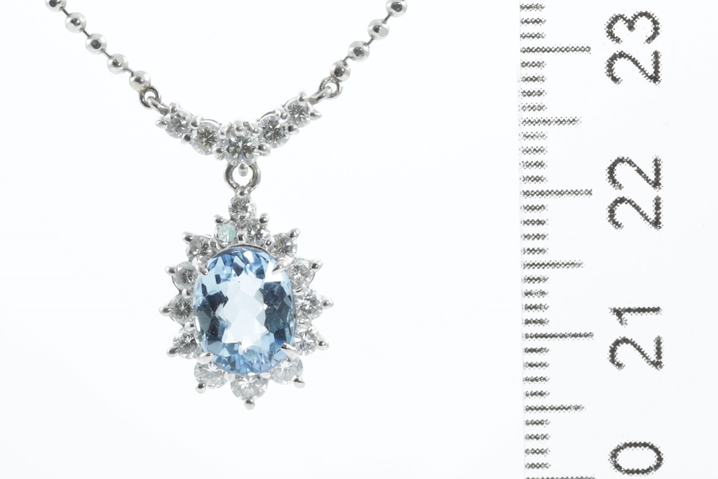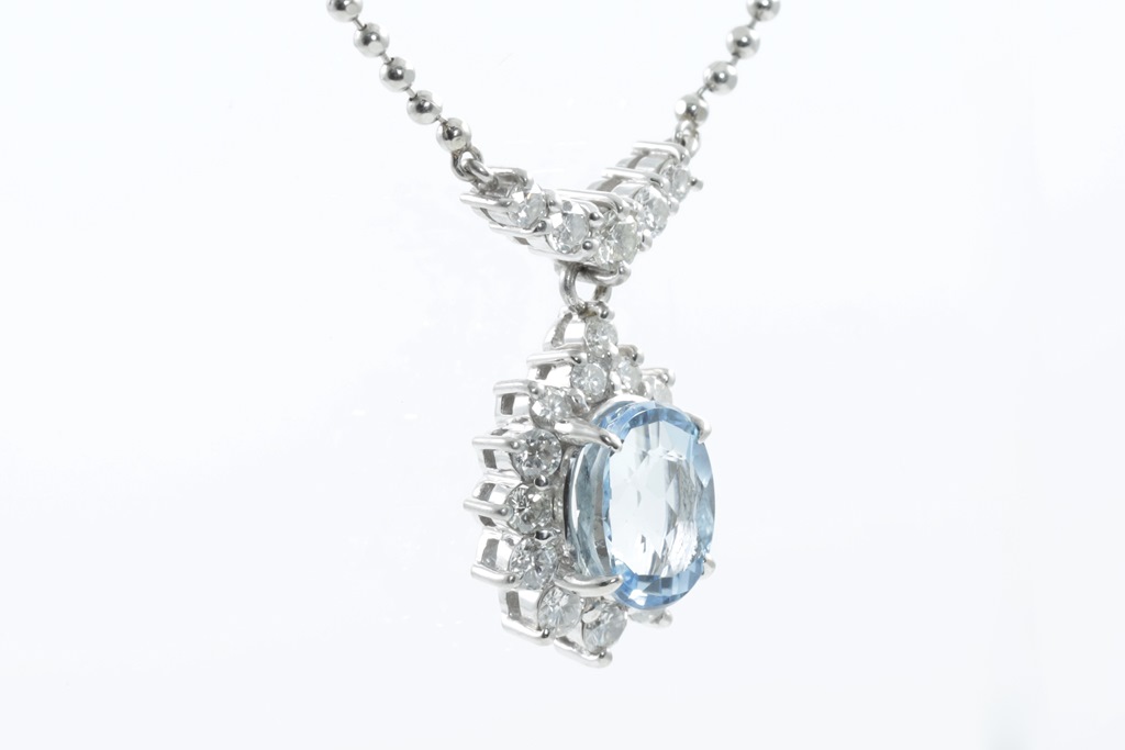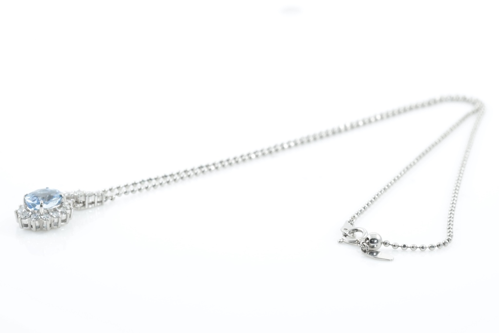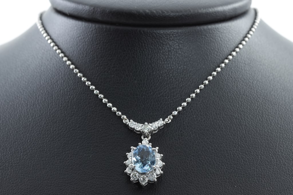 Aquamarine and Diamond necklace with centre oval shape Aquamarine of 1.90ct and round Diamonds totalling 0.77cts (Estimated grading: H SI). Platinum with attached chain. Adjustable max length: 45cm. Weight: 9.5g. (Pre-owned)