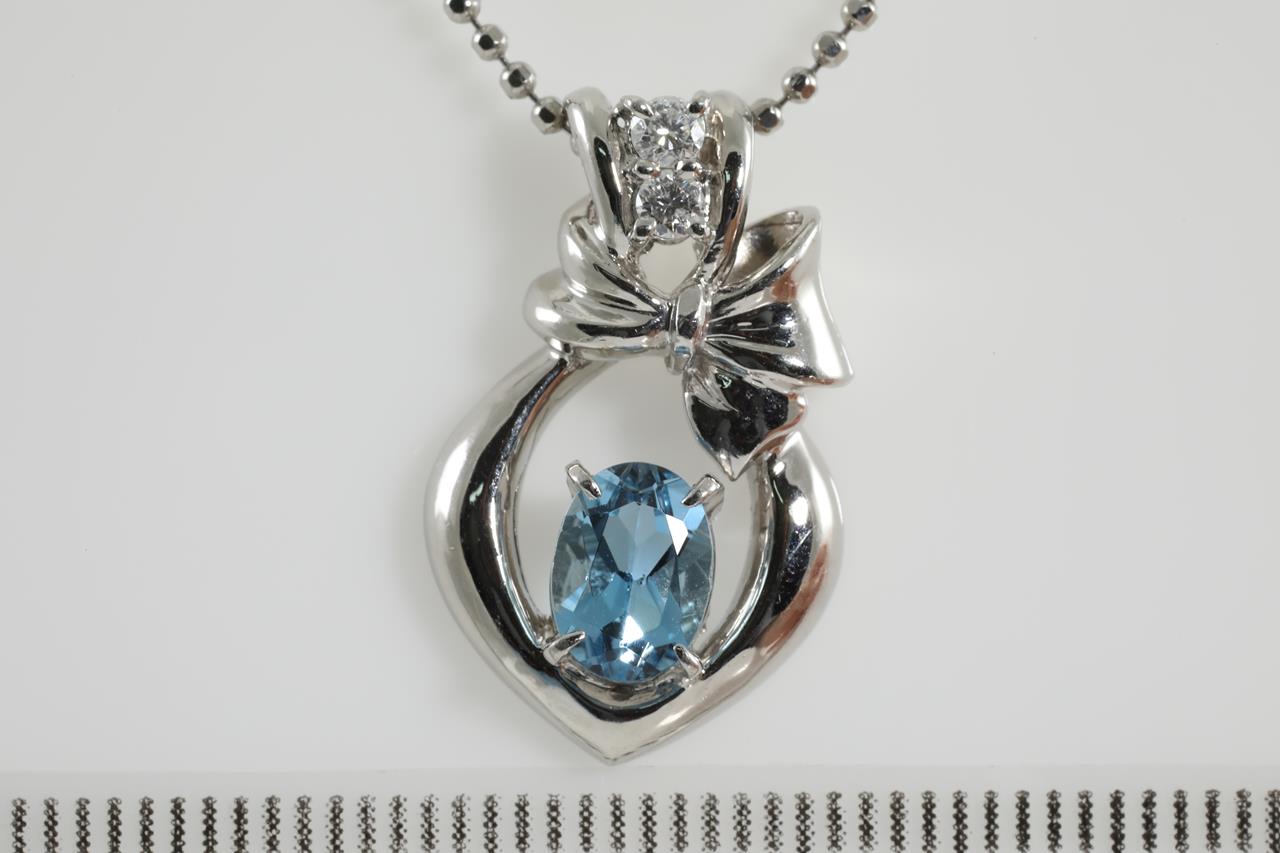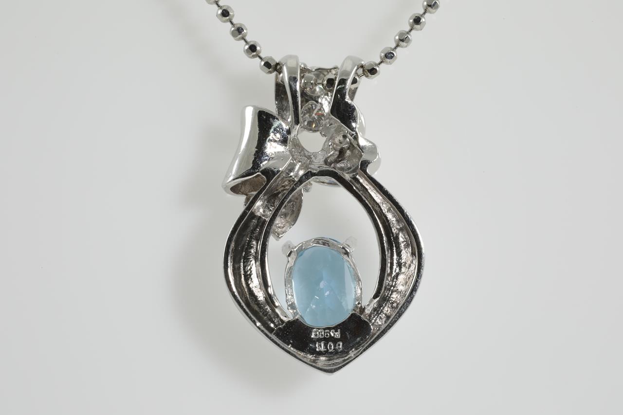 Aquamarine and Diamond pendant with an oval Aquamarine of 0.77ct and Diamonds totalling 0.11cts. Weight: 7.2g. Platinum with adjustable platinum 40cm chain. (Pre-owned)