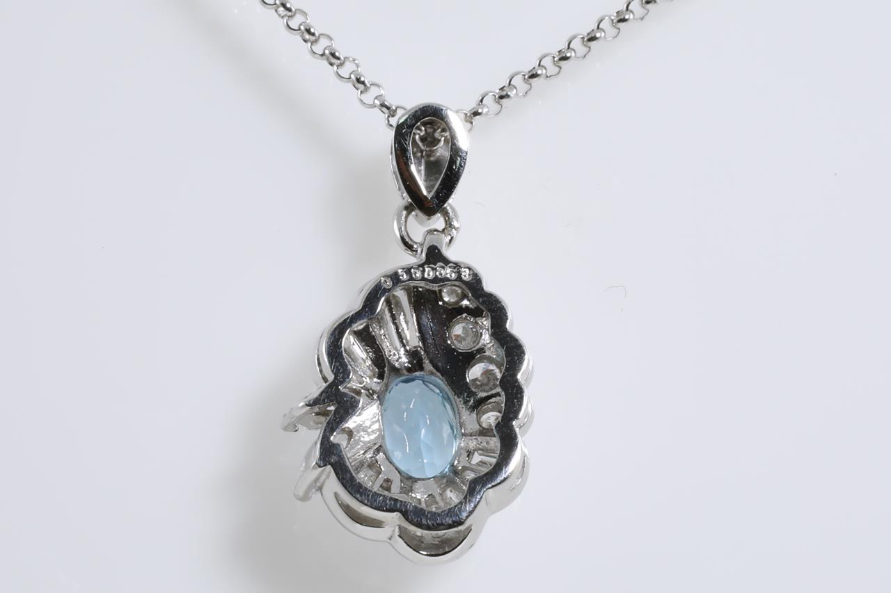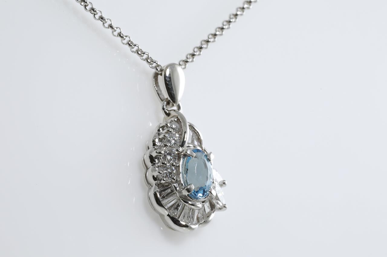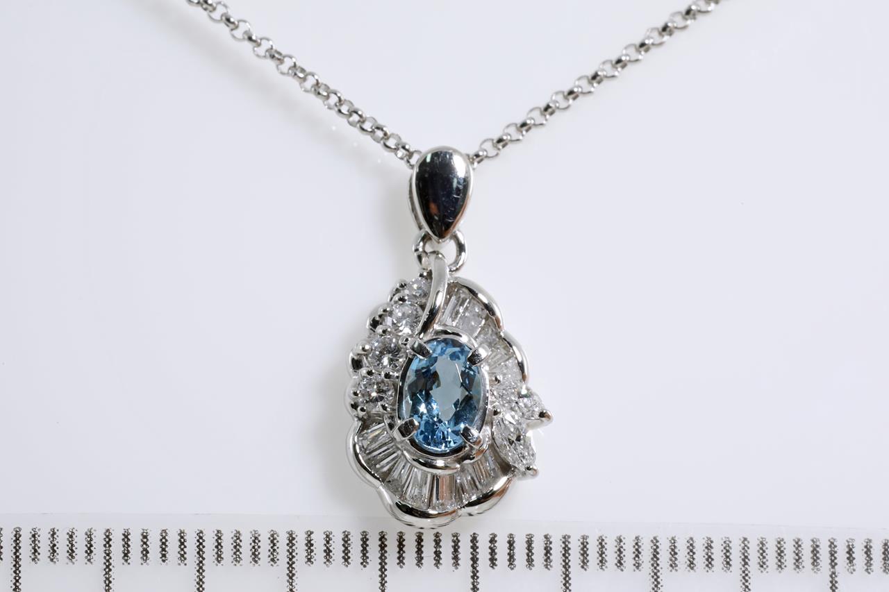Aquamarine and Diamond pendant with an oval Aquamarine of 0.50ct and round, marquise and baguette cut Diamonds totalling 0.53cts (Estimated grading: H-I SI-P1). Platinum with 40cm platinum adjustable chain. Weight: 6.4g (Pre-owned)