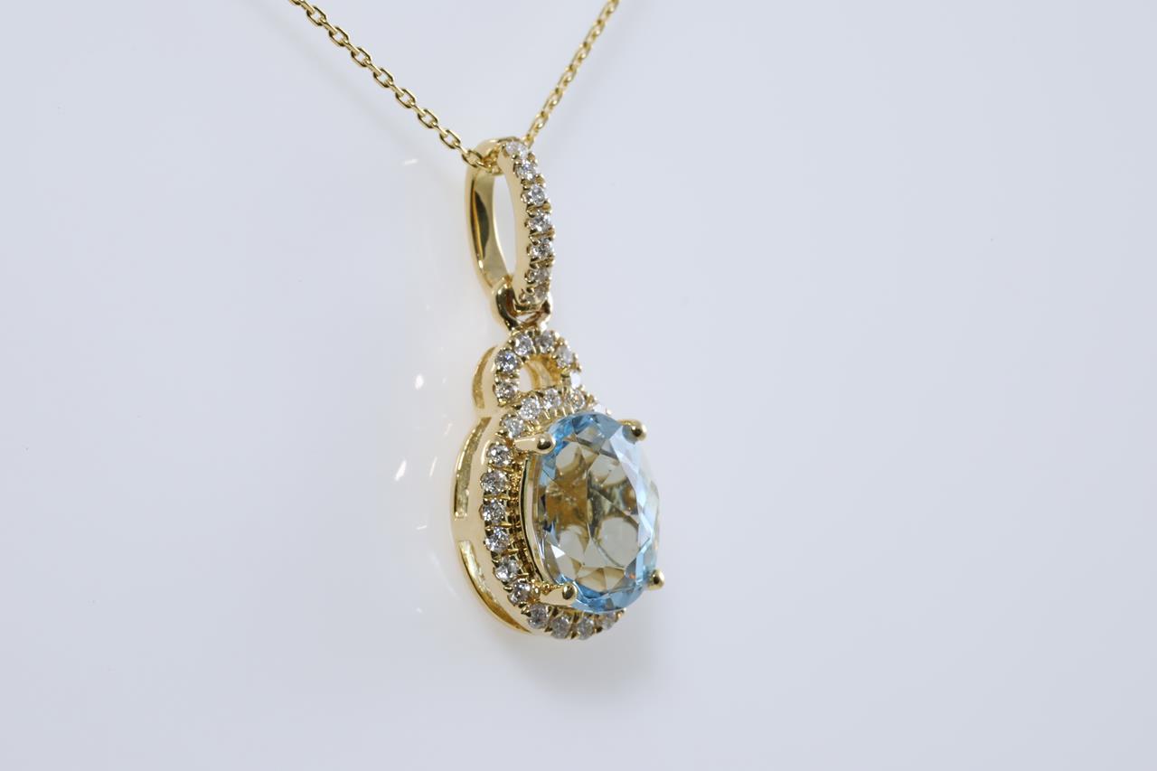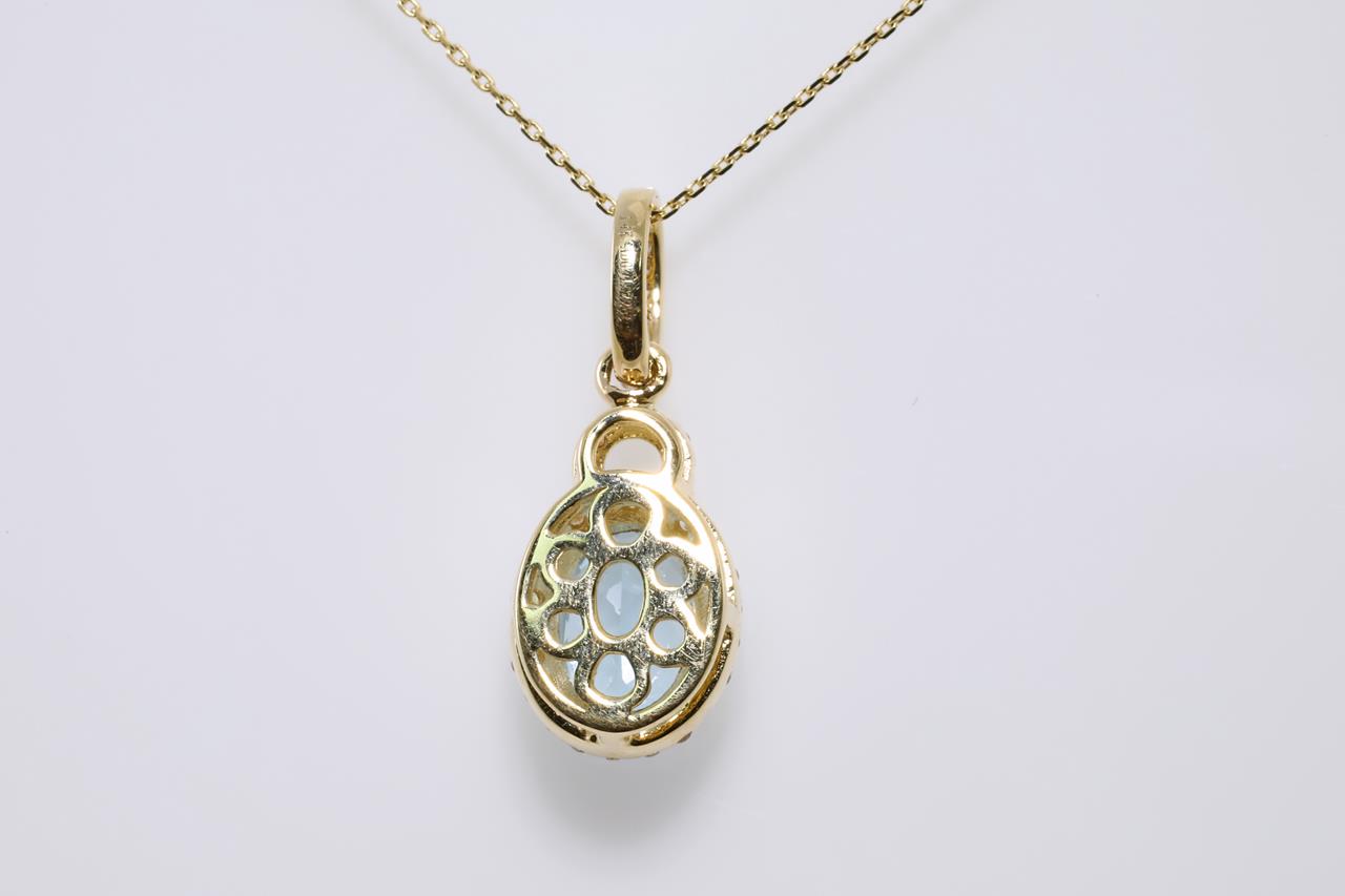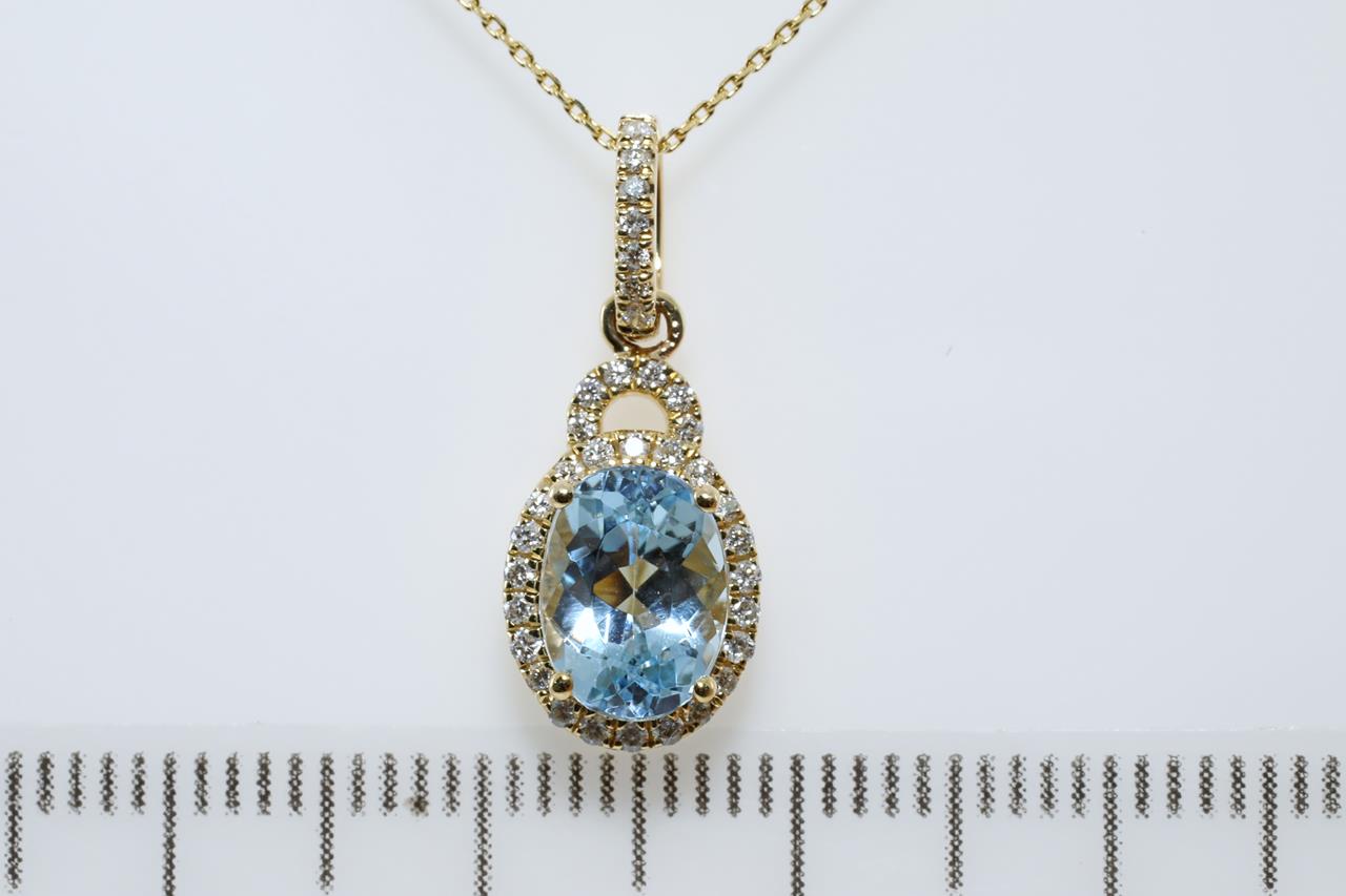 Aquamarine and Diamond pendant with an oval Aquamarine of 1.22ct and Diamonds totalling 0.15cts. 14ct yellow gold with 45cm 14ct chain. Weight: 2.3g. (New)