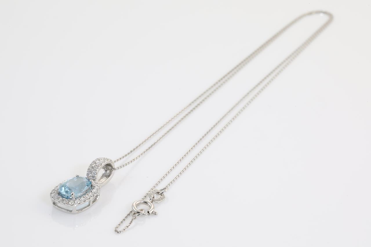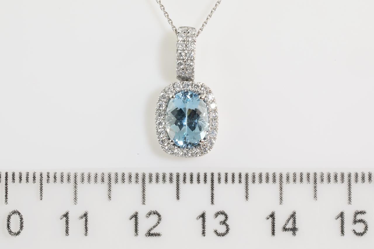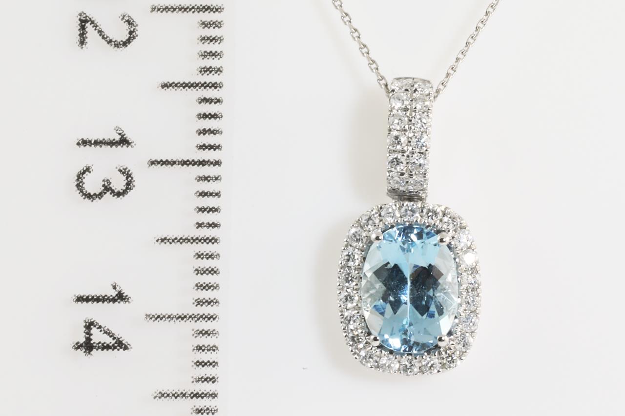 Aquamarine and Diamond pendant with oval shape Aquamarine of 1.16cts and round Diamonds totalling 0.25cts. 14ct white gold with 14ct gold, 45cm chain. Weight: 2.3g (New).