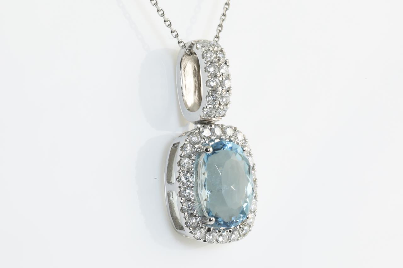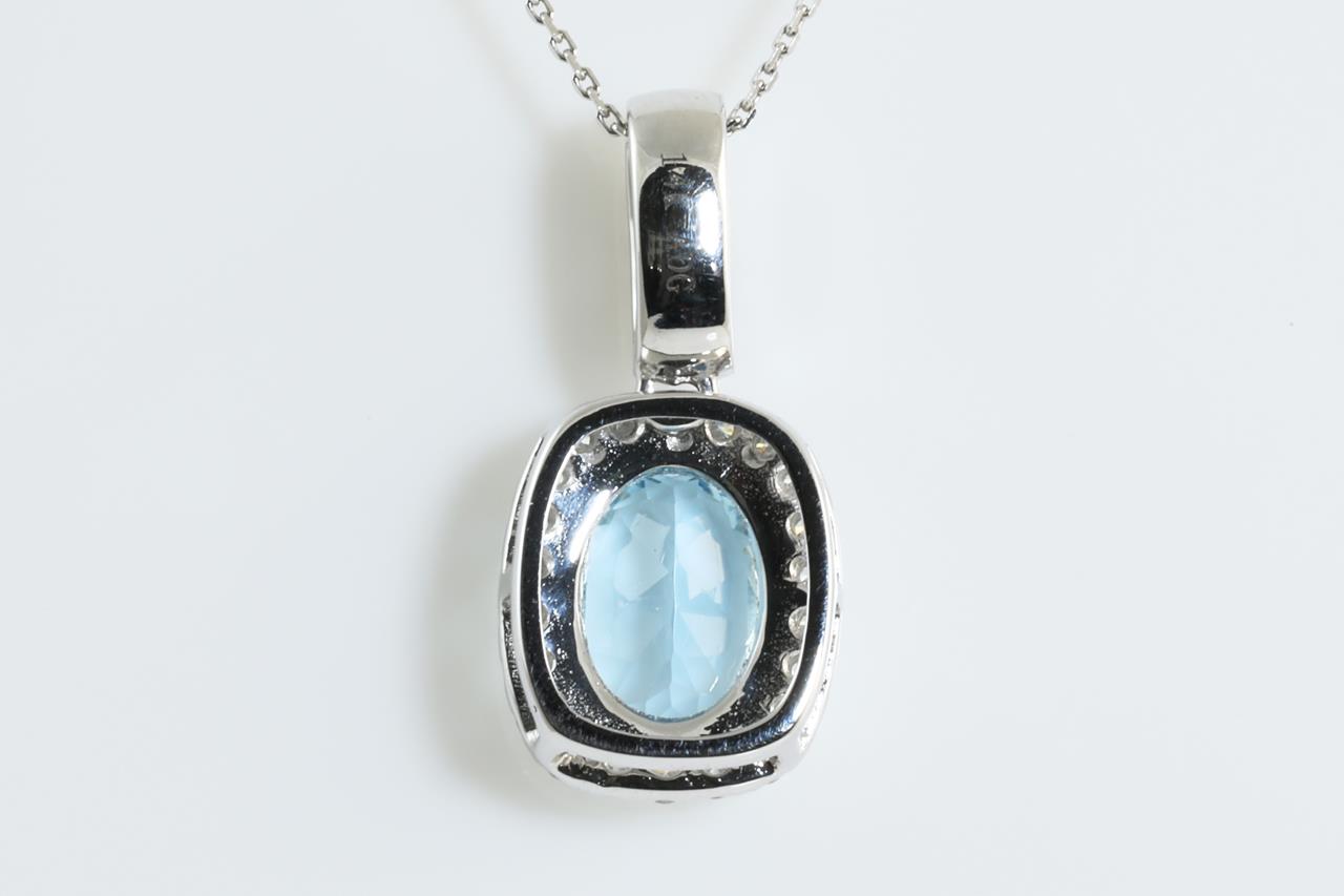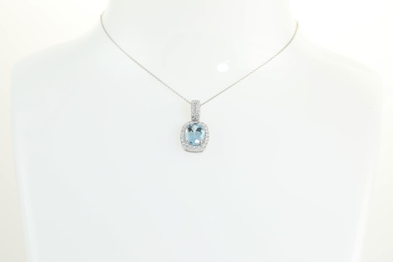 Aquamarine and Diamond pendant with oval shape Aquamarine of 1.16cts and round Diamonds totalling 0.25cts. 14ct white gold with 14ct gold, 45cm chain. Weight: 2.3g (New).