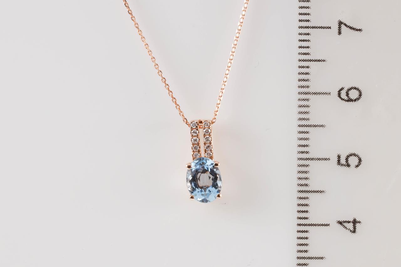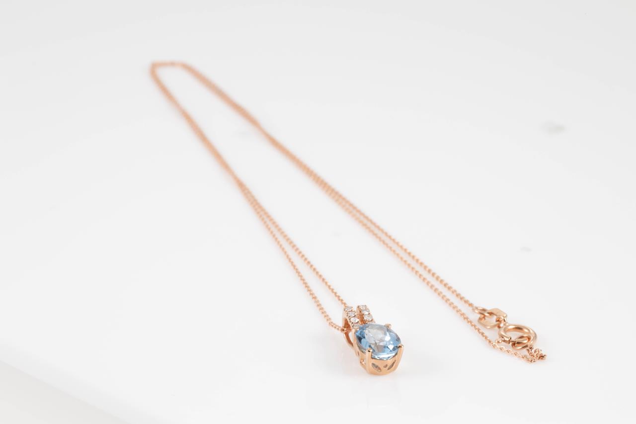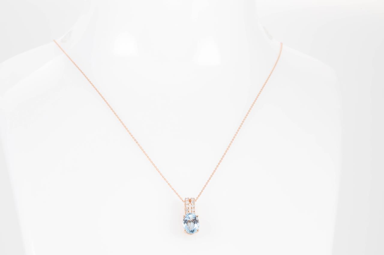 Aquamarine and Diamond pendant with oval shape Aquamarine of 0.82ct and round Diamonds totalling 0.04cts. 14ct rose gold with 45cm 14ct gold chain. Weight: 1.6g (New).